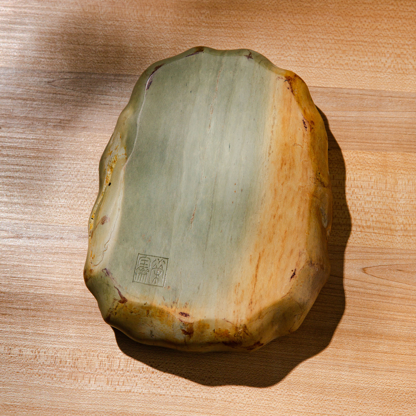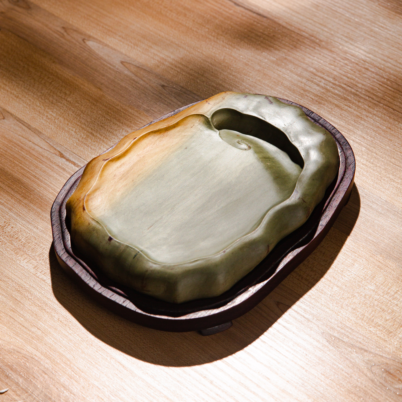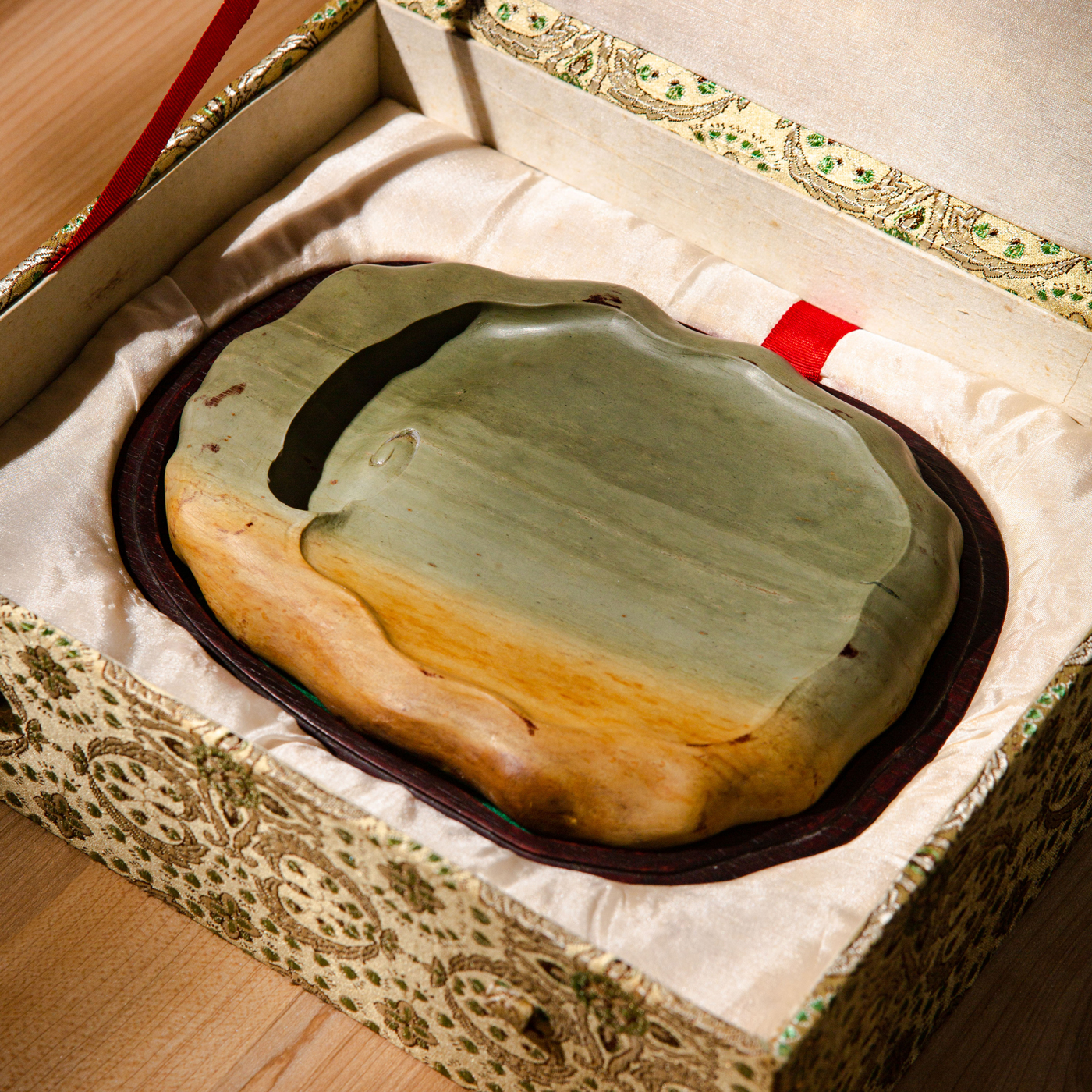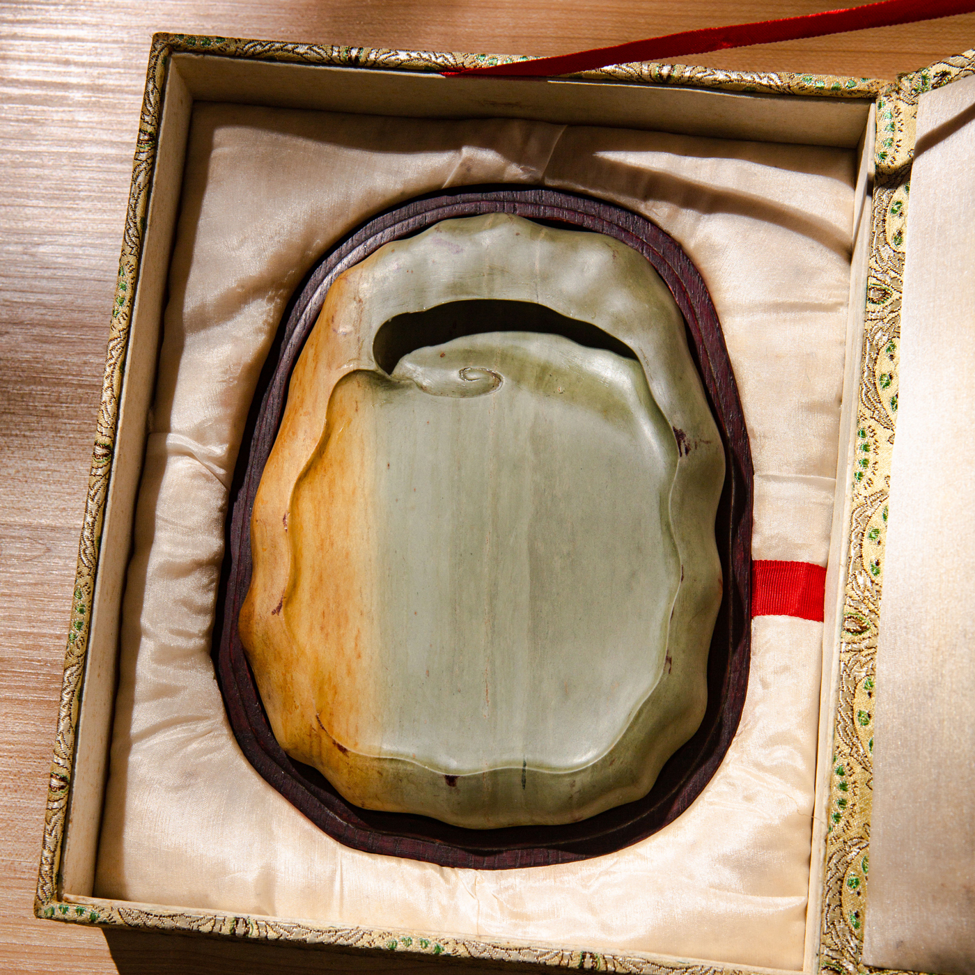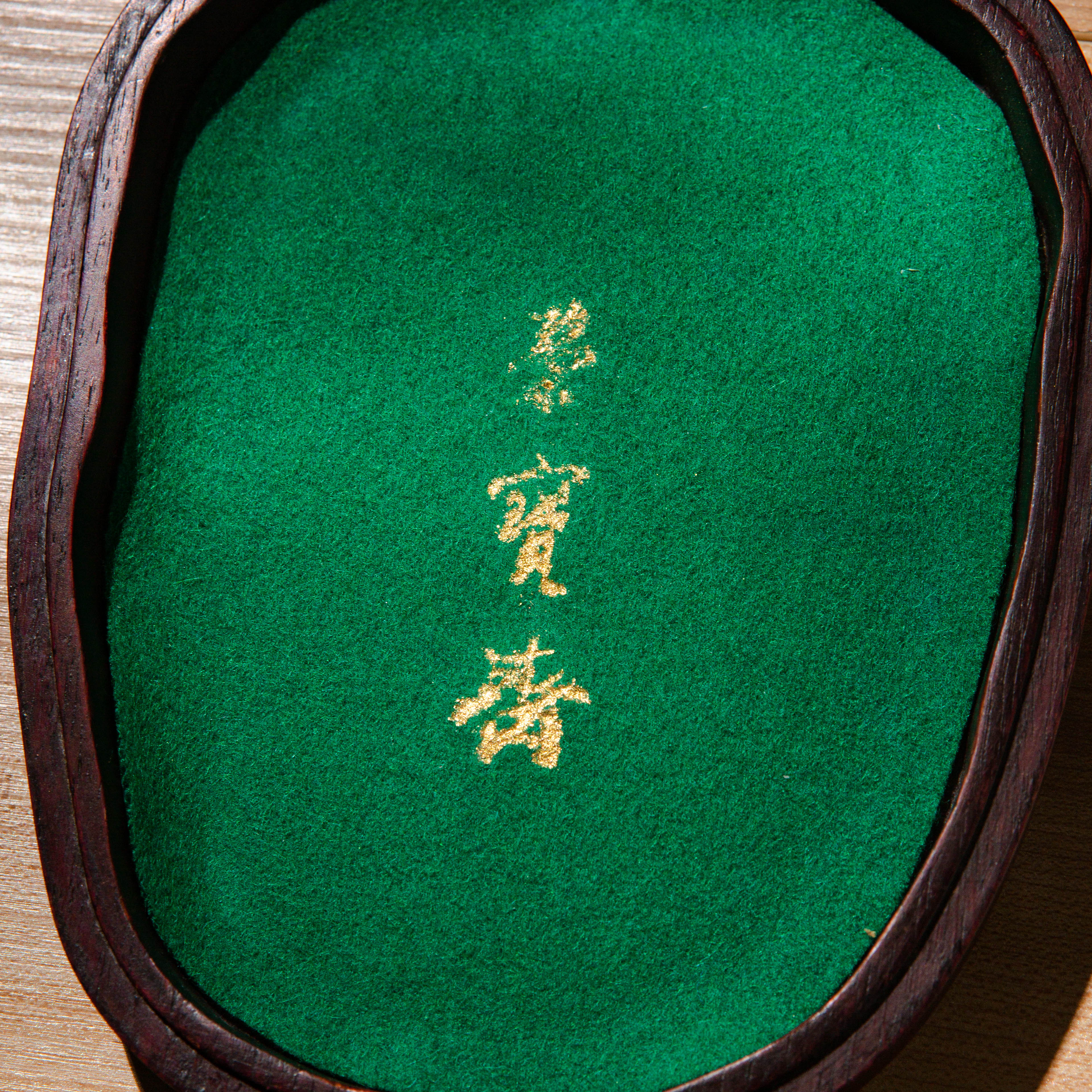 70-80年代荣宝斋定制绿端砚,质地温润细腻,颜色秀美,雕工古朴,包装精致。