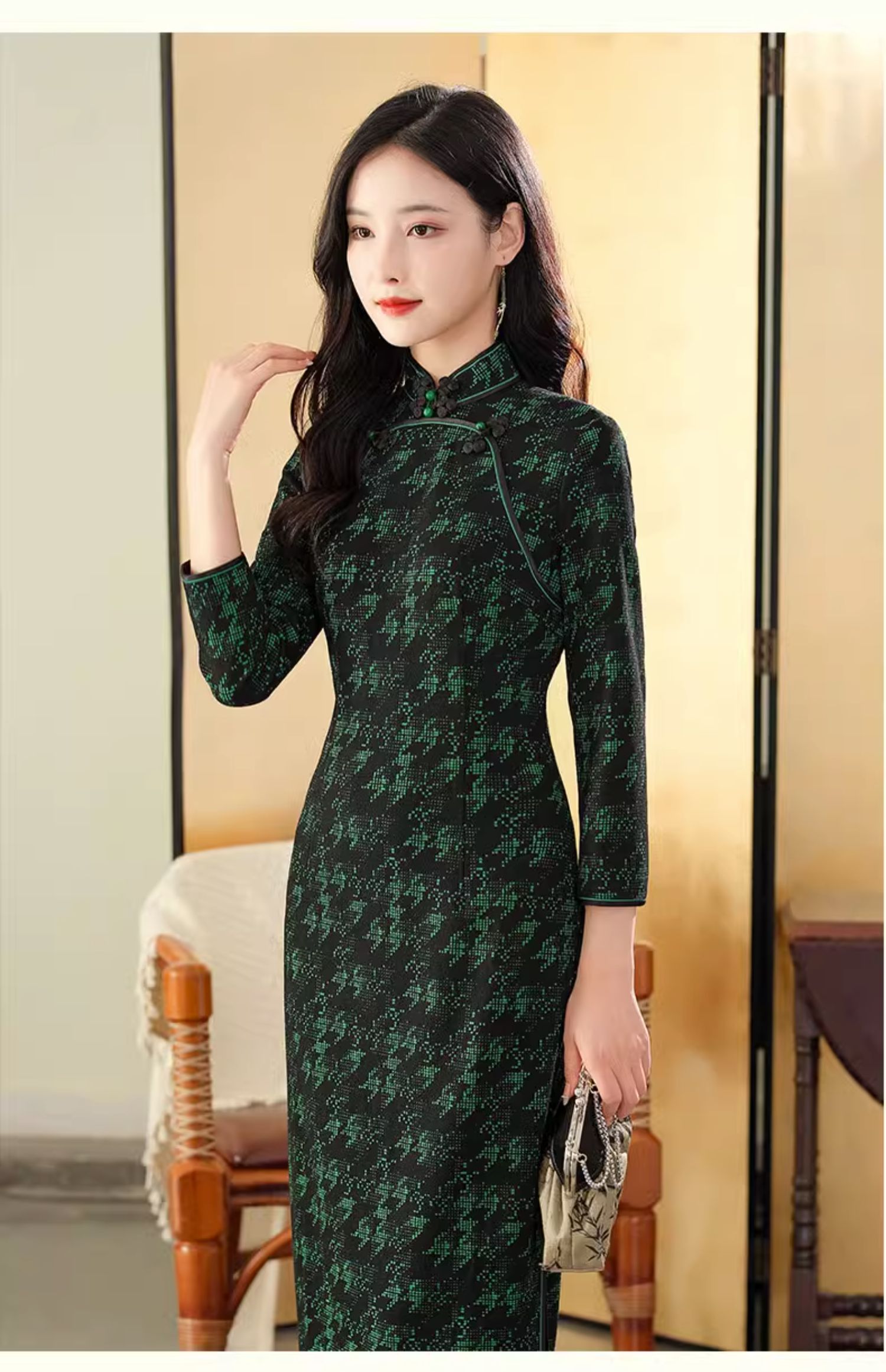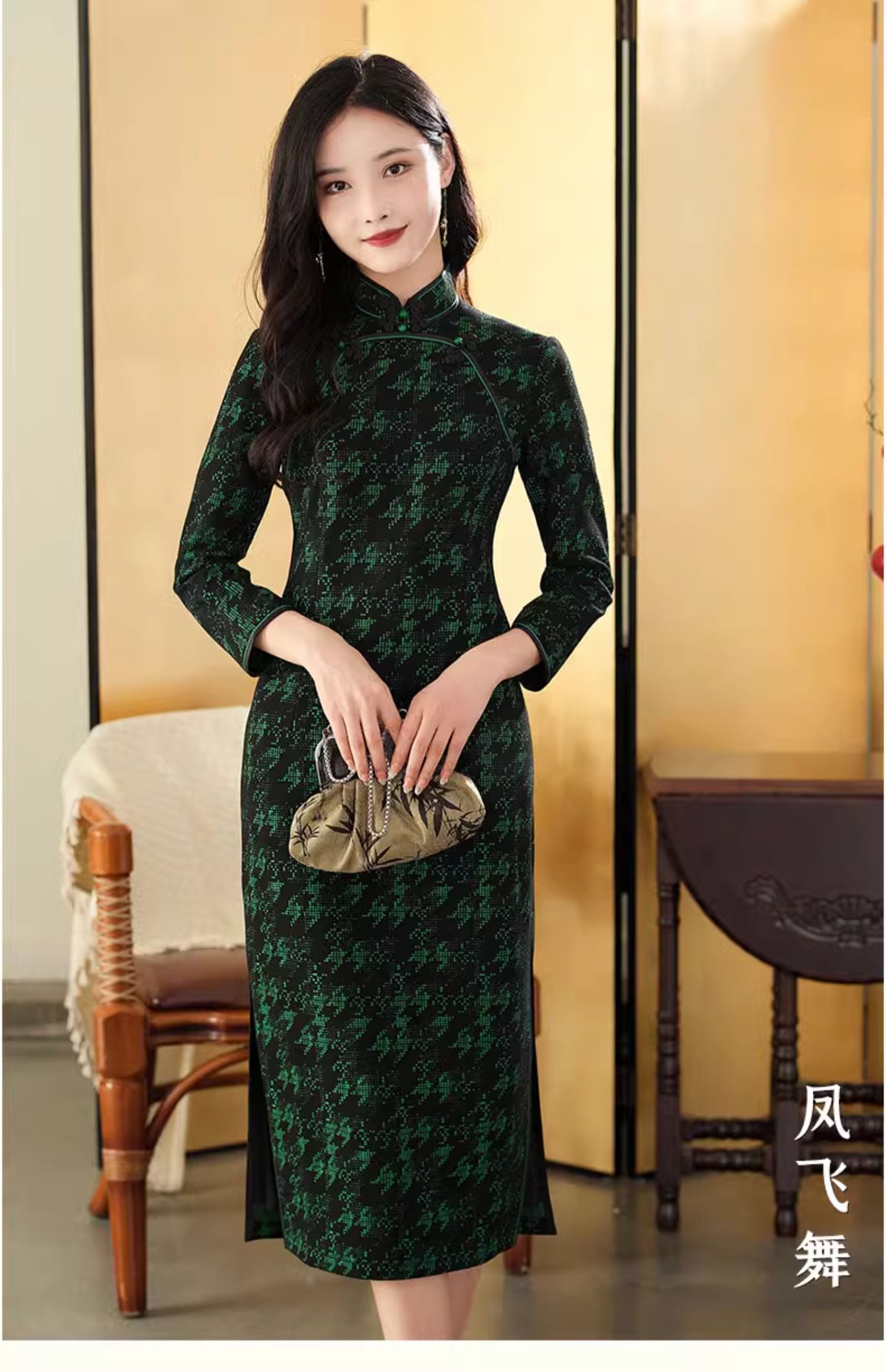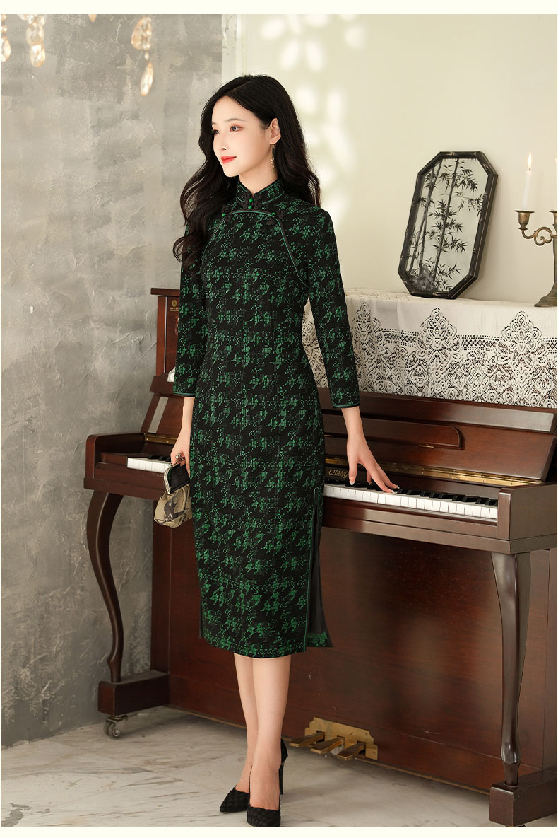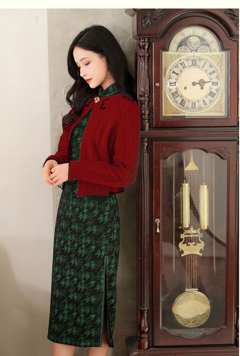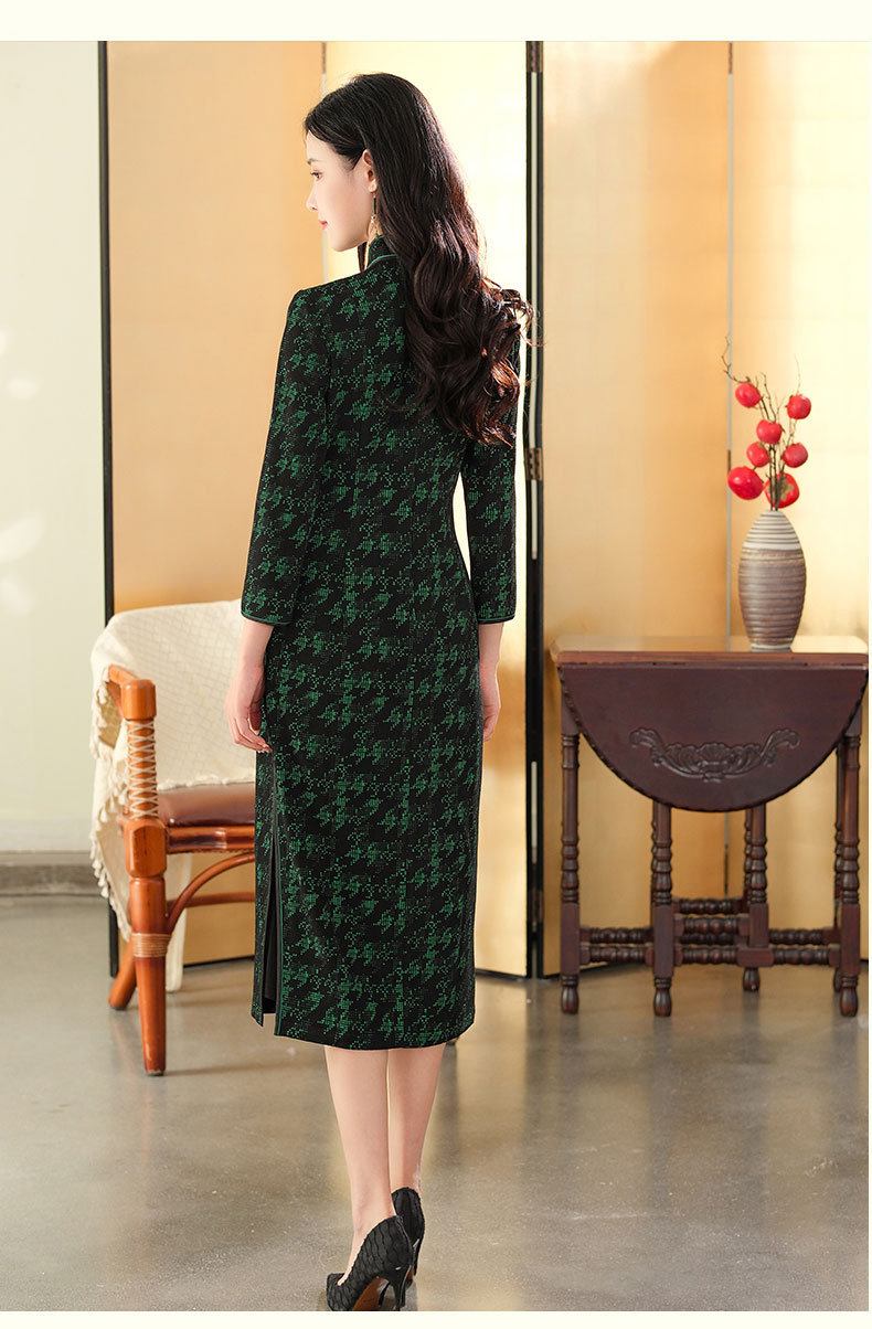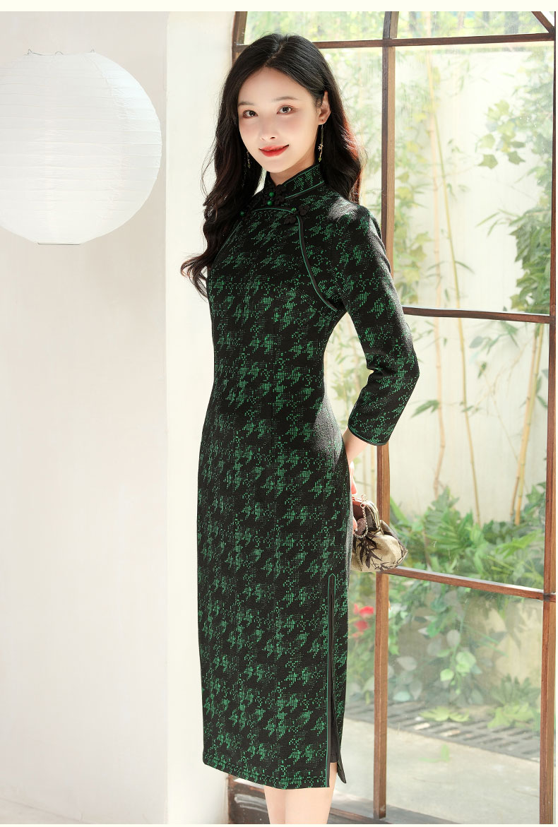 上海逸红颜 凤飞舞 2025秋冬款弹力针织千鸟格书香气旗袍中式礼服