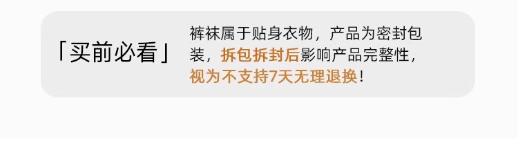 裤袜属于贴身衣服,产品为密封包装,拆包拆封后影响产品完整性,视为不支持7天无理由退货!