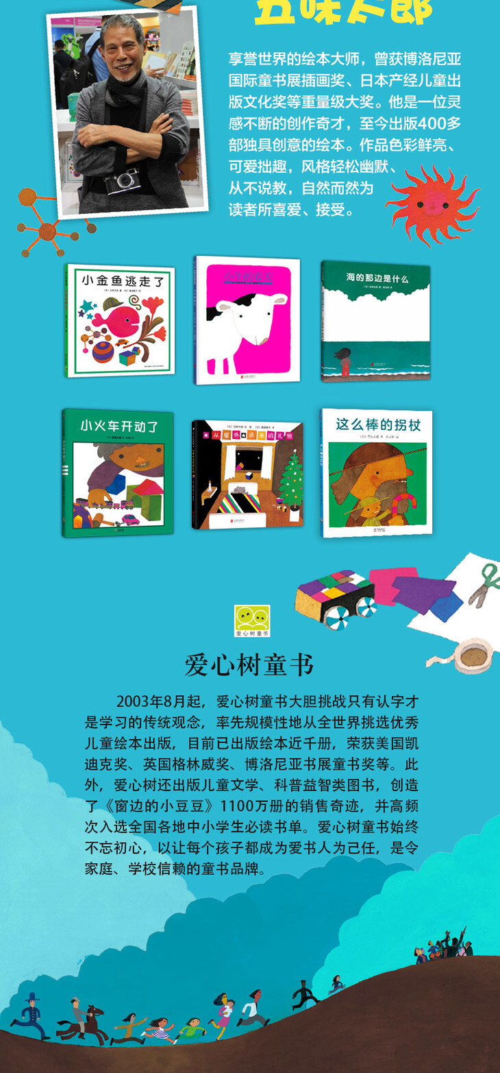 五味太郎50%》等。作品在日本***畅销,多部创下重印上百次的记录。同时,许多作品被数十个国家引进,积累了全世界范围内、各年龄层的广大忠实读者。小金鱼、鳄鱼和牙刷等绘本形象风靡、深入人心。曾获得博洛尼亚***童书展插画奖、日本产经儿童出版文化奖。