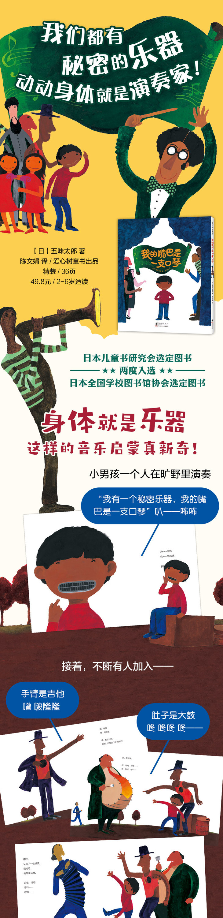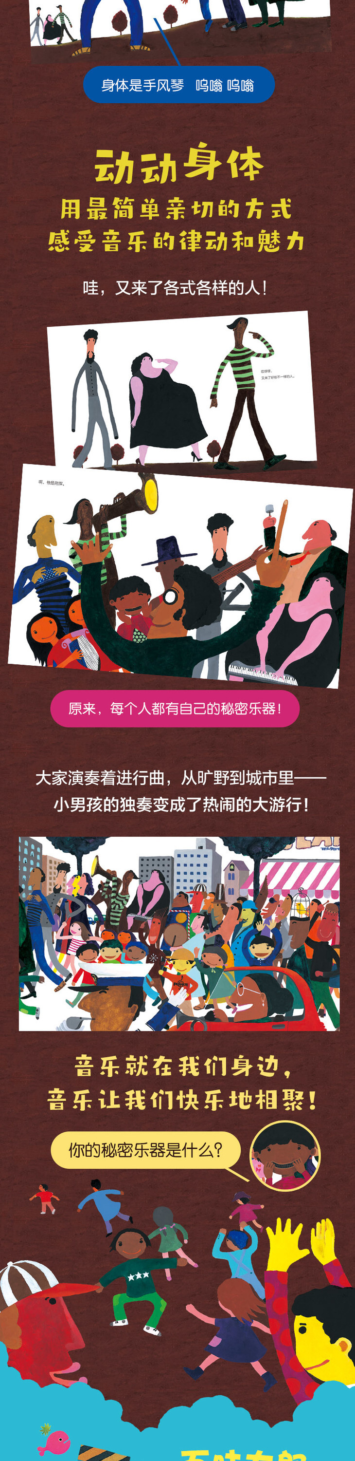 嘴巴是口琴,肚子是大鼓,胳膊是三角铁,脚是喇叭,大家的身体都变成了乐器,聚在一起开音乐会。五味太郎用人们的各种体态和动作模拟多种多样的乐器,让孩子在丰富的联想和肢体的摇摆中,亲身体验演奏乐器的乐趣。音乐也因此充满了亲和力,从室内走到大街上,让人们快乐地相聚。