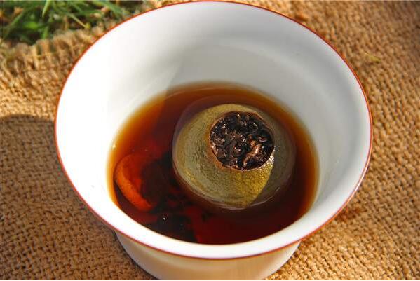 将青柑仔填茶口的盖皮掀开,再将整粒青柑仔连同盖皮直接投入杯或壶中,加沸水冲泡,再等柑皮和普洱茶中的物质慢慢溶出,汤色呈深金黄色时即可。