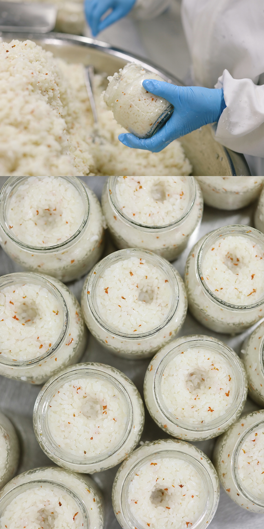 而市面上大部分的酒酿,都选择大桶发酵后,先发酵后打散灌装。这样的做法,酒酿米含量就会减少,降低了成本,但打散后再灌装,香气被牺牲,液体部分浑浊,米也松散没有嚼劲,口感变得一般。
