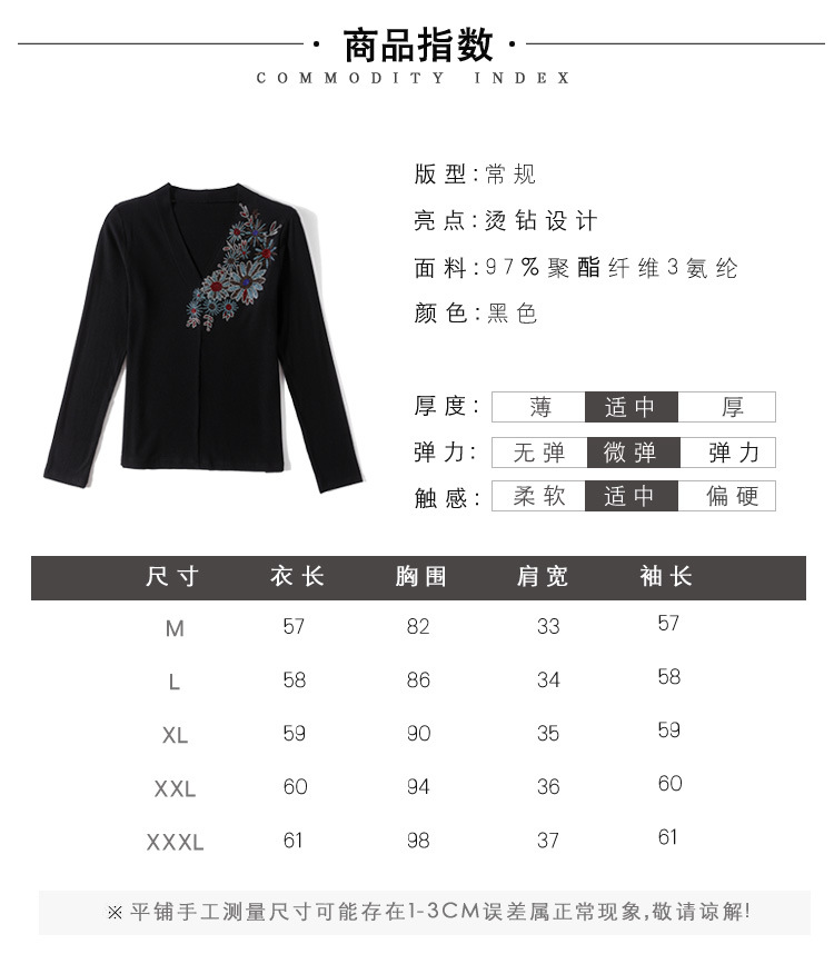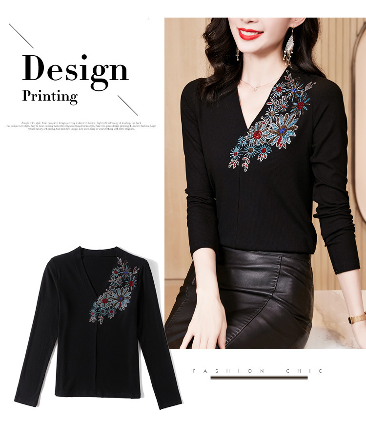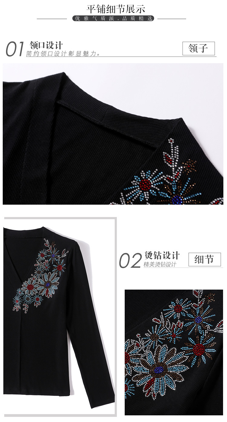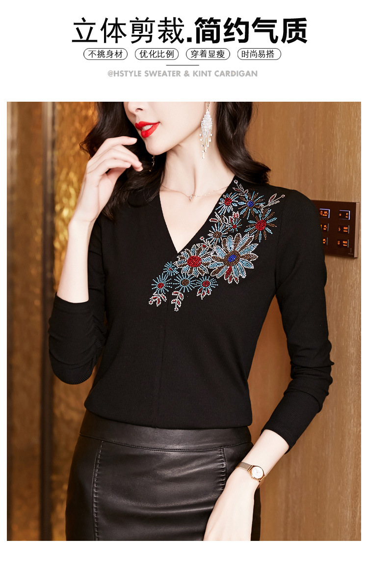 SMZ10075秋装新款V领打底衫女长袖T恤气质修身显瘦花朵烫钻黑色套头上衣潮