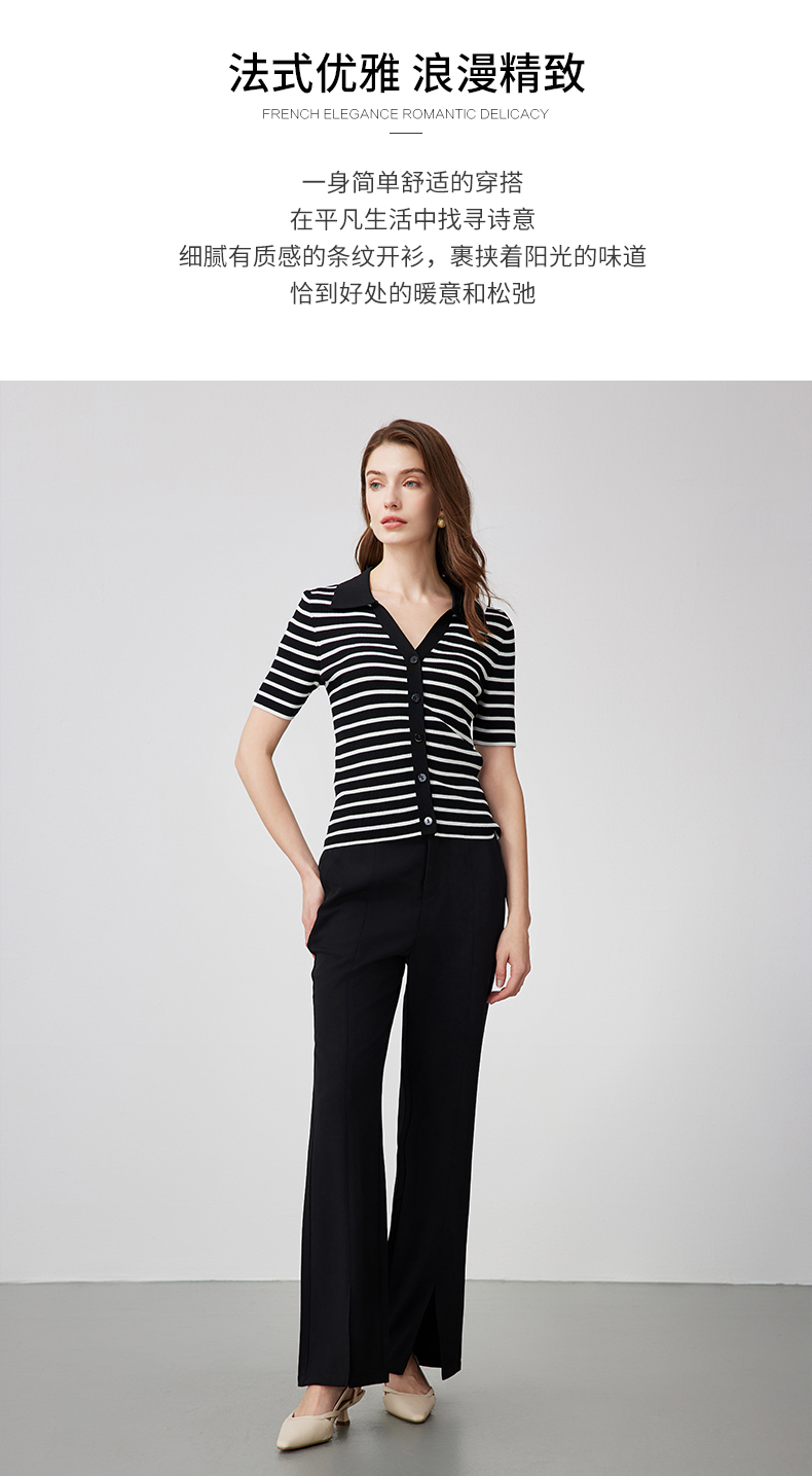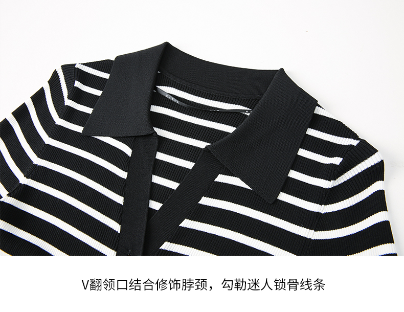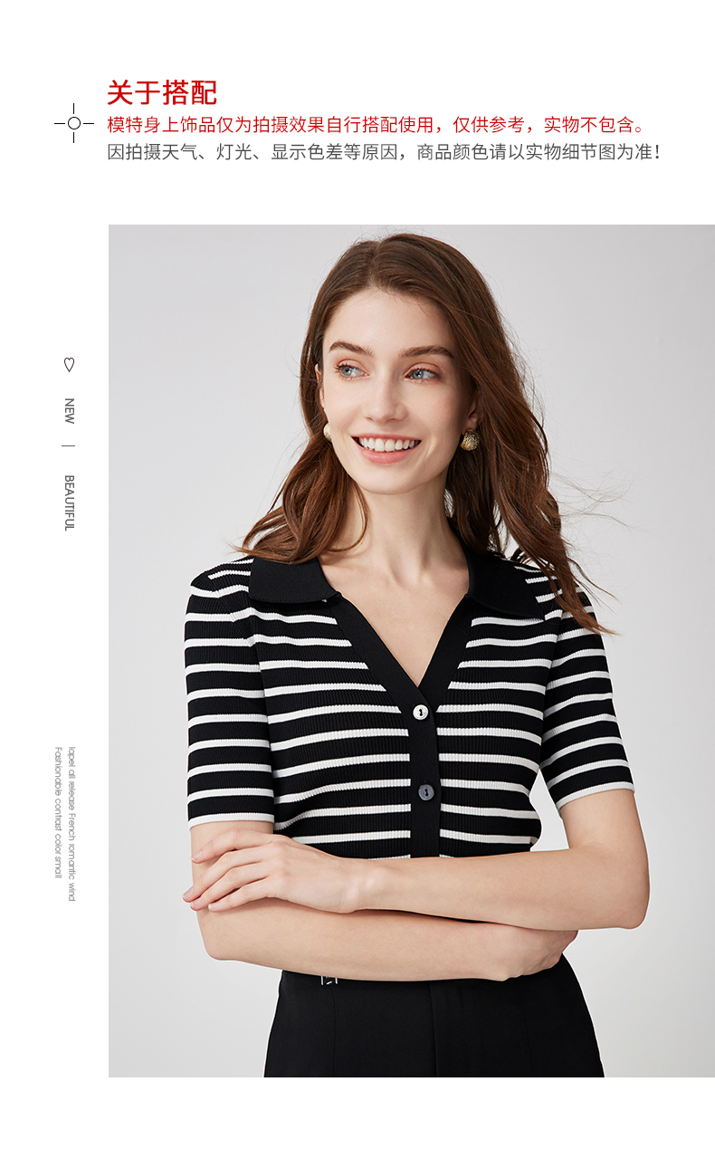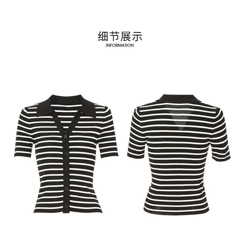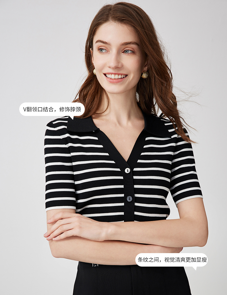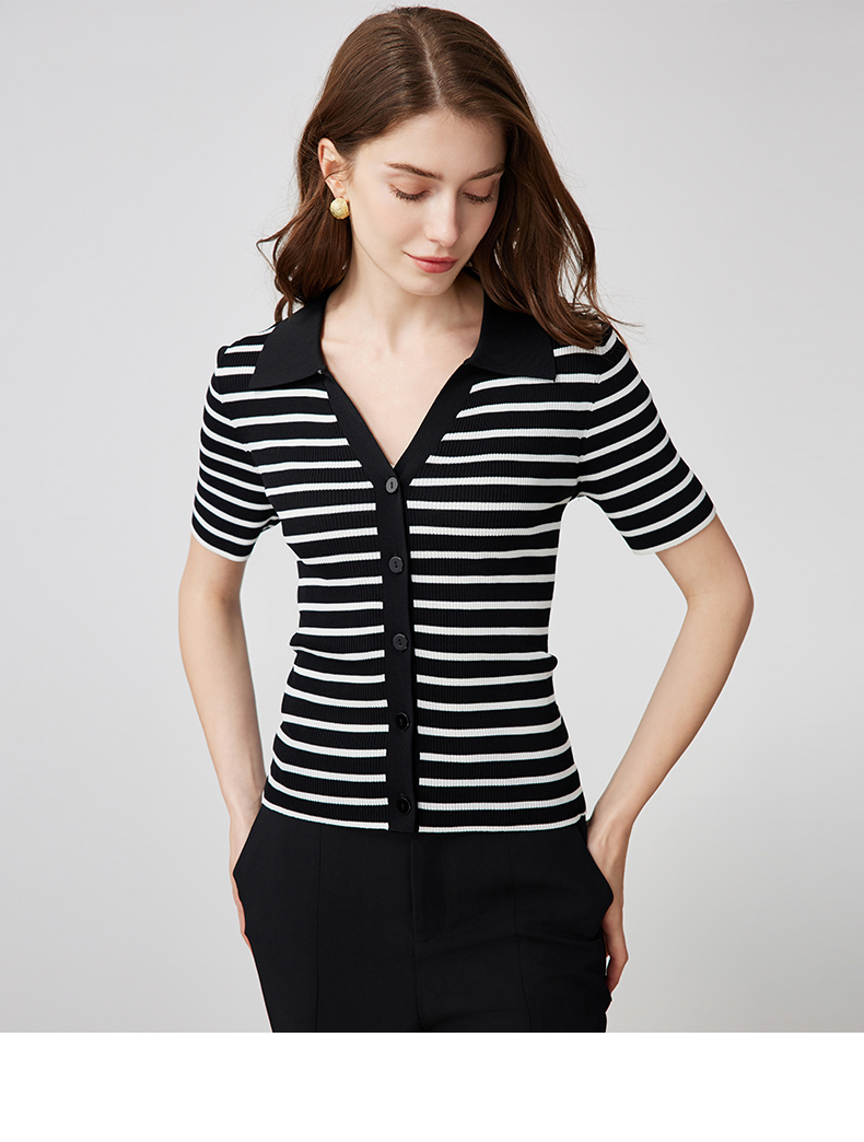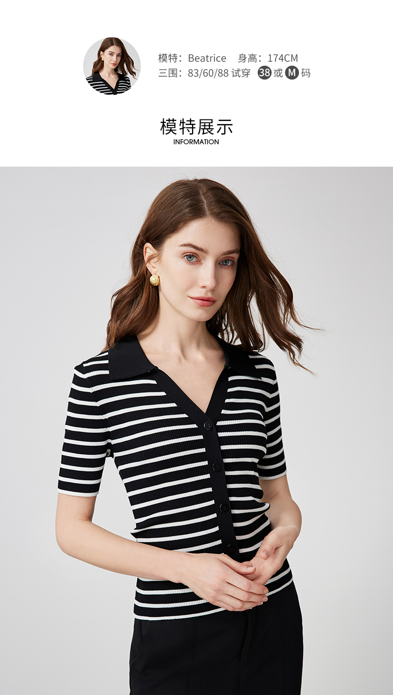 EITIE爱特爱修身显瘦黑白条纹翻领气质百搭针织衫上衣夏新款B2401306针织衫