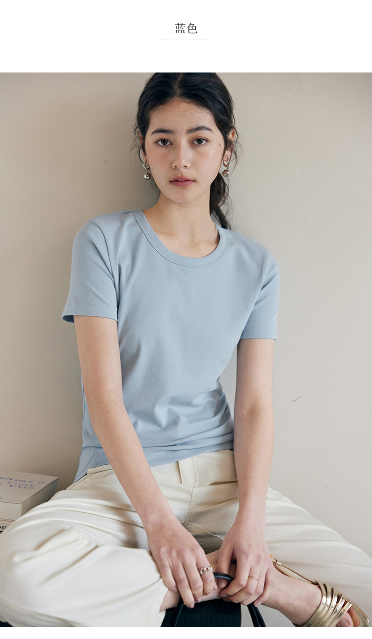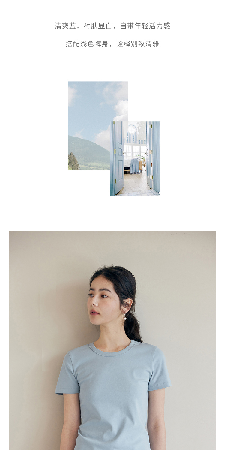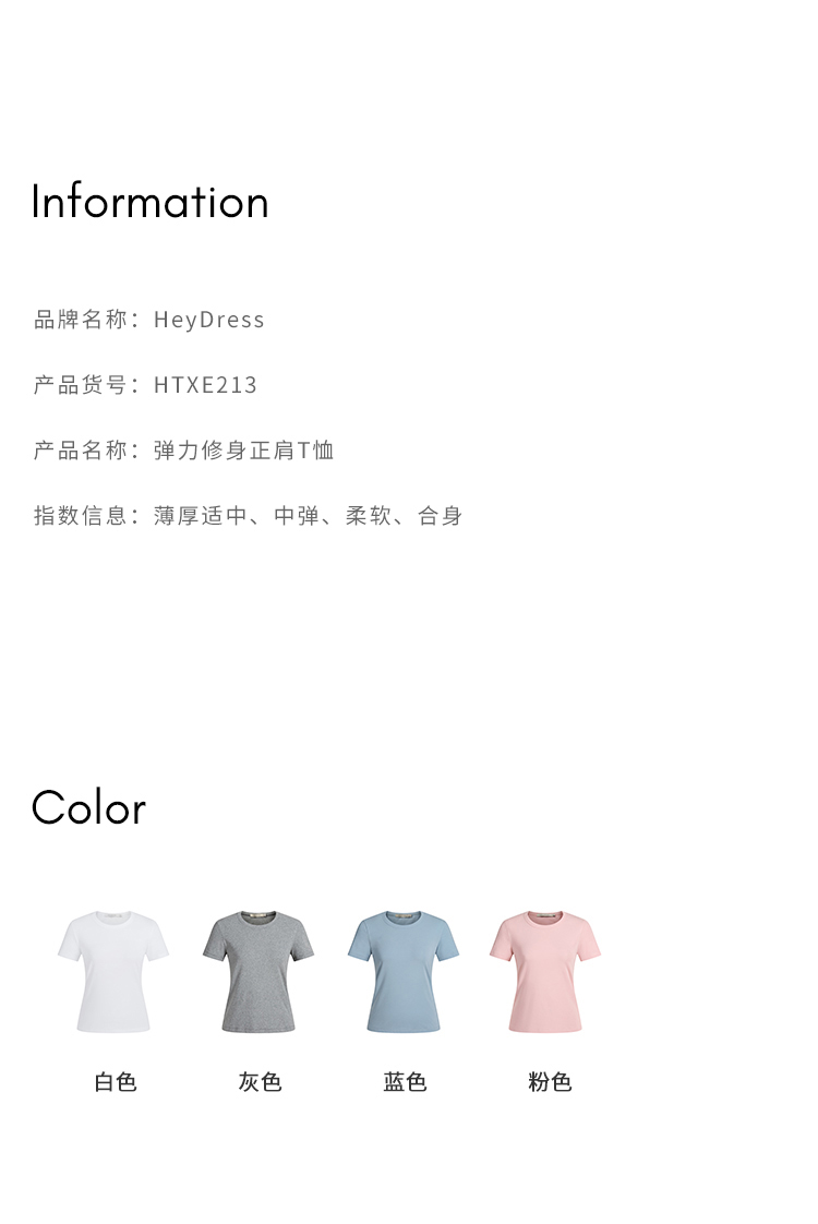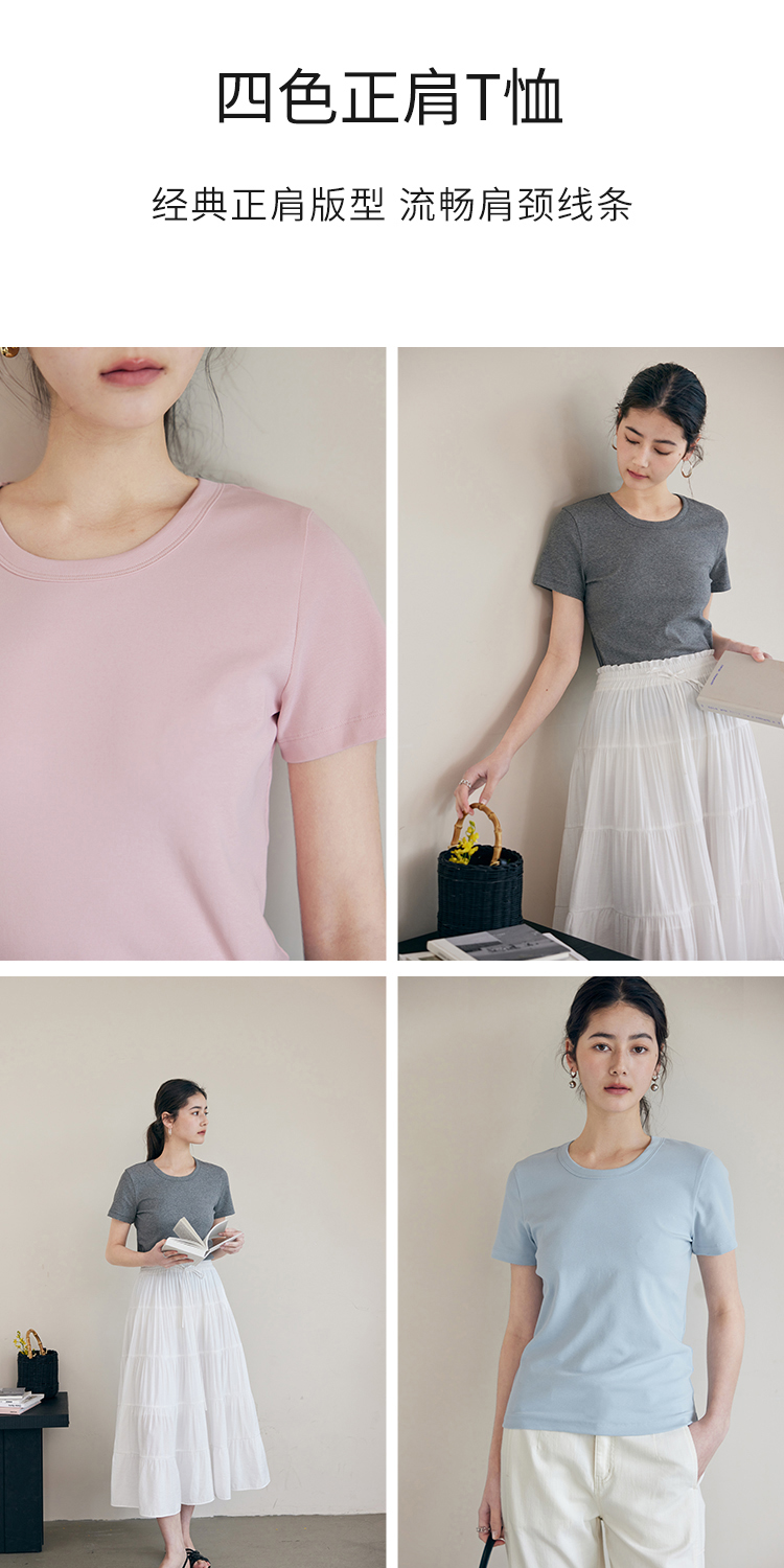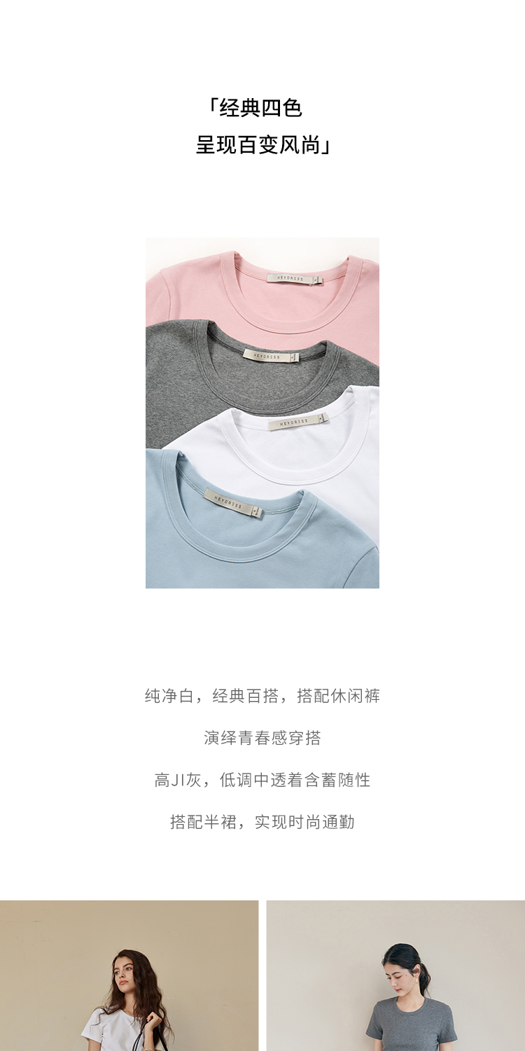 HeyDress纯色正肩T恤女夏季圆领修身弹力百搭半袖舒适感短袖上衣