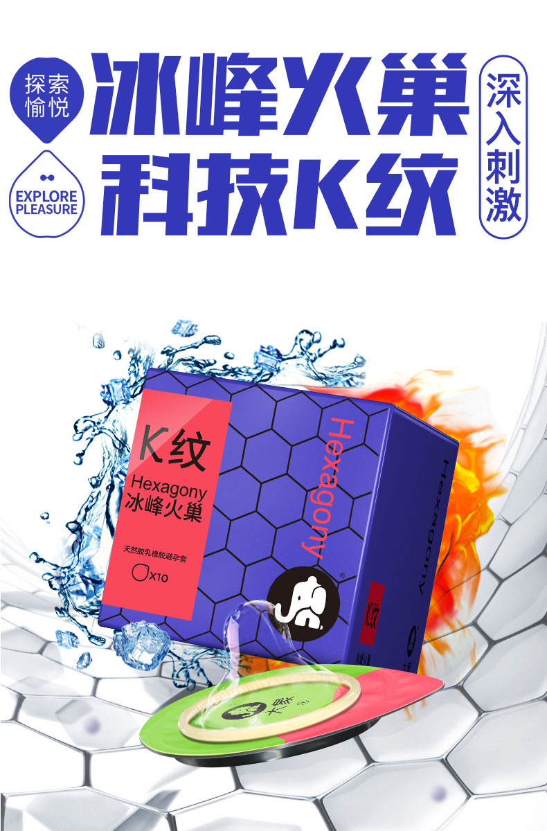 【冰火+K纹】大象情趣系列避孕安全套 冰峰火巢K纹款10只装