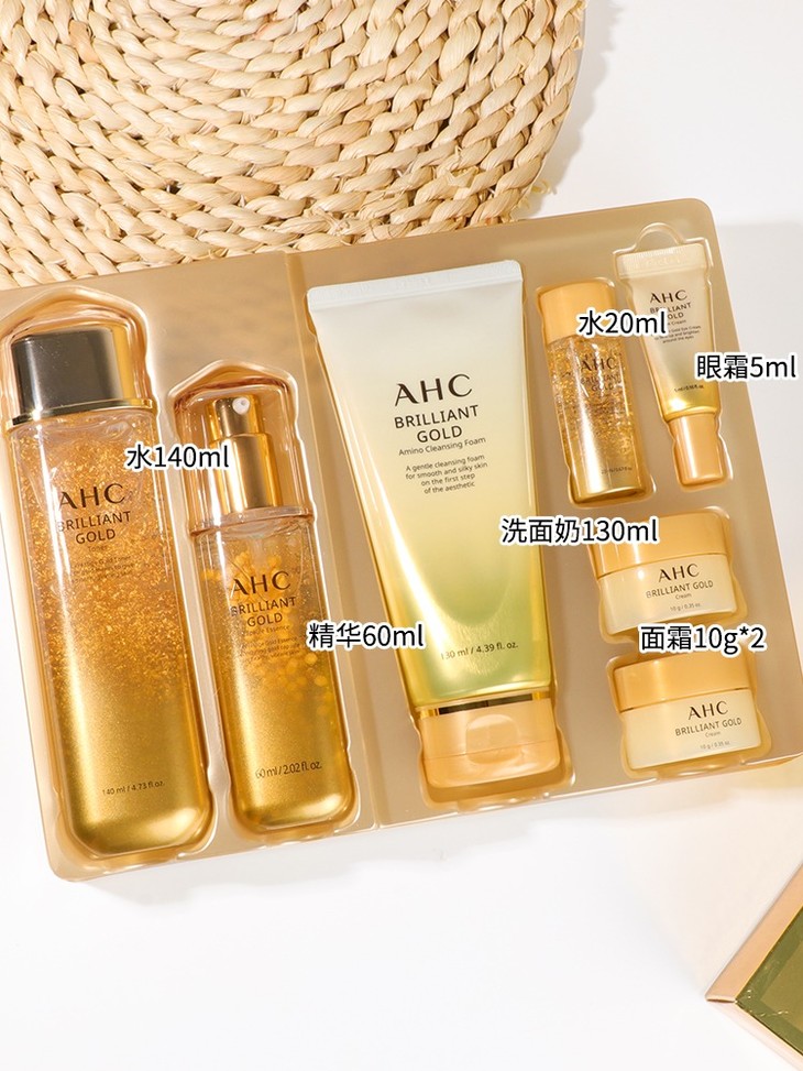 AHC黄金三件套👍护肤界的“土豪金”💛,AHC黄金玻尿酸蜗牛精华套盒是AHC家的高端系列🔝,比玻尿酸系列套盒还高一等级,具有吸附自由基抗氧化👊的功效和稳定的特性😊。👑植物蜗牛精华、黄金玻尿酸这些护肤界的“精粹”聚集在一起的时候🍇能全面改善肌肤糟糕的状况了,比如毛孔粗大、肌肤暗黄😻、斑纹皱纹、皮肤下垂等还包括修复红血丝受损肌肤这些都能搞定~ 【套装包括】:水140ml+精华60ml+洗面奶130ml+水20ml+眼霜5ml+面霜10g*2