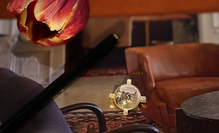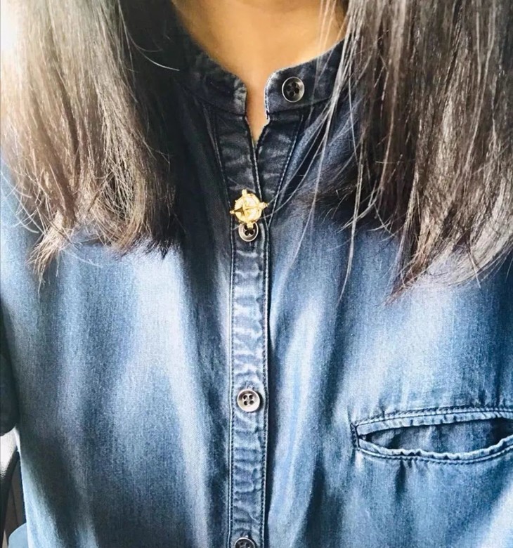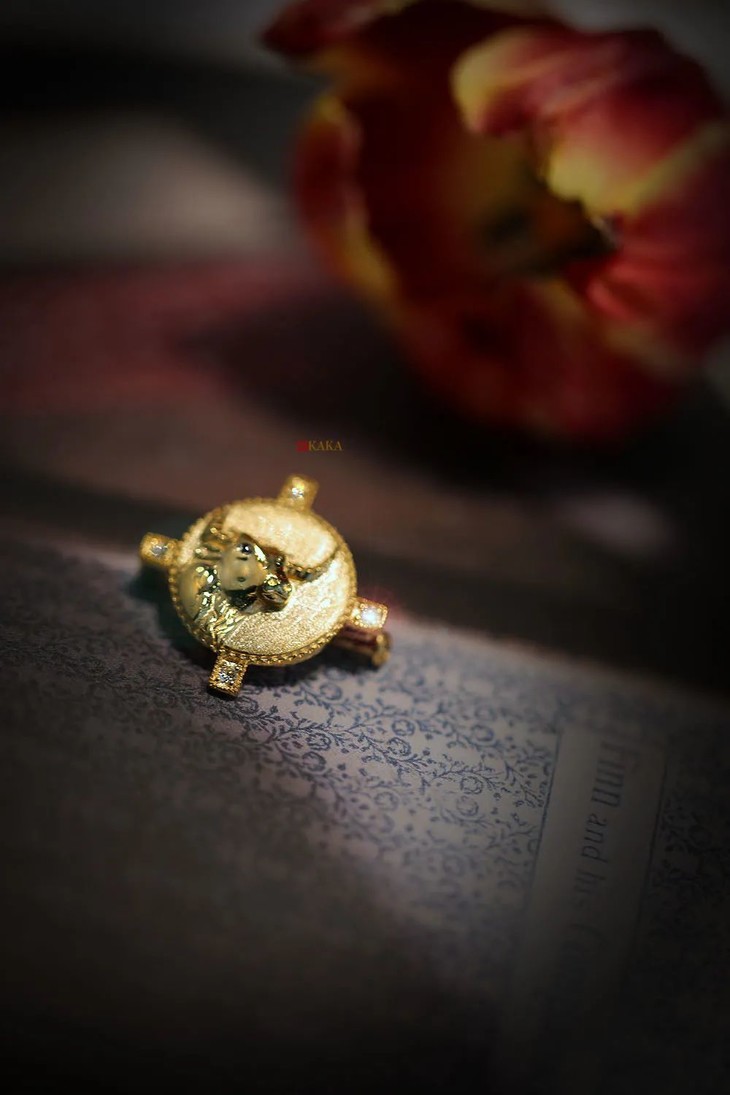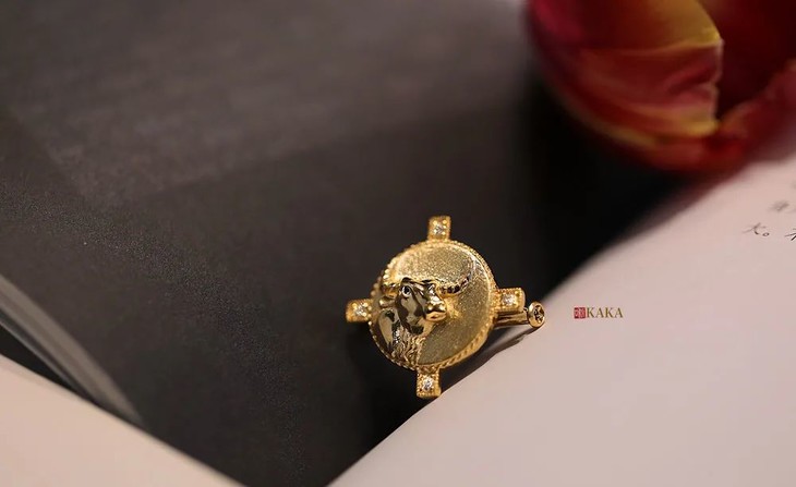牛徽章于年末成为徽章的最后一班车定制,为了让春节前的牛牛们用上它。牛的形象我画了一个坚韧的昂首牛形象,带着一点点倔,眼神里都是坚定,表情又很平和,符合我心目中牛的形象,善良但也不好惹,温柔却又很坚持。18k黄金浮雕牛首,复古露珠钉镶边,圆形周围,十字突起,