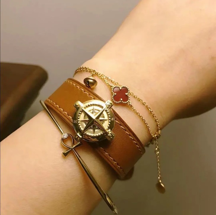(3)手链(扣于顶级小牛皮的腕带上,腕带另购事宜咨询田老师)徽章胸针的玩法很多,可以参考我们往期的生肖徽章和指南针的佩戴照和买家秀噢!