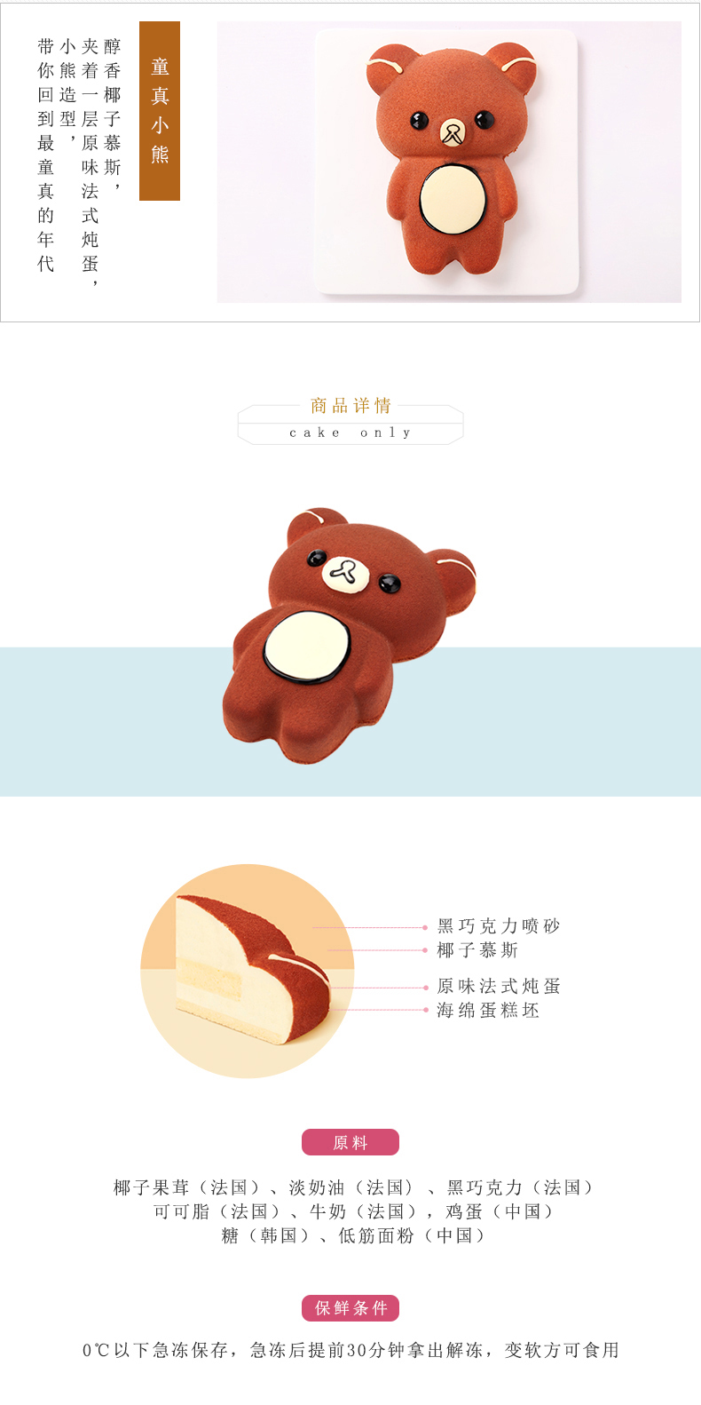 Cake Only采用动物奶油、法国芝士等进口原料,并搭配时令新鲜水果等优质食材,制作出更有层次的法式甜品。通过网络或电话订购,全程冷链配送,目前支持广州/佛山免费送货服务。