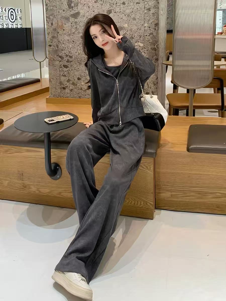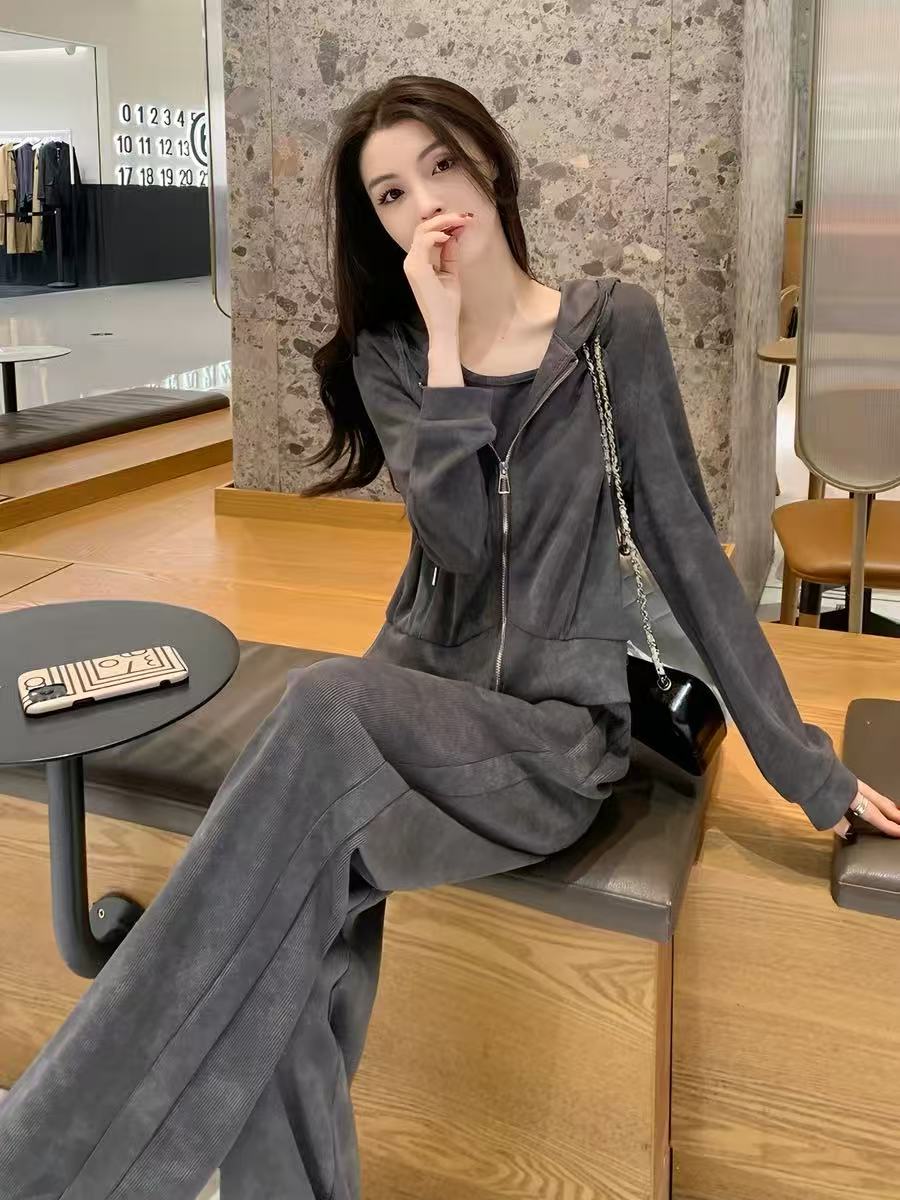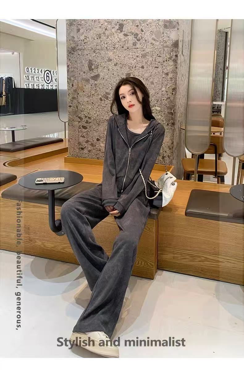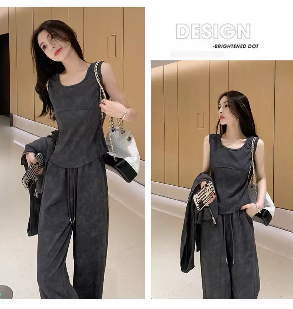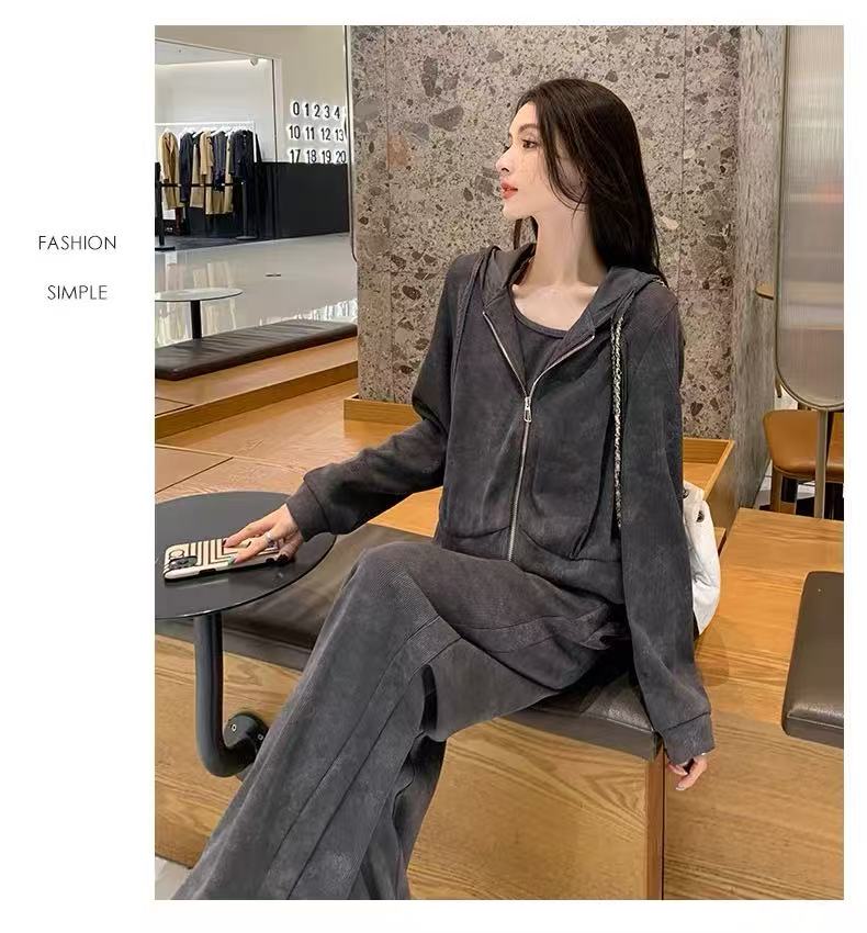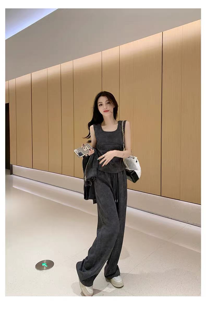 活动爆款【自营】衣周期~(三件套)Q39 灰色休闲外套➕背心➕休闲直筒裤细纹坑条套装-喜出