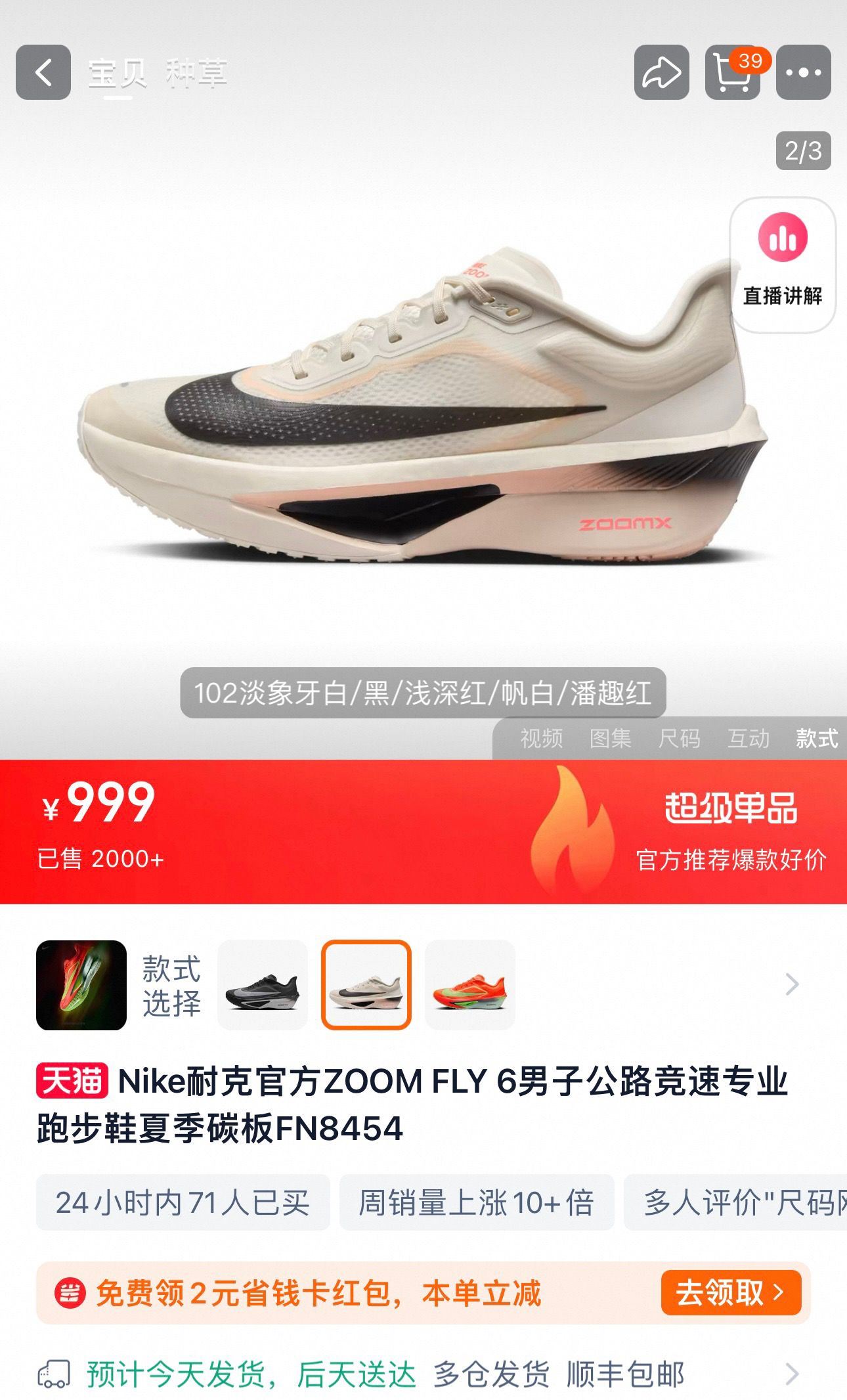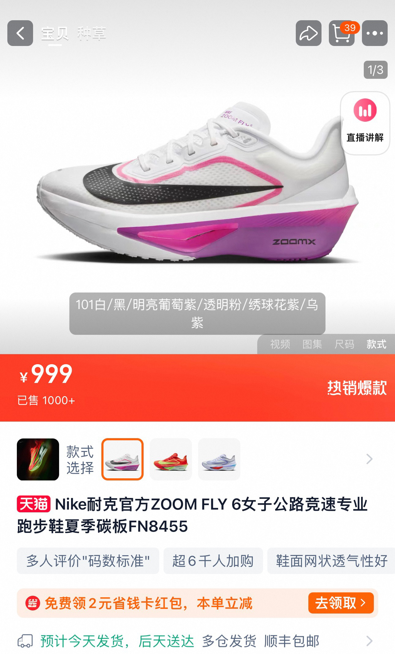 已入库,最高版本 极具性价比,25最新版 NIKE ZOOM FIY6”男女款碳板竞速跑步鞋,亲测上脚非常舒适,日常休闲 运动 跑步 打球 健身 皆可穿!全网最火爆的五个配色,马上开秒🔛
