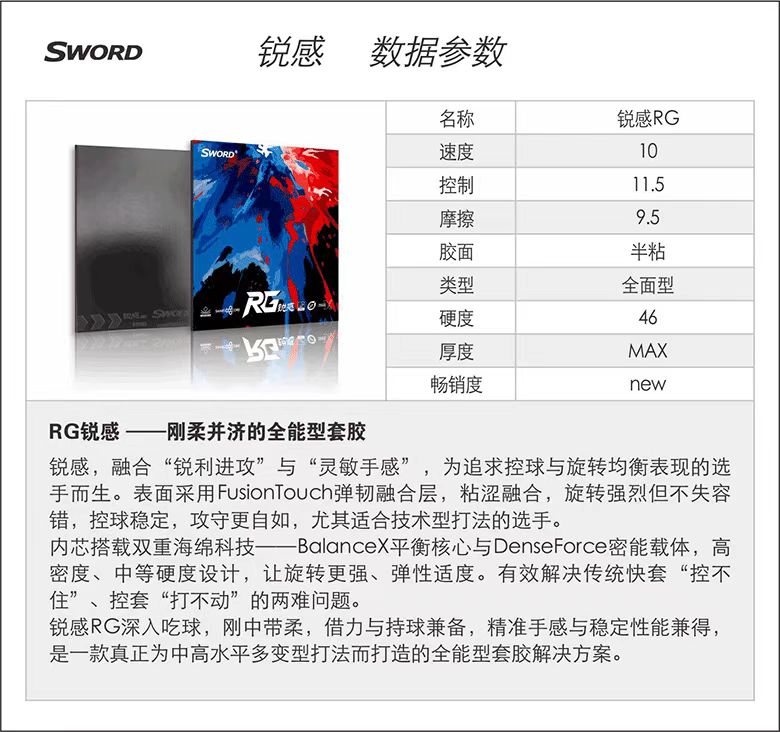 Sword世奥得锐感RG乒乓球胶皮半粘半涩正反手反胶套胶