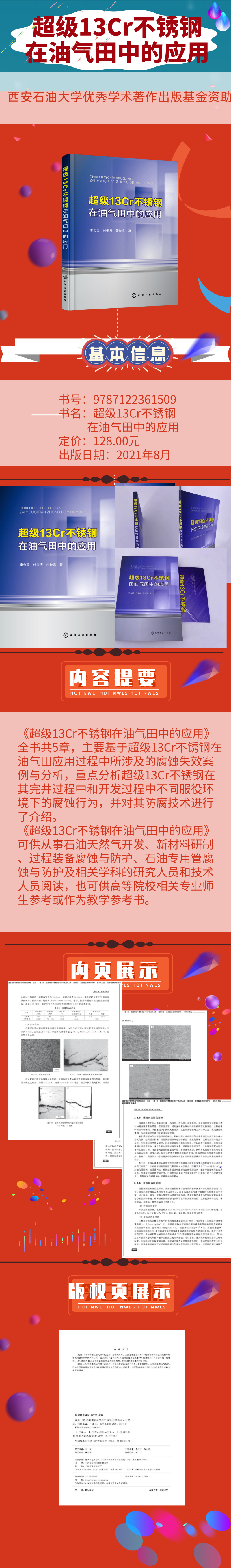 《超级13Cr不锈钢在油气田中的应用》全书共6章,主要基于超级13Cr不锈钢在油气田应用过程中所涉及的腐蚀失效案例与分析,重点分析了超级13Cr不锈钢在完井过程中和开发过程中不同服役环境下的腐蚀、CO2腐蚀和H2S腐蚀等腐蚀行为及其影响因素,并对其防腐技术进行了介绍。