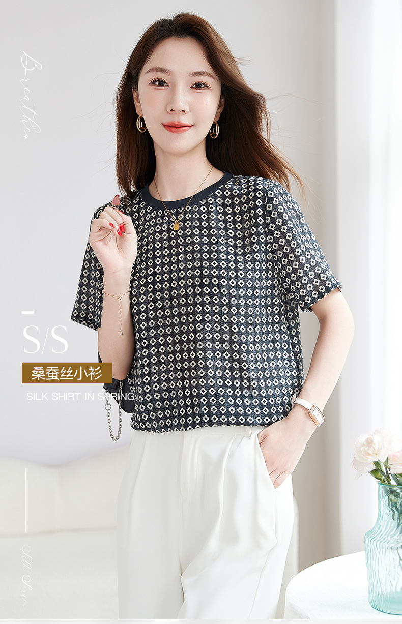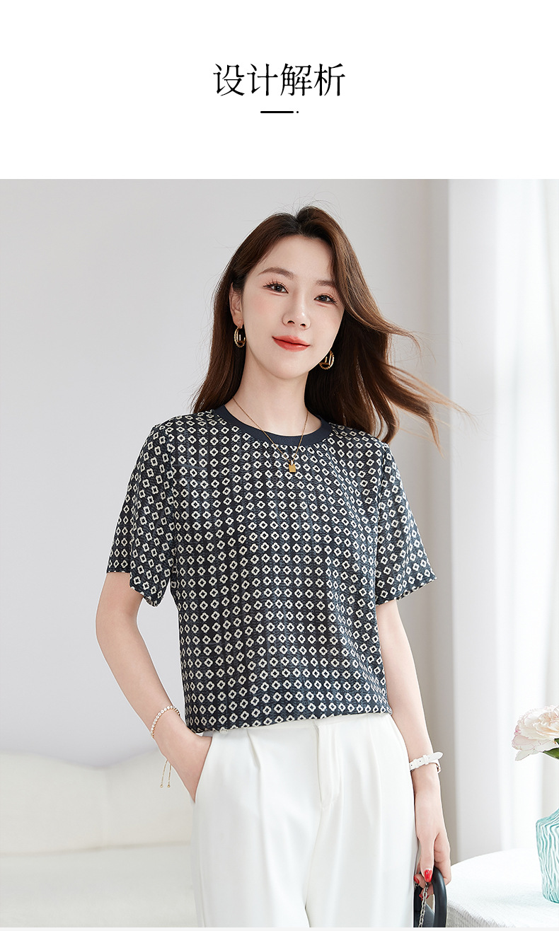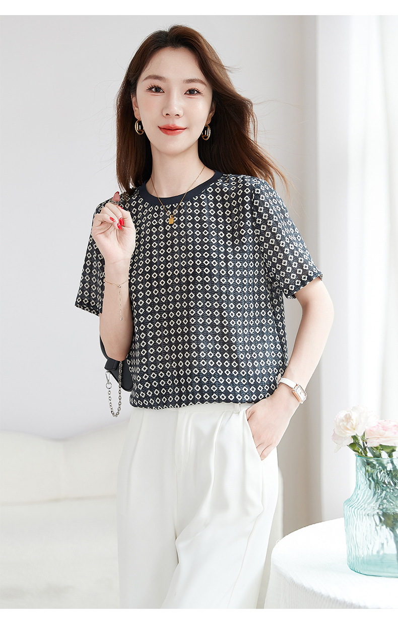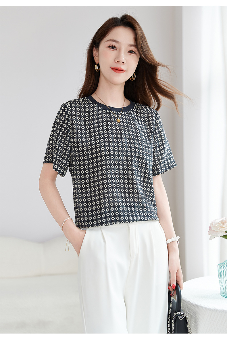 QS-12501717【经典百搭】100%桑蚕丝圆领短袖打底衫夏季格纹真丝T恤女1717