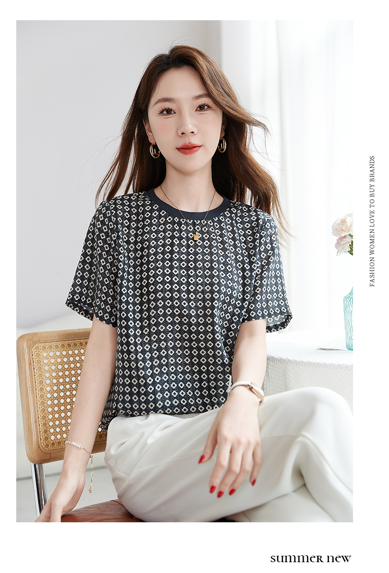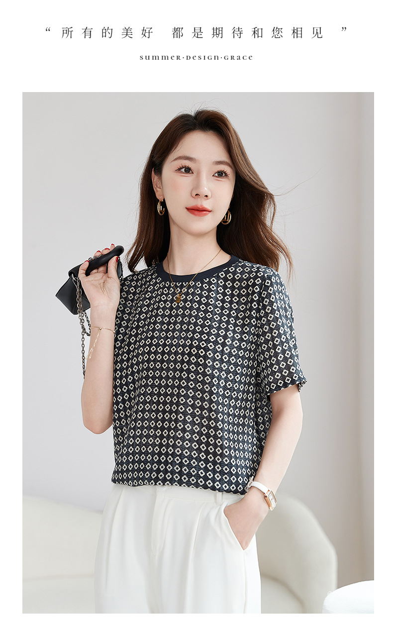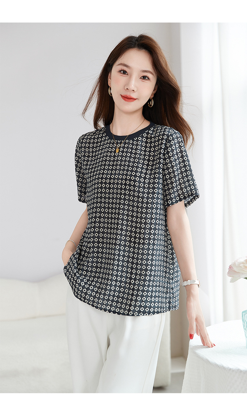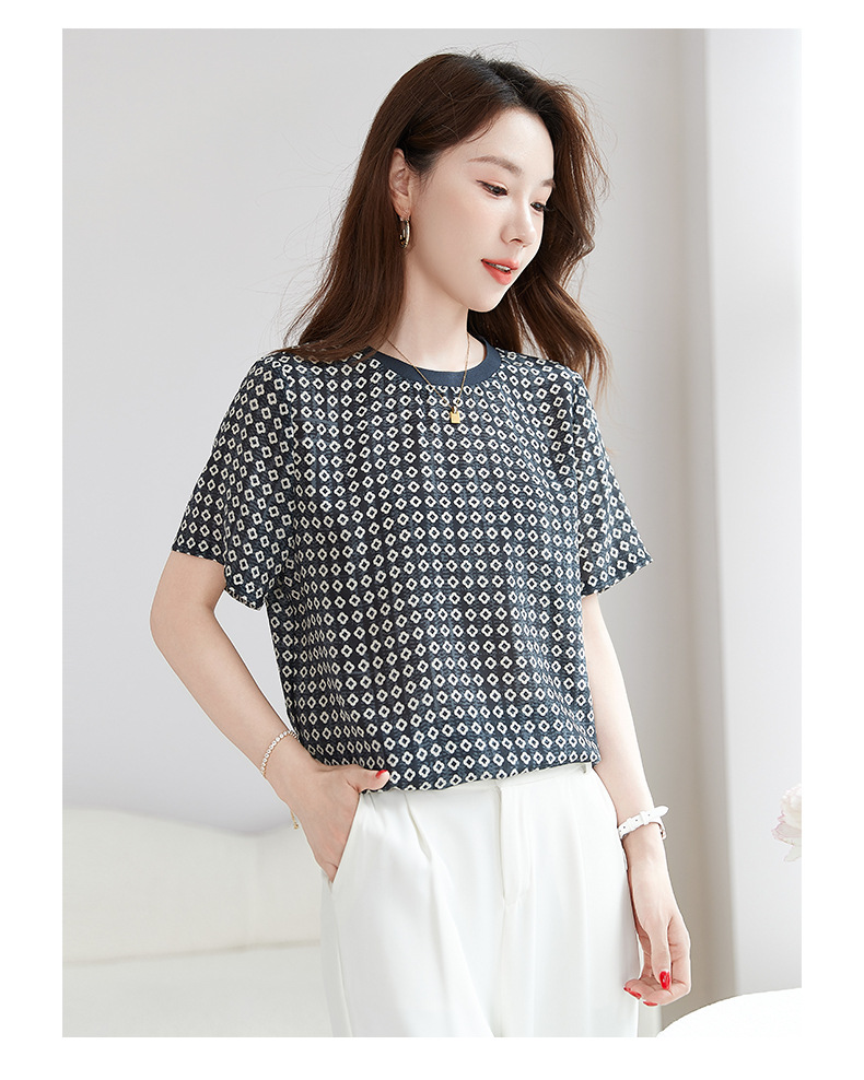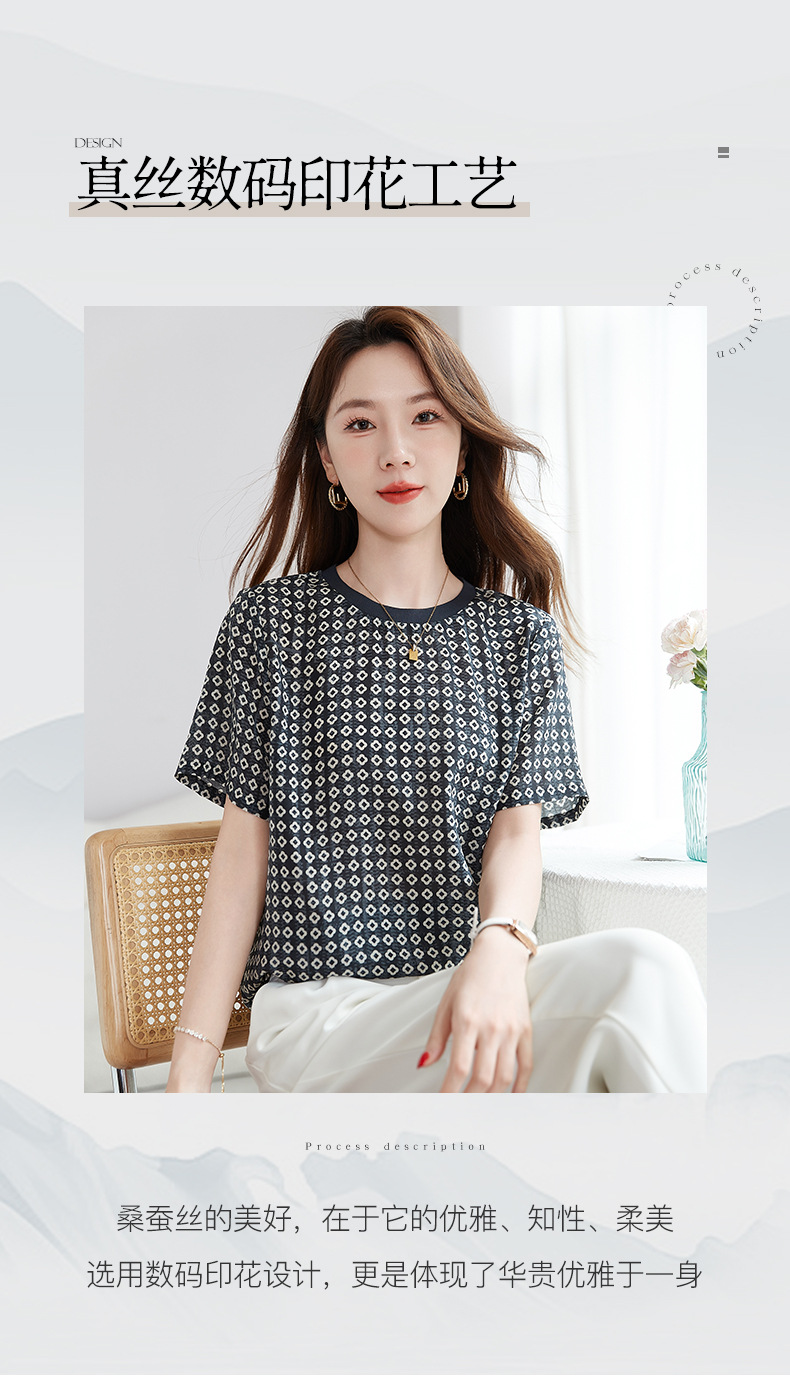 QS-12501717【经典百搭】100%桑蚕丝圆领短袖打底衫夏季格纹真丝T恤女1717