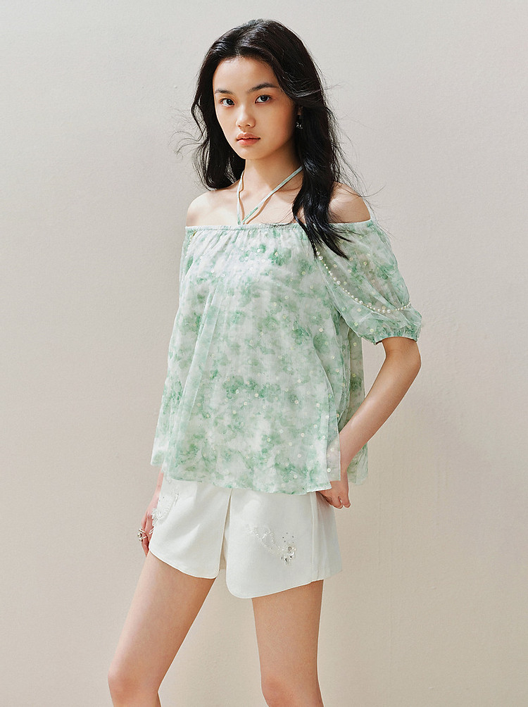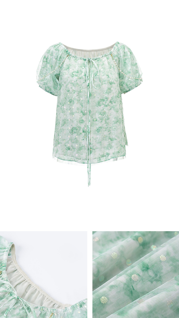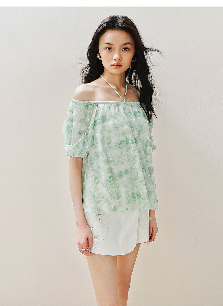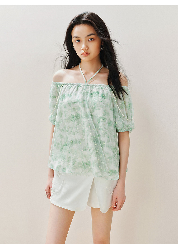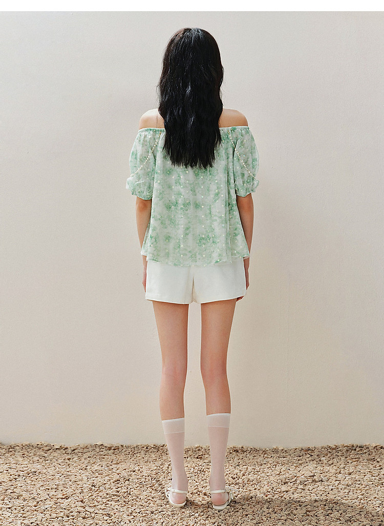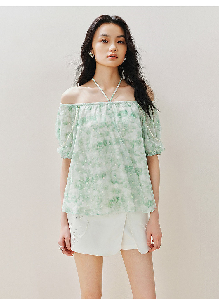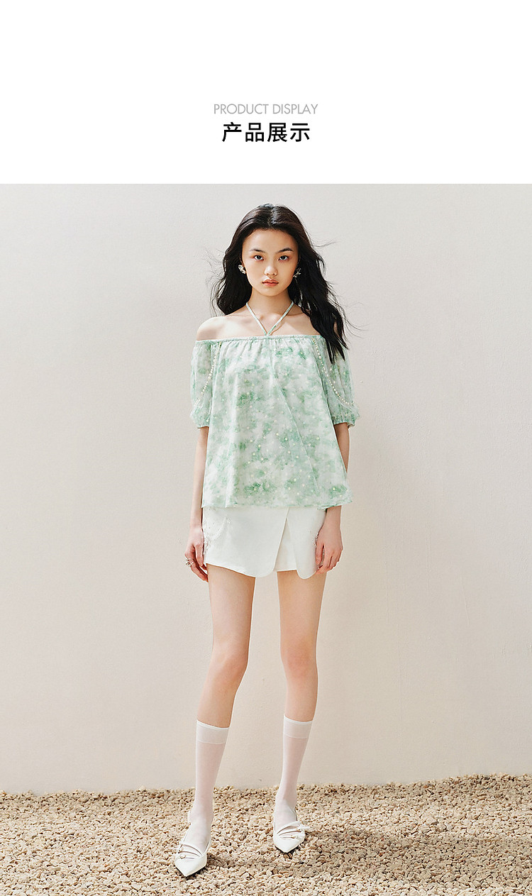 MAXRIENY花幻彩波点印花雪纺衫夏季一字肩上衣女修身显瘦