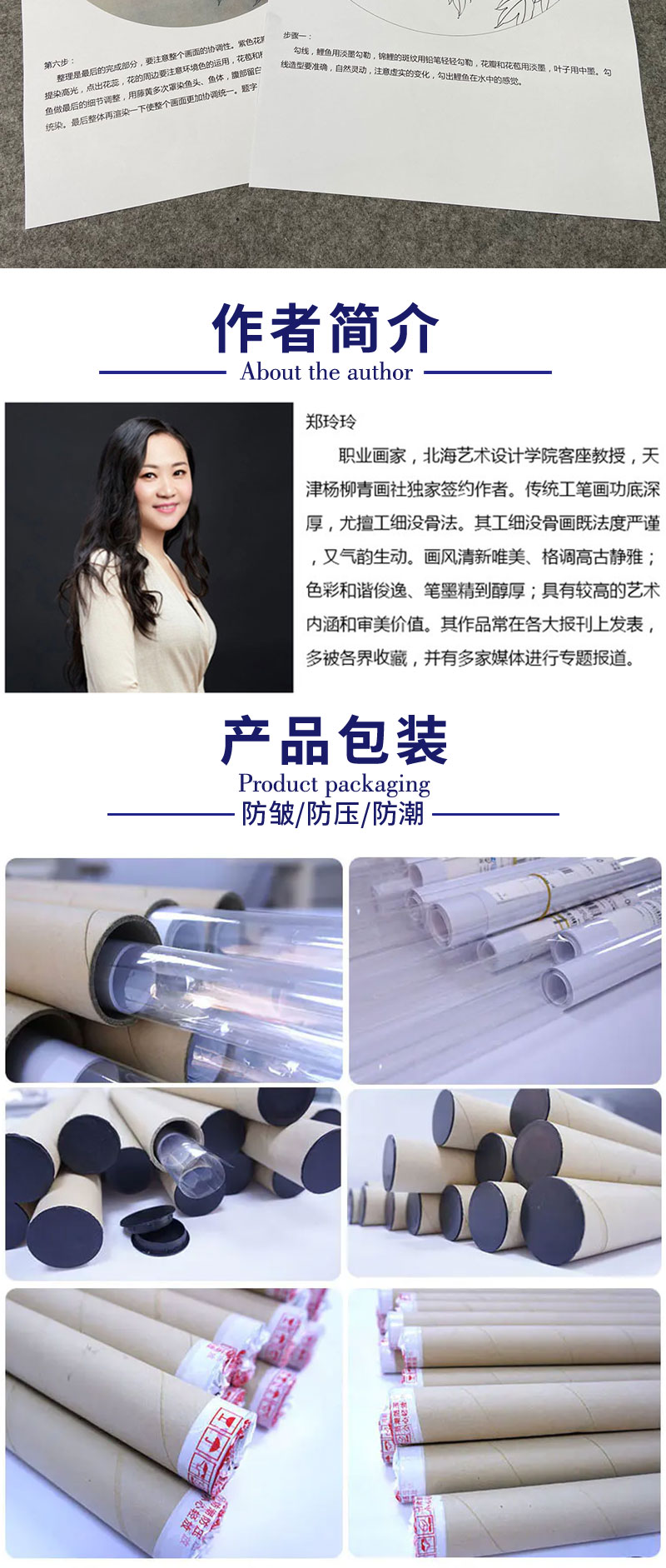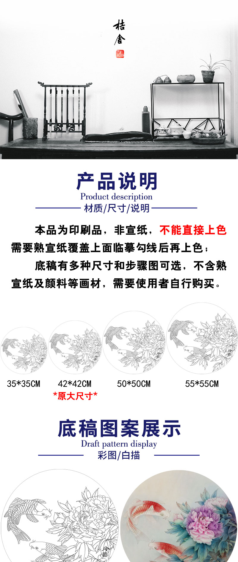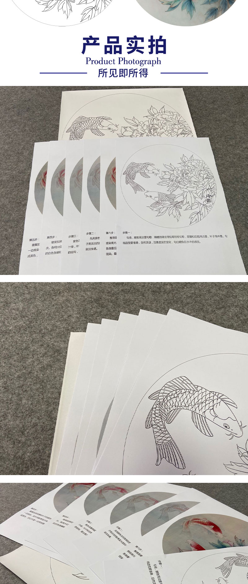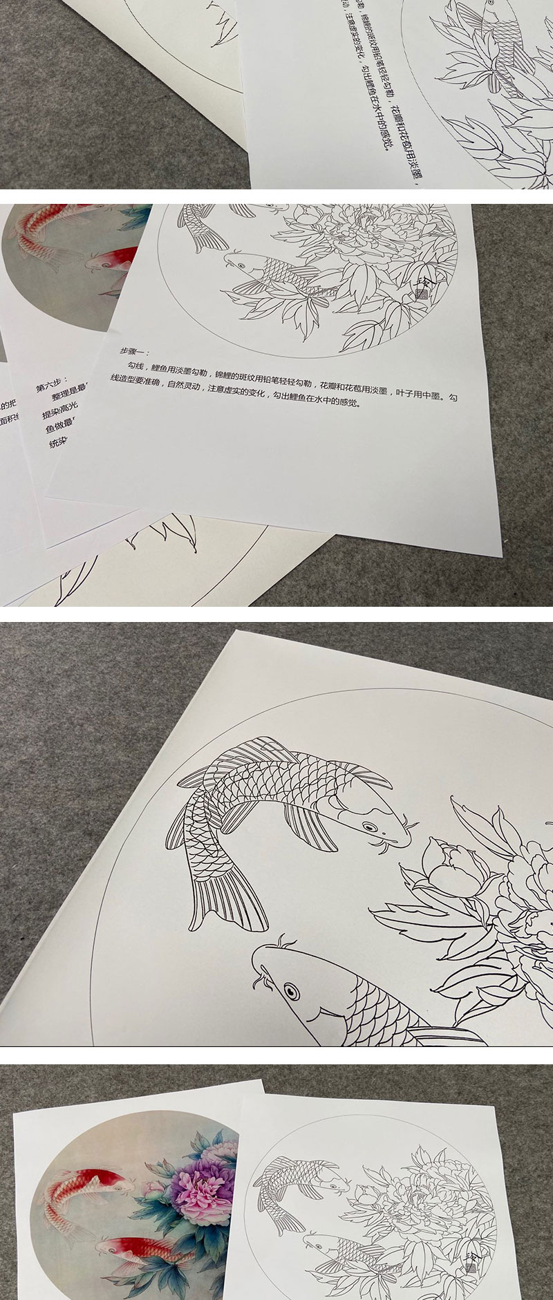 【有步骤、大彩图】郑玲玲工笔画白描稿圆形小品《夏日凝香》牡丹鲤鱼初学者临摹花鸟线稿ZL25