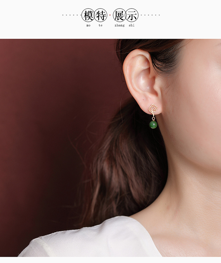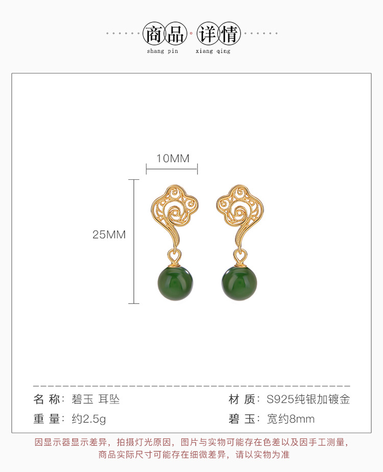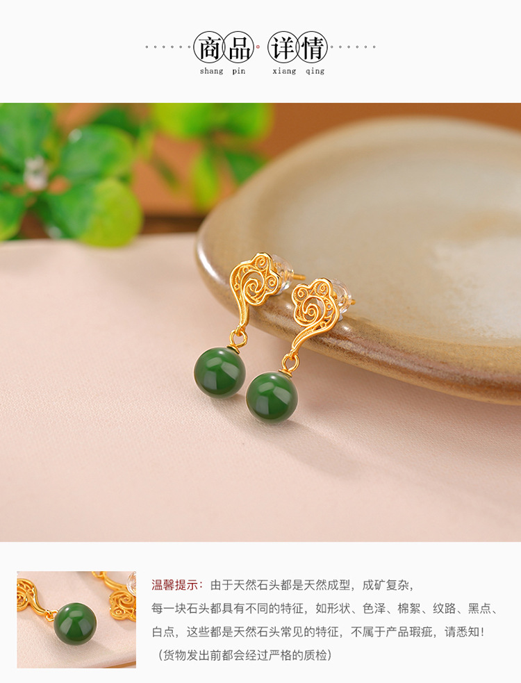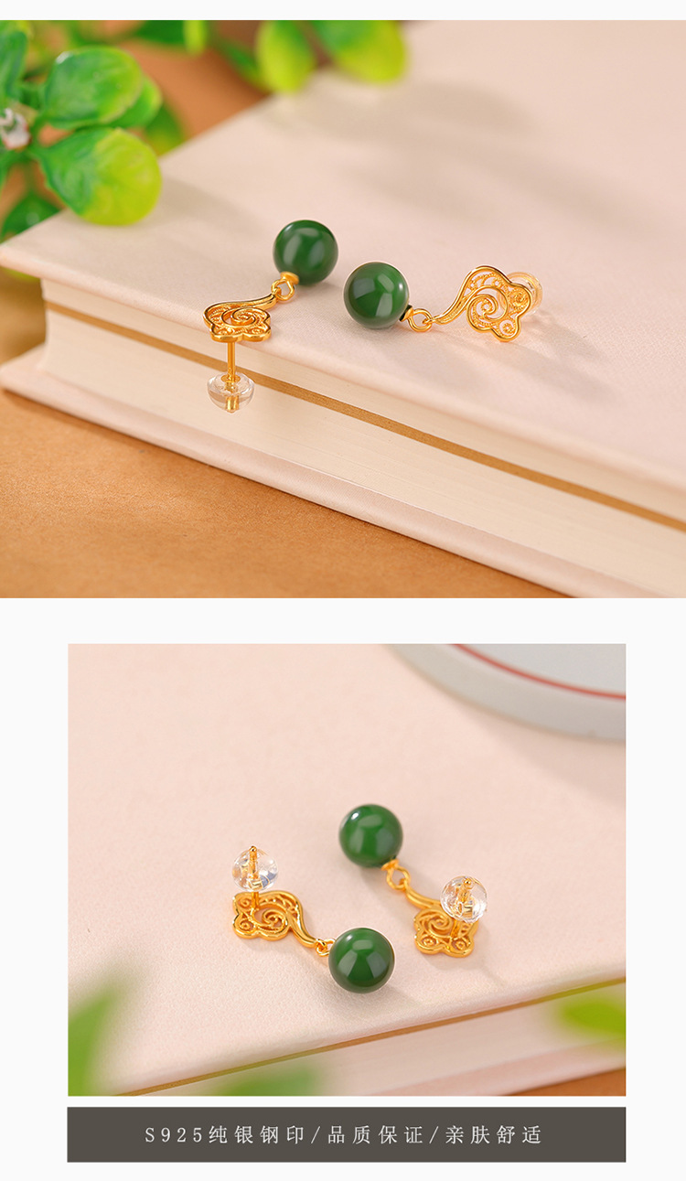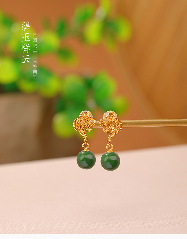 S925纯银镀金和田玉碧玉花丝祥云镂空圆珠耳钉耳坠CW
