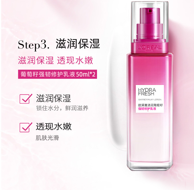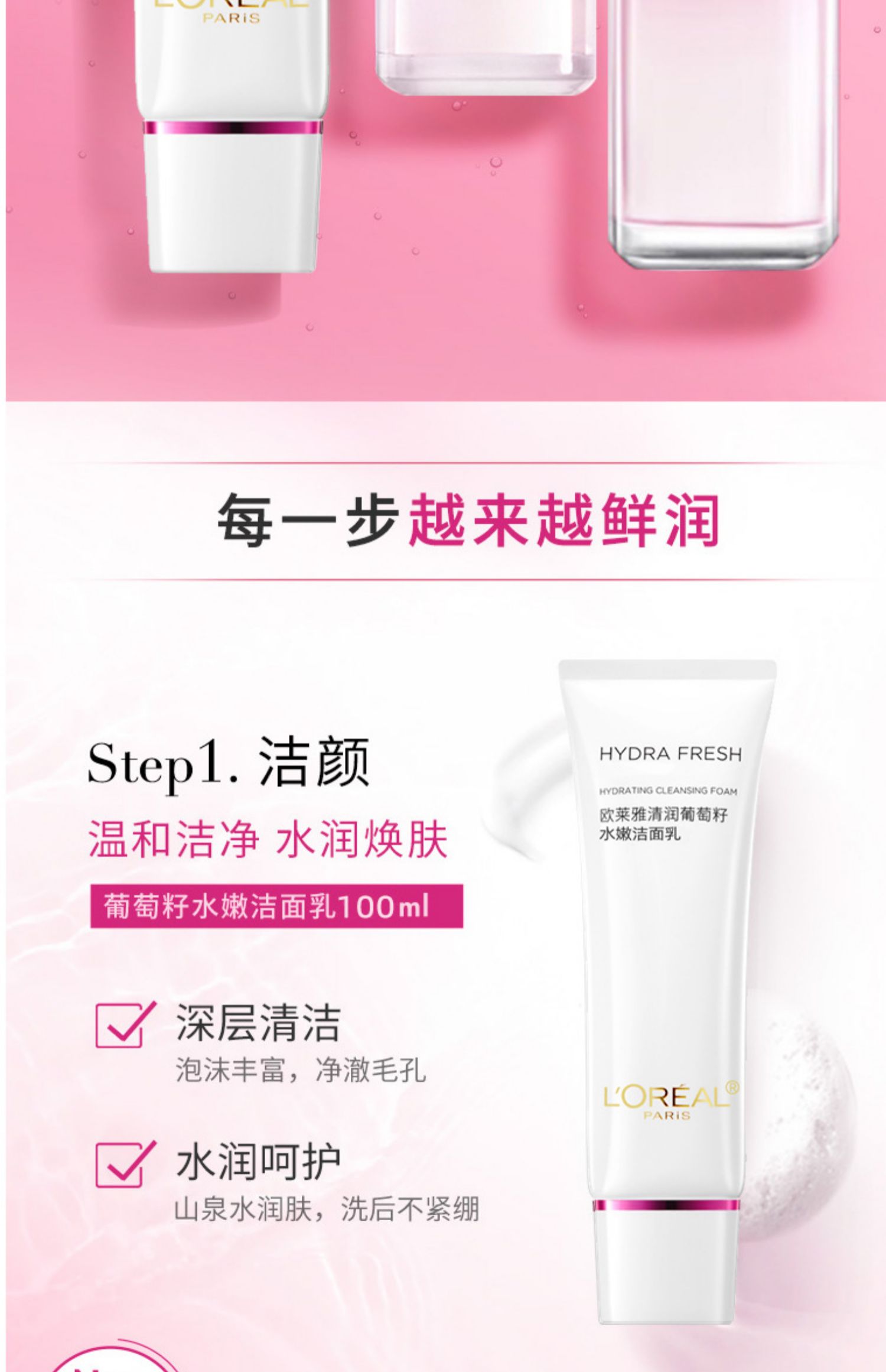 【秒杀】欧莱雅(LOREAL)清润葡萄籽4件套装(洁面100ml+水175ml+乳液50ml+乳液50ml)