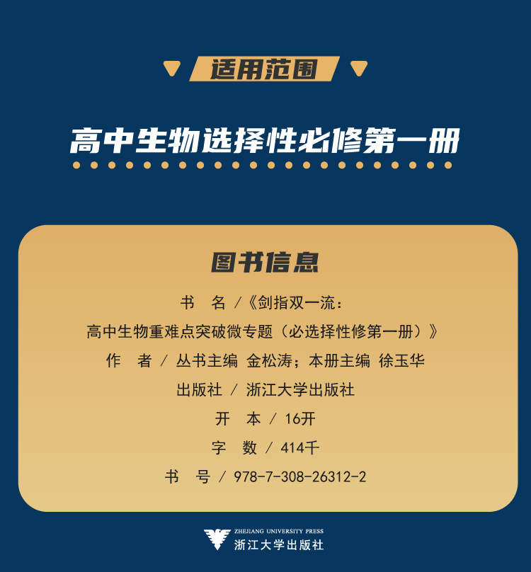本册主编:徐玉华,中共党员,浙江省桐庐中学正高级教师,教科室主任。荣获2023年基础教育国家级教学成果二等奖、浙江省春蚕奖、浙江省教坛新秀、浙江省教科研先进个人、浙派名师培养对象、浙江师范大学硕士实践导师、“西湖明珠工程”领军人才、杭州市高层次C类人才、杭州市五星级学科带头人、首批杭州市杰出教育工作者、杭州市第五届教育科研标兵等。在高中生物教育领域深耕22年,带领生物组获浙江省先进教研组。创建混合式学习案例,获教育部优课及省一等奖。2025年授牌杭州市教育科研标兵徐玉华工作室。