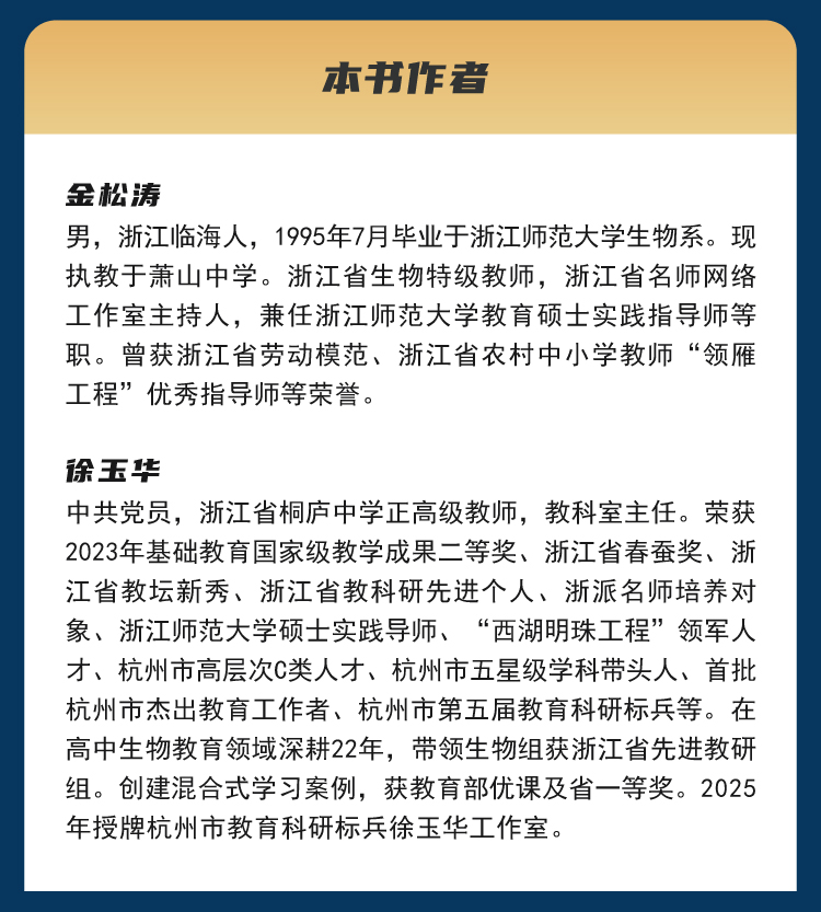 丛书主编:金松涛,男,浙江临海人,1995年7月毕业于浙江师范大学生物系。现执教于萧山中学。浙江省生物特级教师,浙江省名师网络工作室主持人,兼任浙江师范大学教育硕士实践指导师等职。曾获浙江省劳动模范、浙江省农村中小学教师“领雁工程”优秀指导师等荣誉。