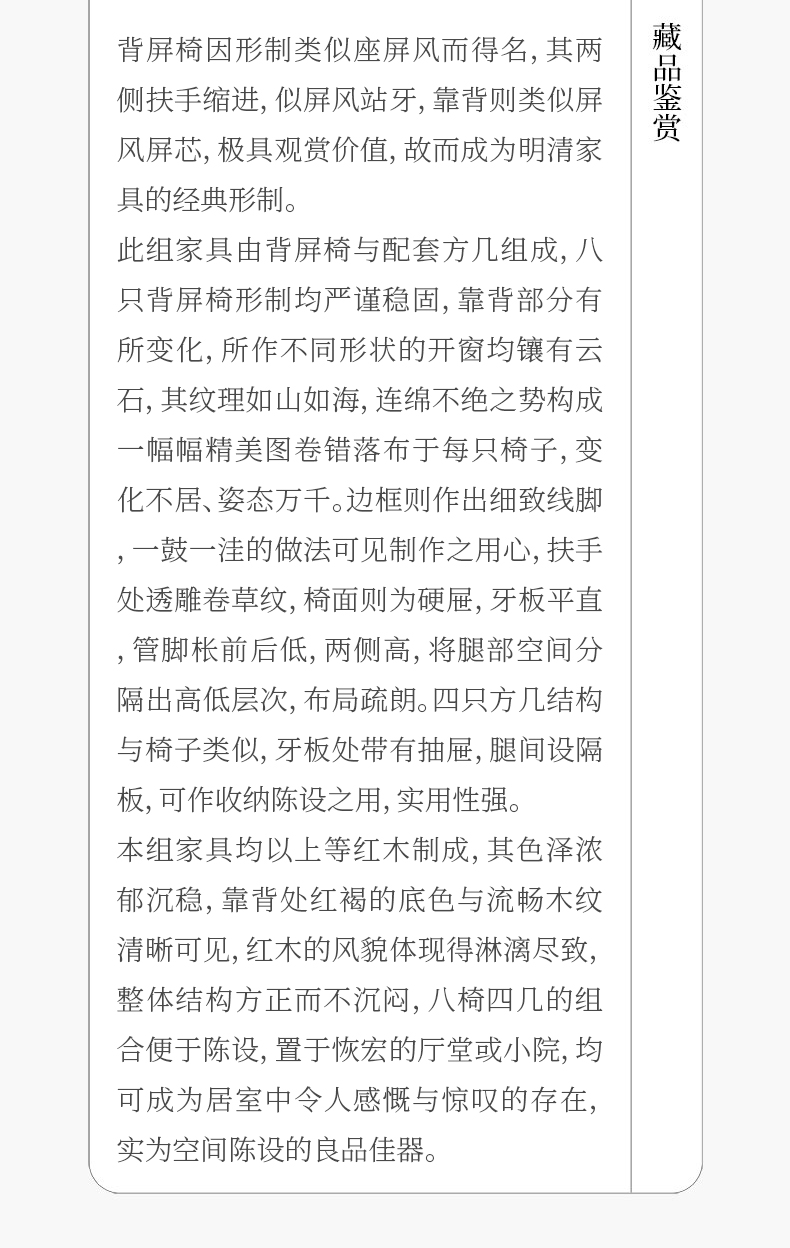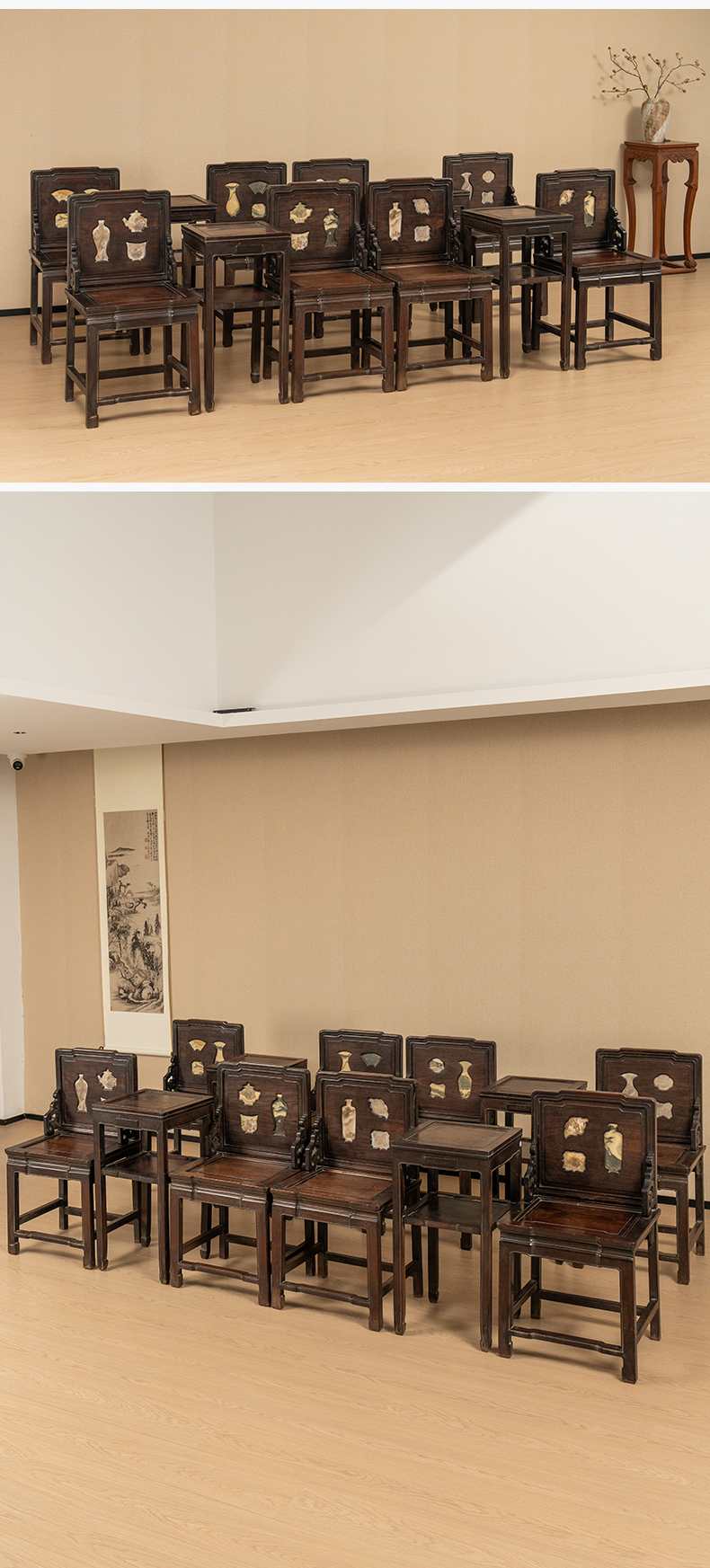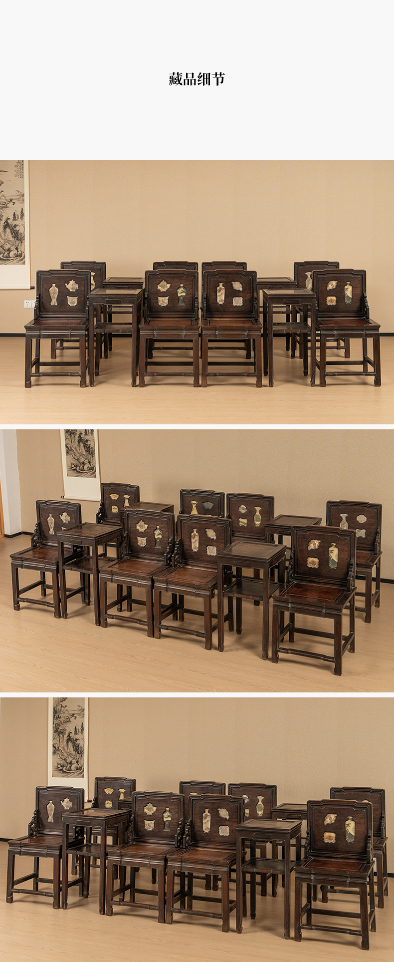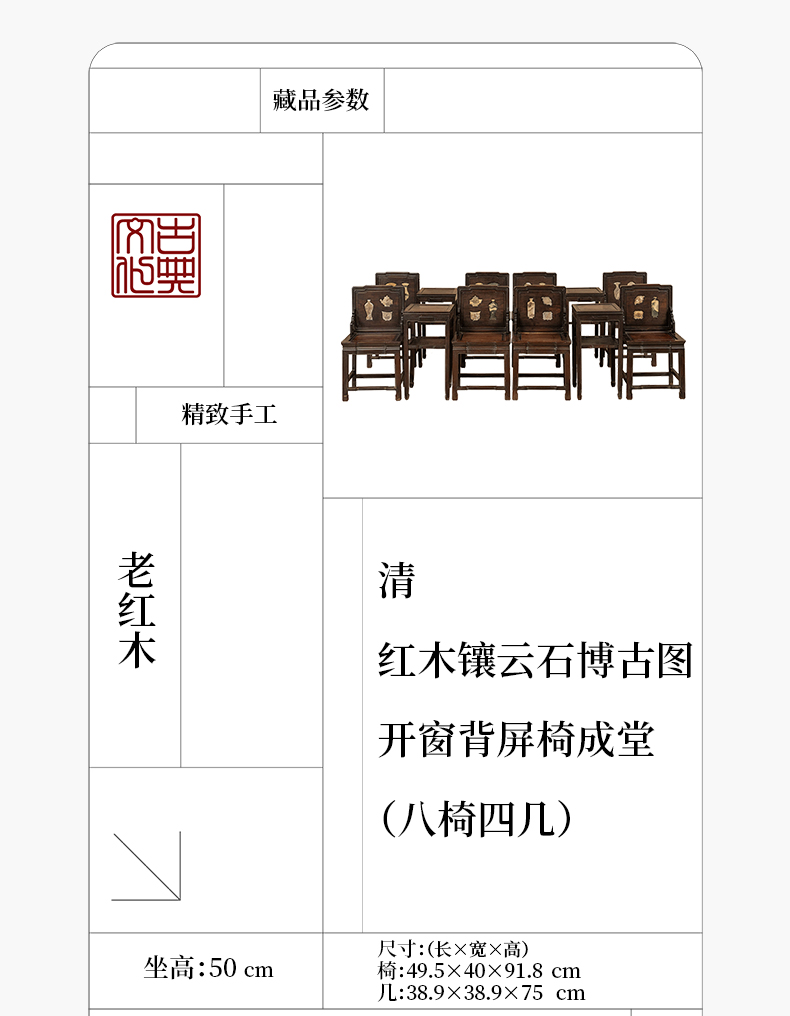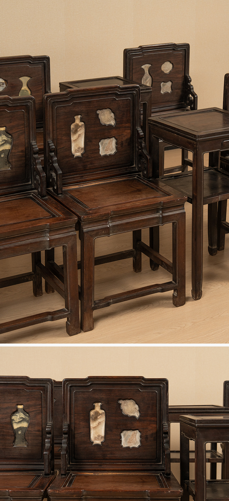 清 红木镶云石博古图开窗背屏椅成堂(八椅四几)