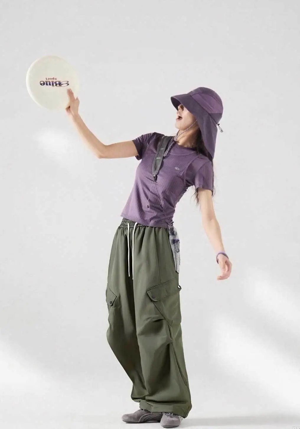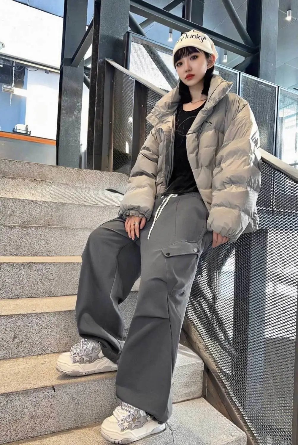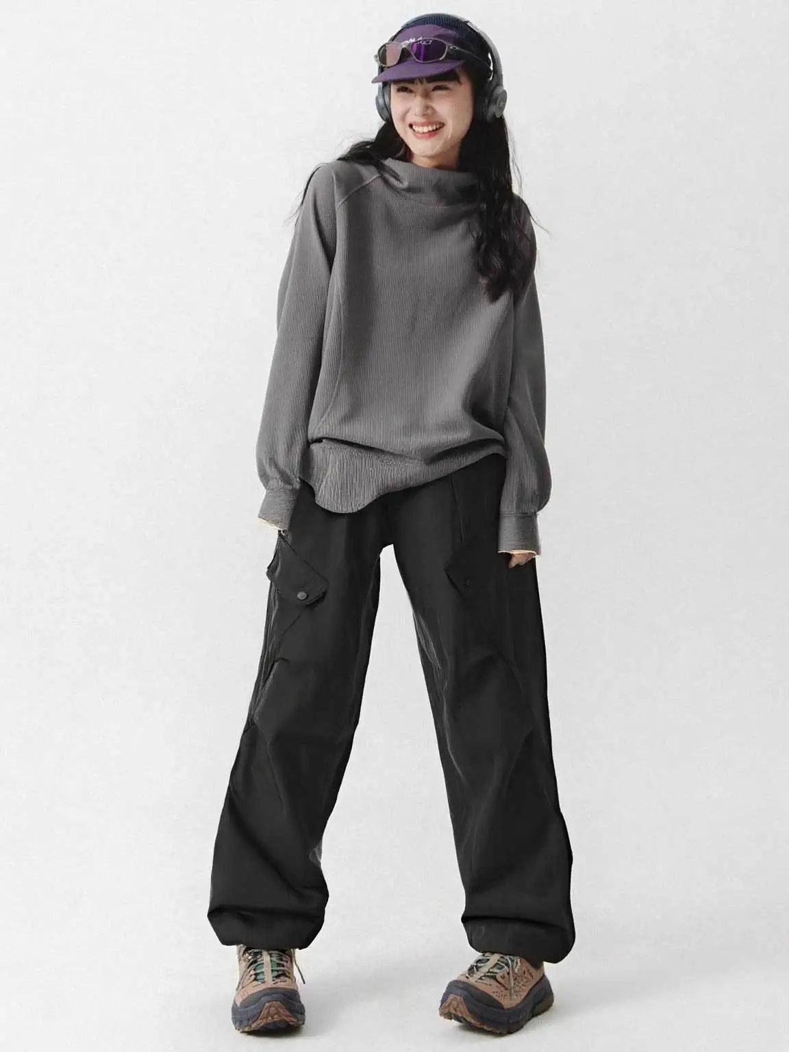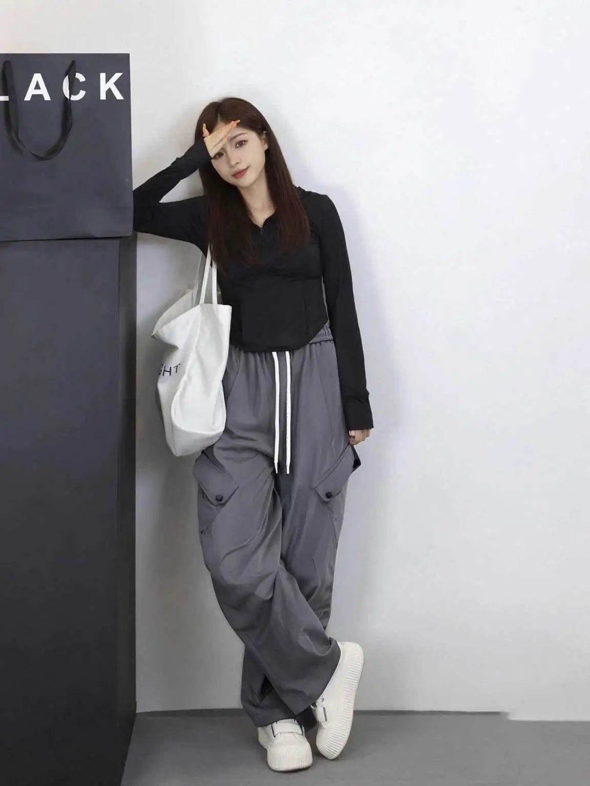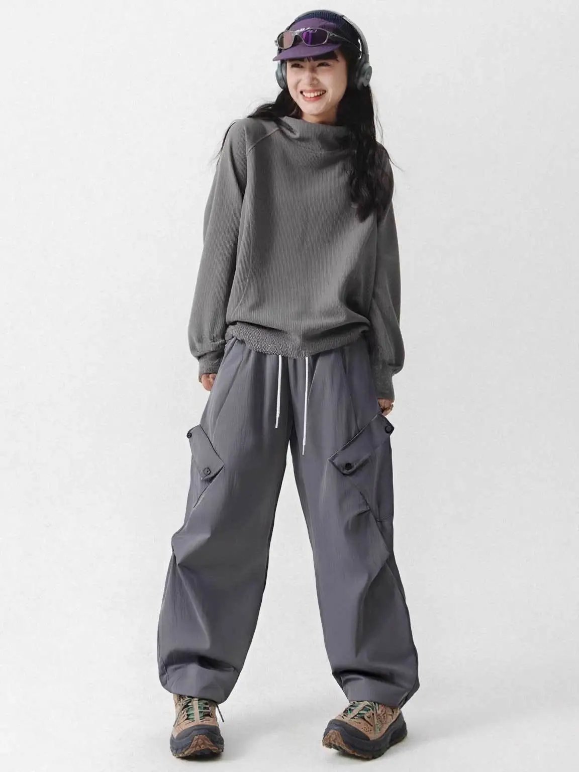 是简单的直筒宽松版型+简约松紧小高腰版型