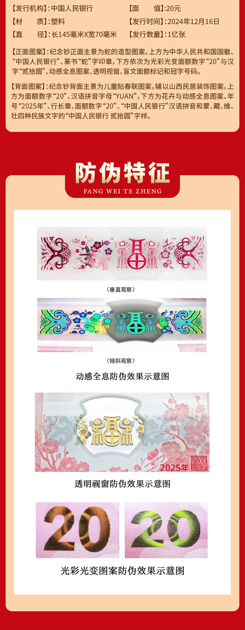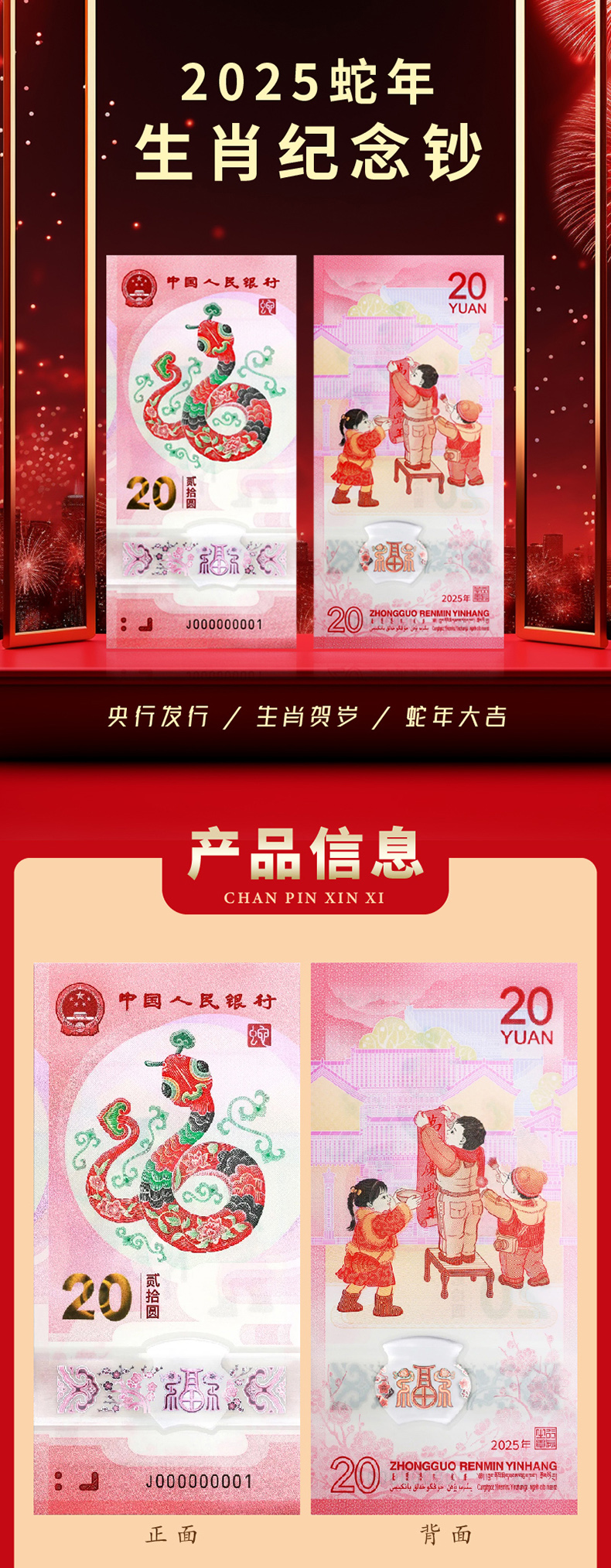 中国金币2025乙巳蛇年纪念钞 春节贺岁蛇年塑料钞纪念币