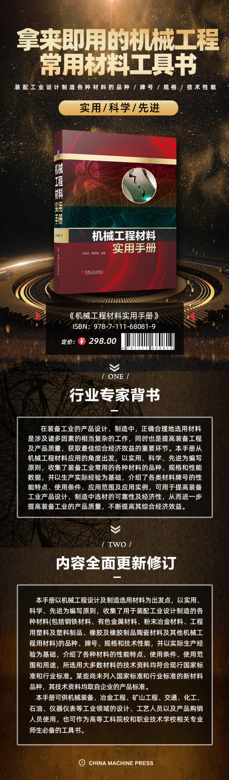 本手册为包括钢铁材料、有色金属材料、粉末冶金材料、工程用塑料、工业常用橡胶、陶瓷材料以及玻璃、碳石墨材料、石棉、涂料、木材等装备工业常用的各种材料的实用技术资料。编入本手册的大多数材料的技术资料均符合现行国家标准或行业标准,有些材料虽未列入国家标准或行业标准,但已有成功使用的先例,其技术数据和资料均取自相关行业主体企业产品标准以及有关研究和测试的成果。对于有些材料的常用品种牌号,除编入了相关的国家标准或行业标准规定的规格、性能数据、应用等技术资料外,还介绍了有关牌号材料不同尺寸规格、不同温度、不同热处理的性能数据,同时还辑录了我国和国外主要工业国家有关材料牌号的对照。本手册资料数据可靠、实用性强,是机械工业设计和制造部门、科研设计院所必备的工具书,也可作为高等院校有关专业课程设计和毕业设计的参考书,还可供装备工业设计、制造、科研、生产管理及装备维修等部门的技术人员和高等院校、高等职业技术学院、中等职业学校有关专业的师生使用。