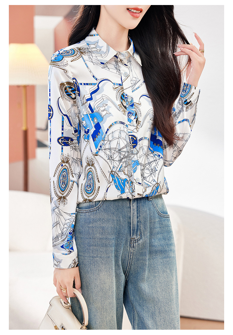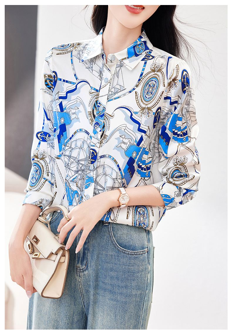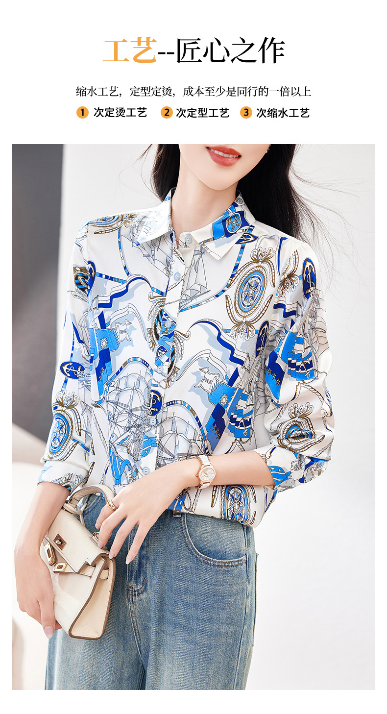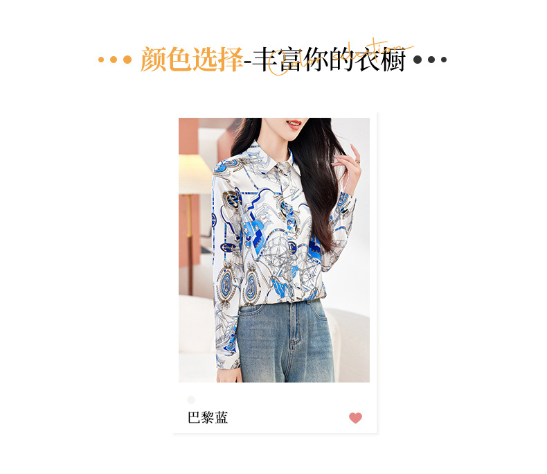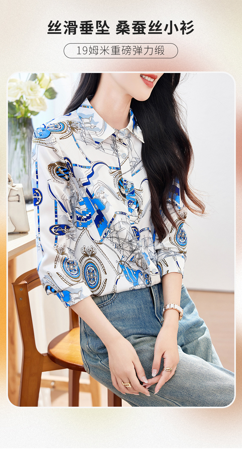 KQ2025早秋桑蚕丝趣味印花真丝衬衫polo领长袖花色通勤衬衣女士上衣