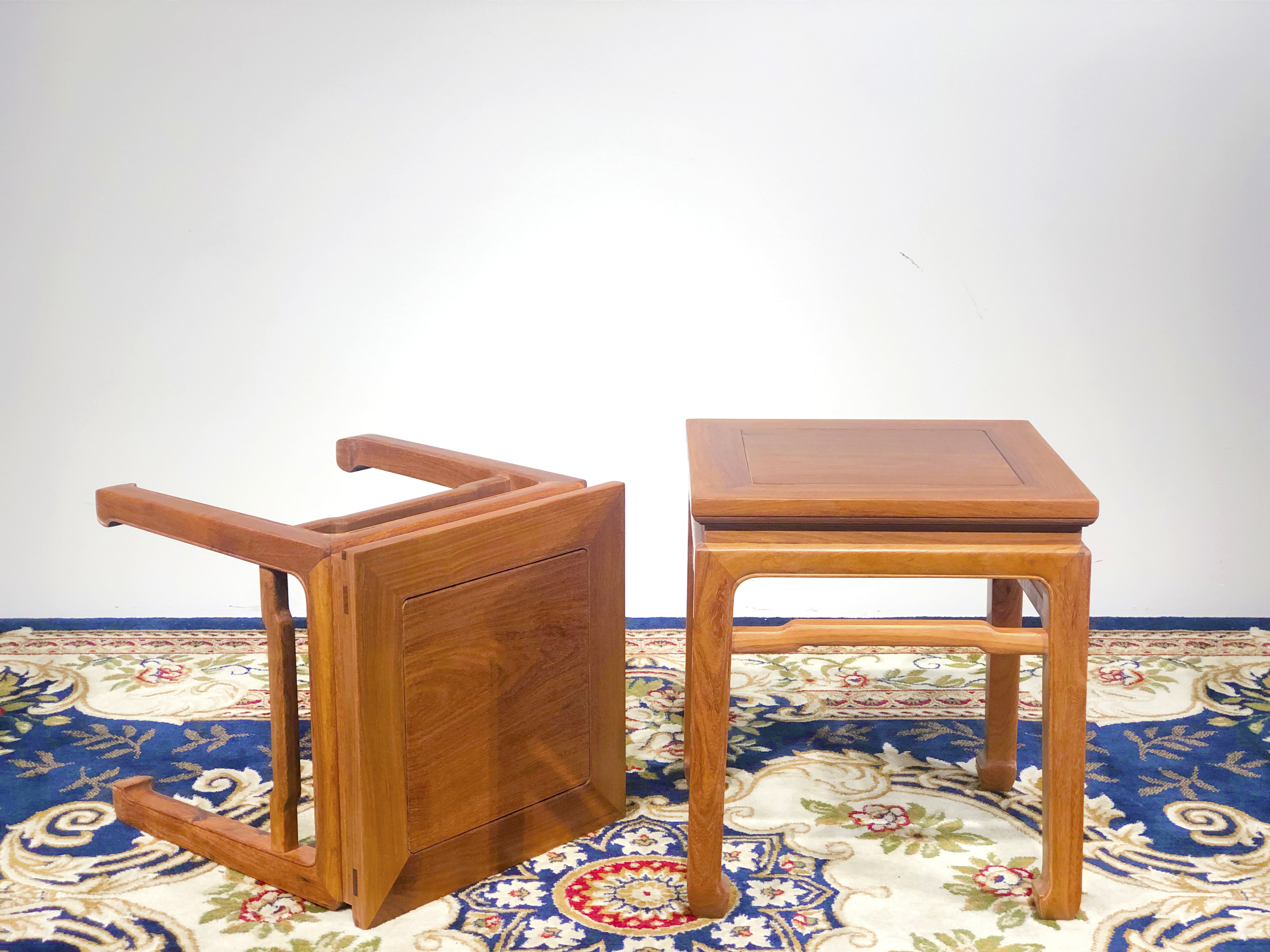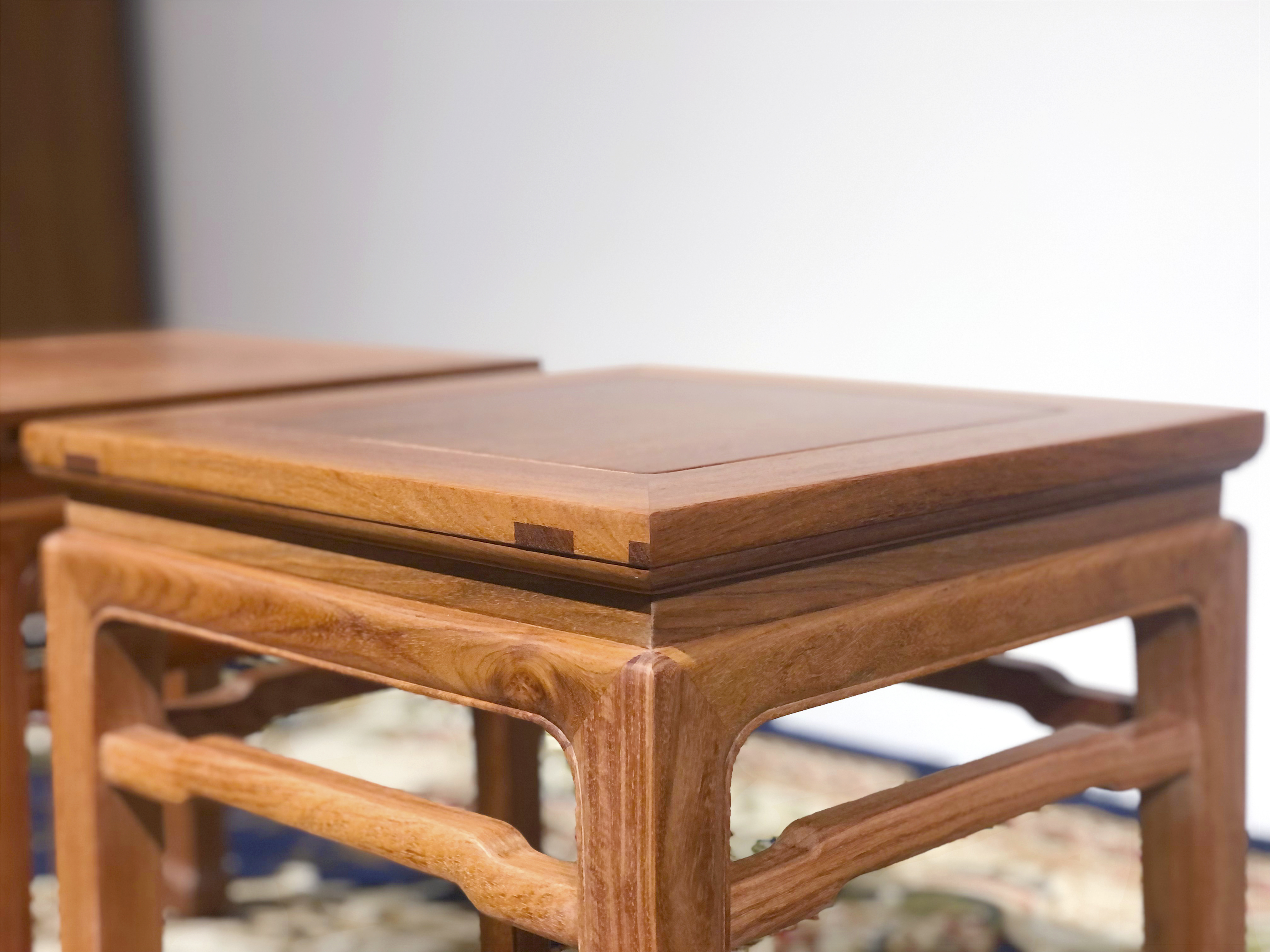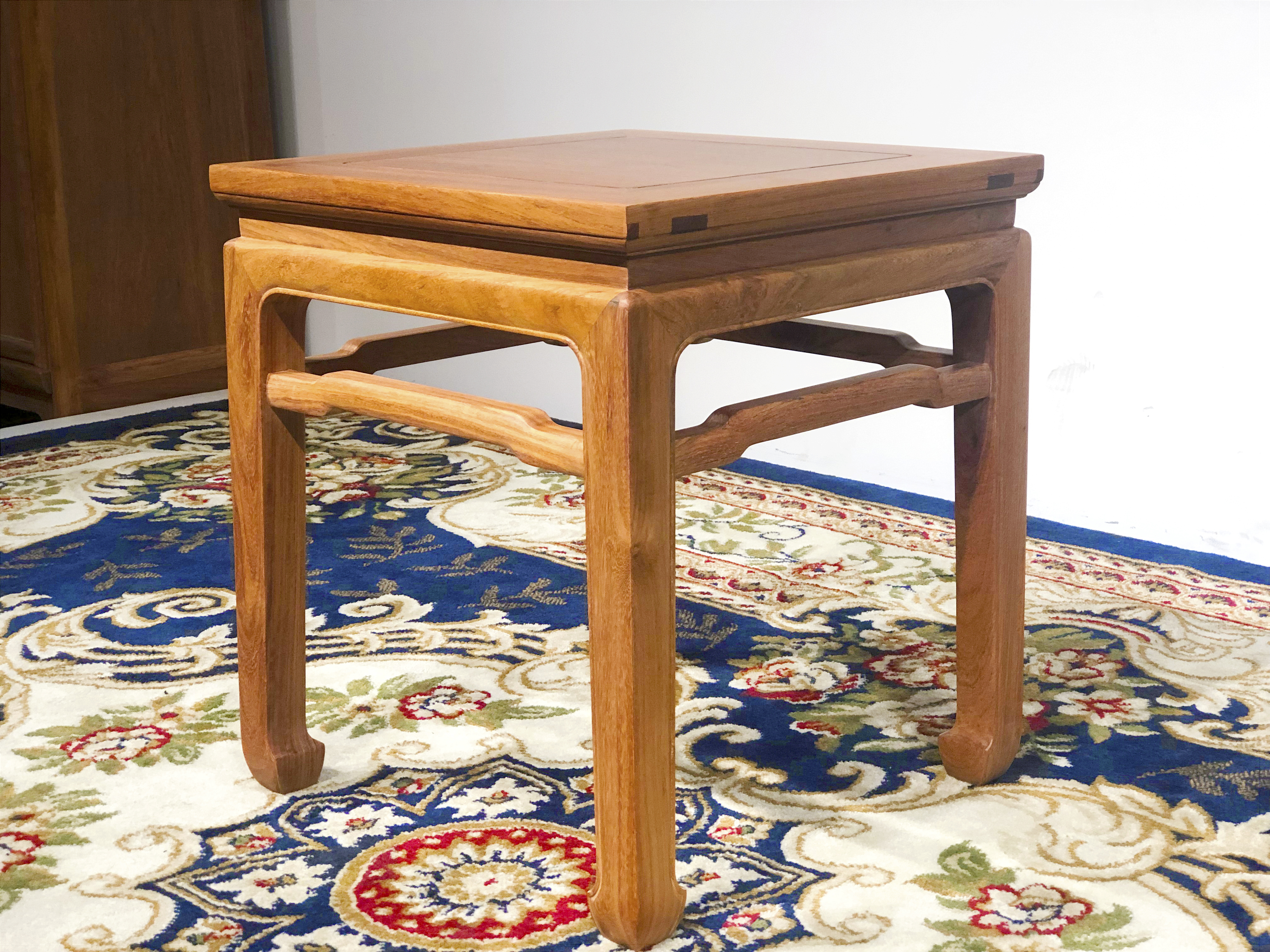 此款方凳为明式家具经典王世襄款,收录于《明式家具珍赏》一书,凳面椅盘为标准格角榫攒边,抹头见透榫,边抹冰盘上舒下敛,束腰与沿边起线的直牙条以抱肩榫与腿足结合,腿足顶端出双榫纳入凳面边框底部,下端伸展为线条明练的马蹄足,牙条上的阳线连接延续腿足,牙条下罗锅枨以齐肩膀榫退后装入四足。