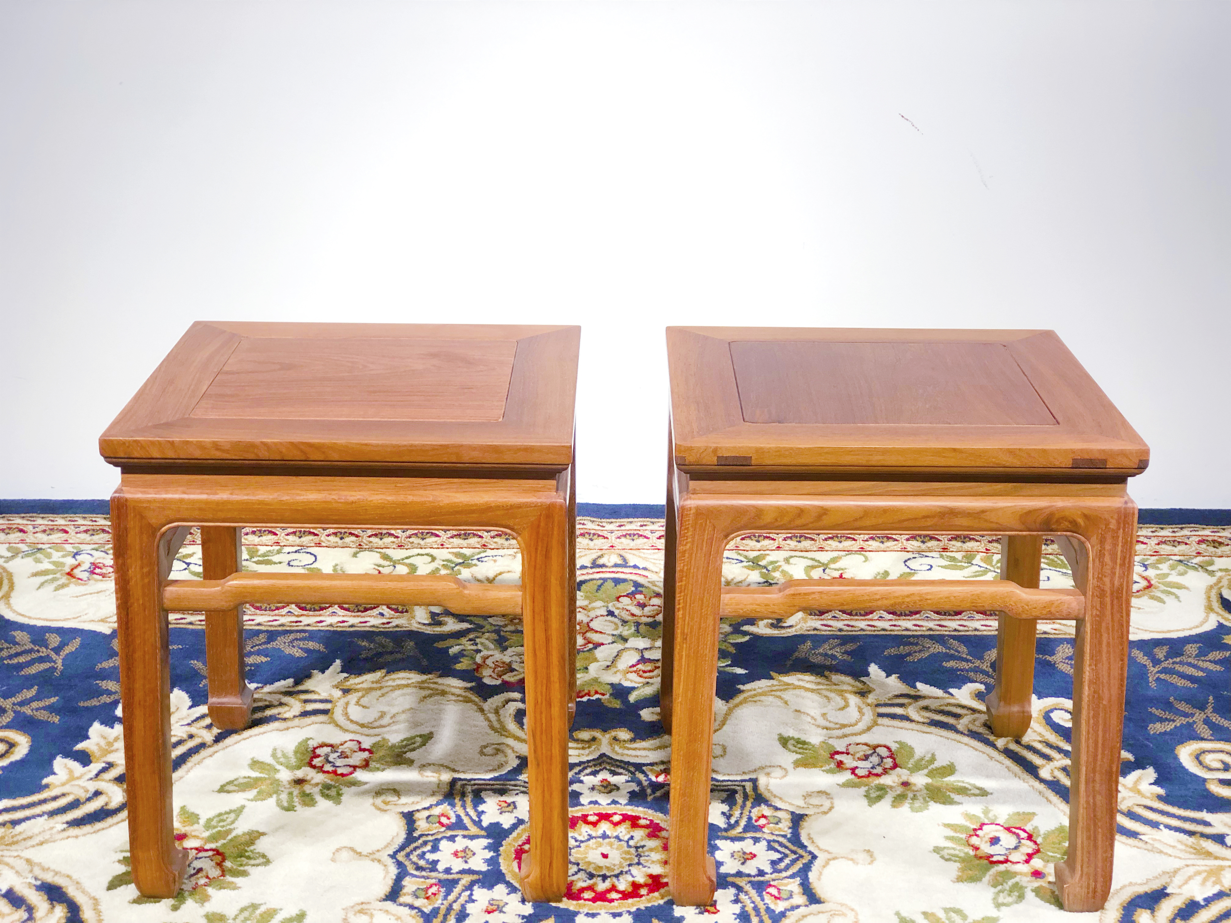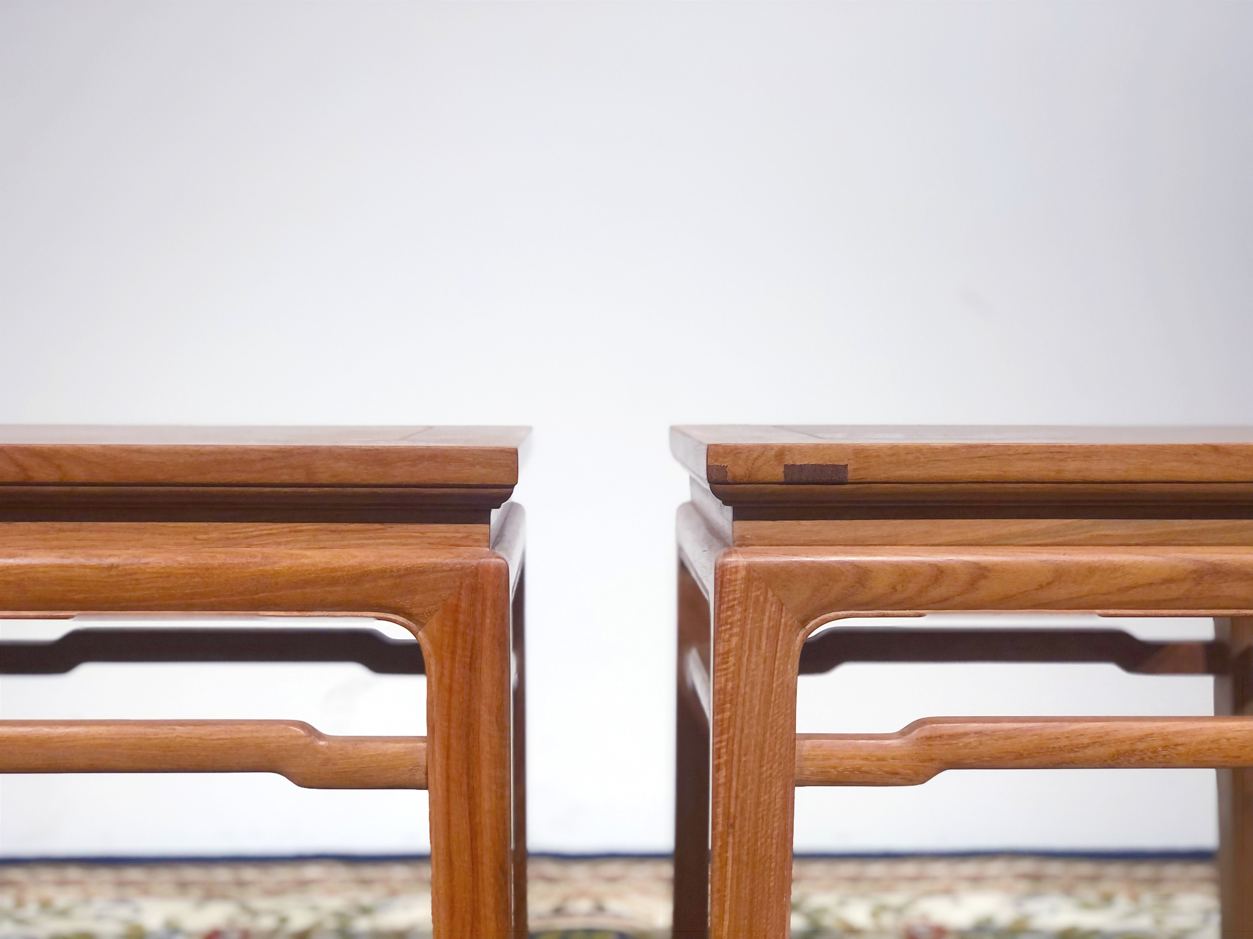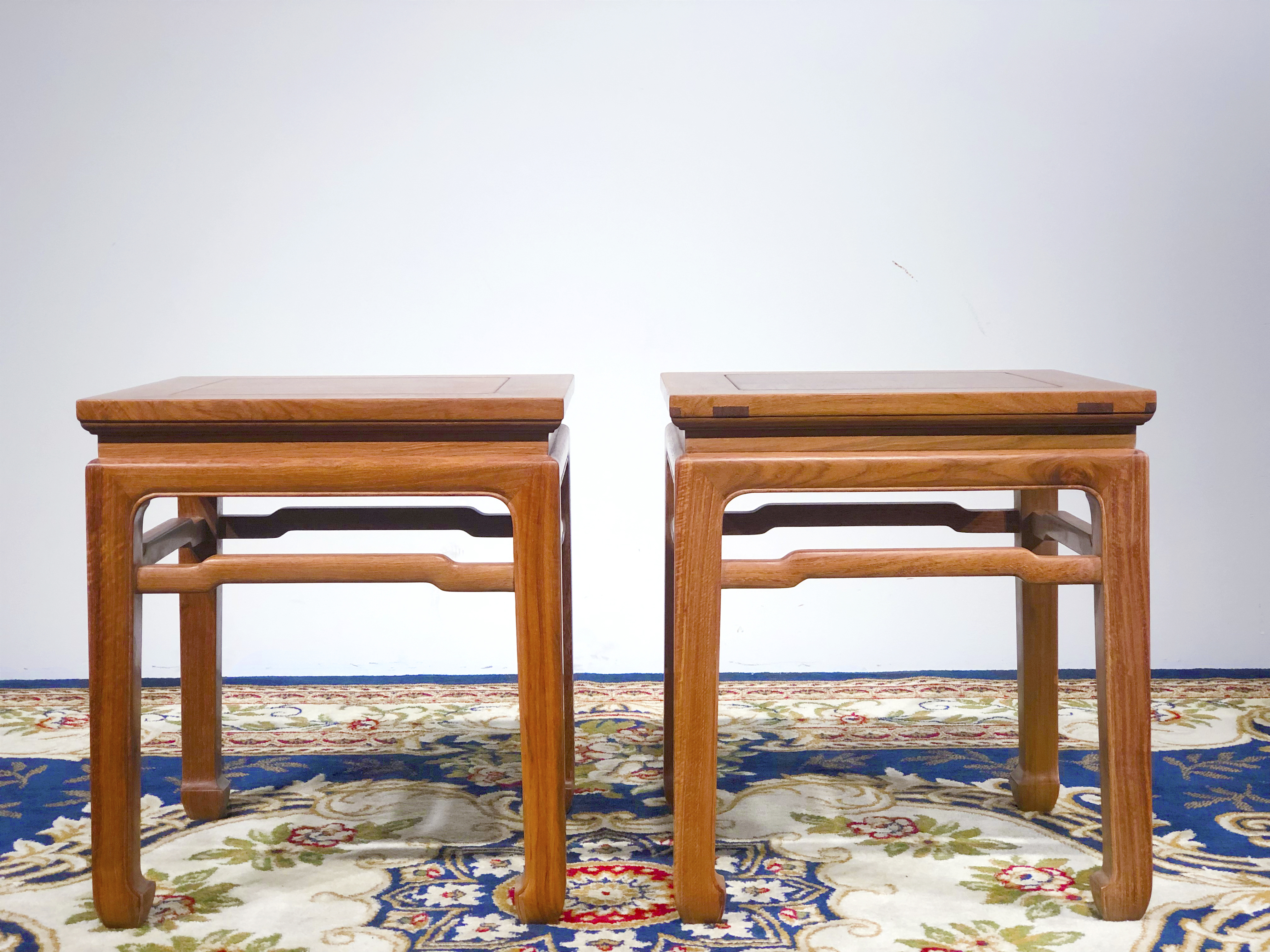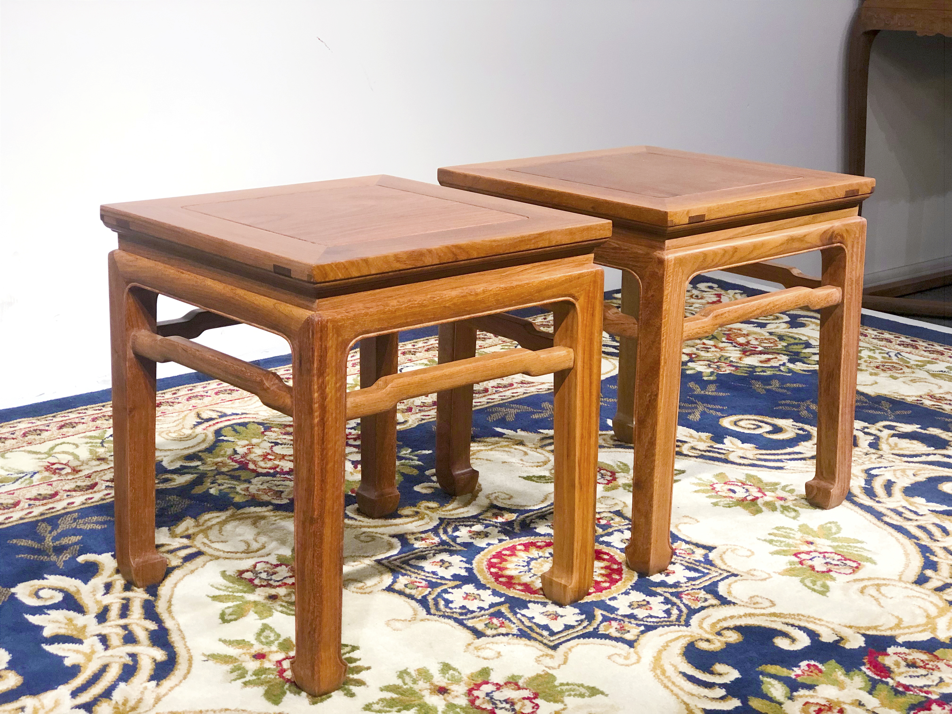 此款方凳为明式家具经典王世襄款,收录于《明式家具珍赏》一书,凳面椅盘为标准格角榫攒边,抹头见透榫,边抹冰盘上舒下敛,束腰与沿边起线的直牙条以抱肩榫与腿足结合,腿足顶端出双榫纳入凳面边框底部,下端伸展为线条明练的马蹄足,牙条上的阳线连接延续腿足,牙条下罗锅枨以齐肩膀榫退后装入四足。