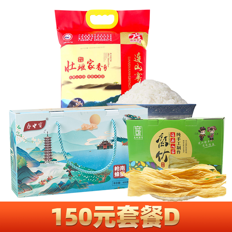 【150元套餐D】春中宝国潮版礼盒装蜂蜜100g*4瓶/盒+连山纯黄豆腐竹礼盒装500g+连山壮瑶家香雾峰油粘米5KG