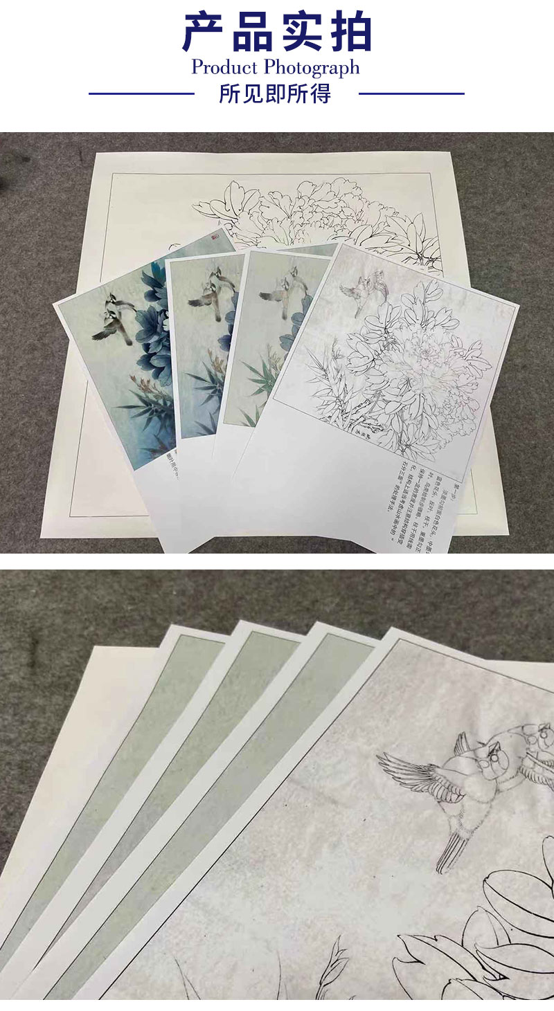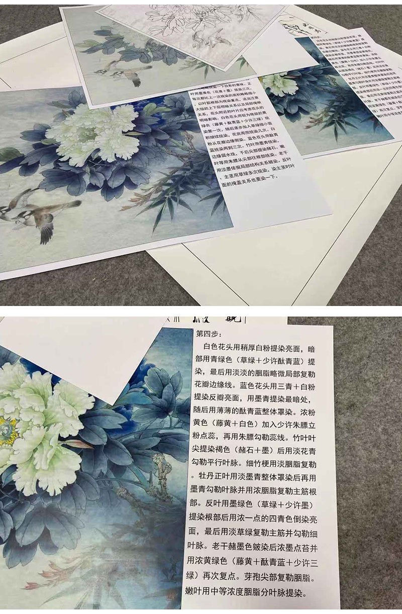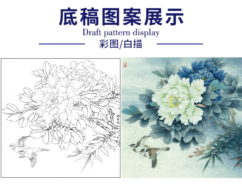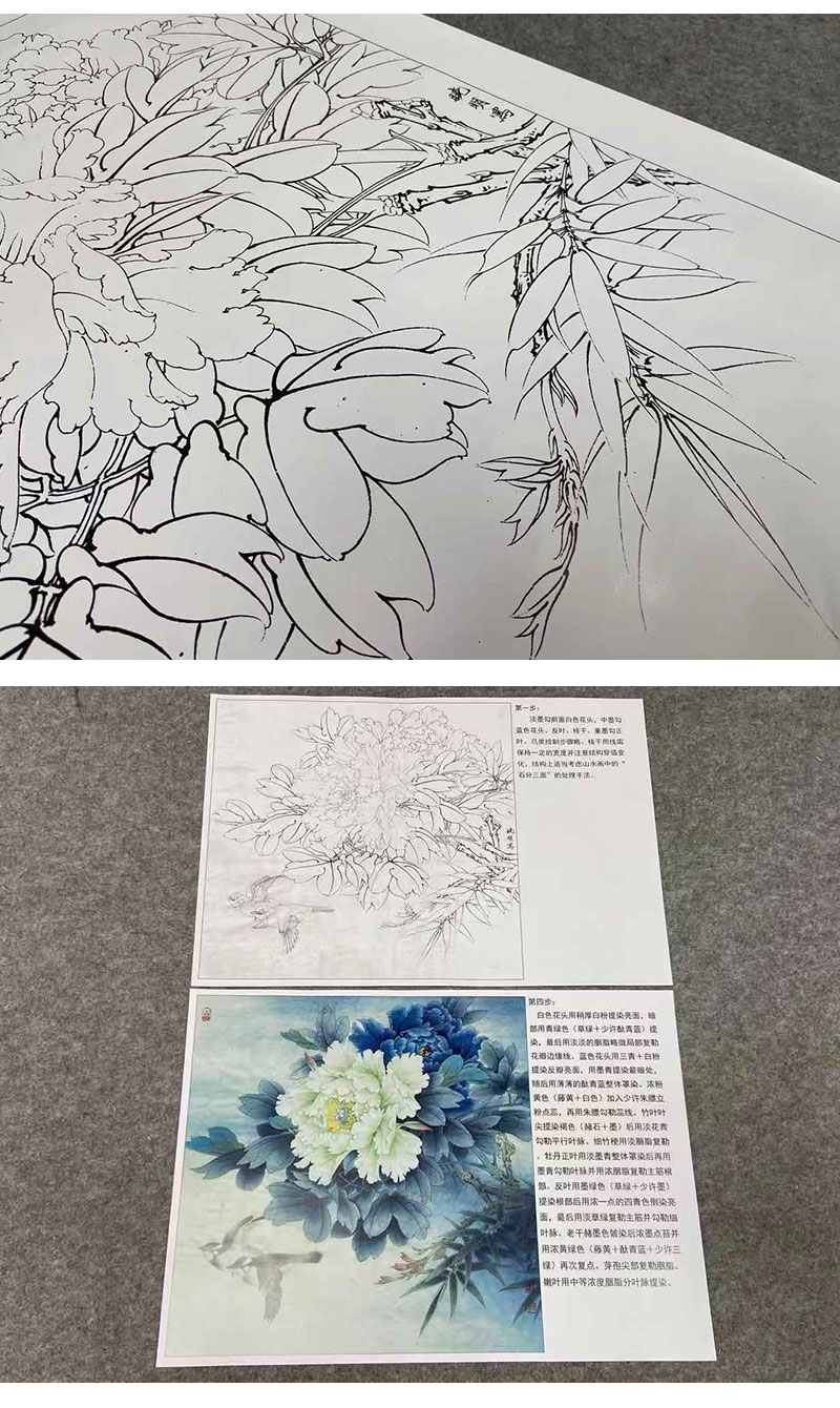 【有步骤、大彩图】李晓明工笔画白描底稿斗方小品《富贵白头》牡丹初学者临摹花鸟线稿KD30