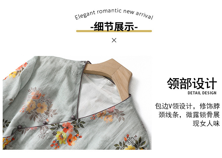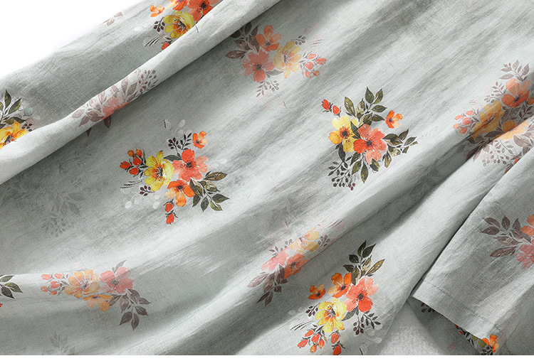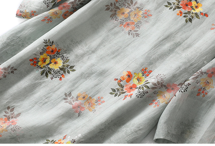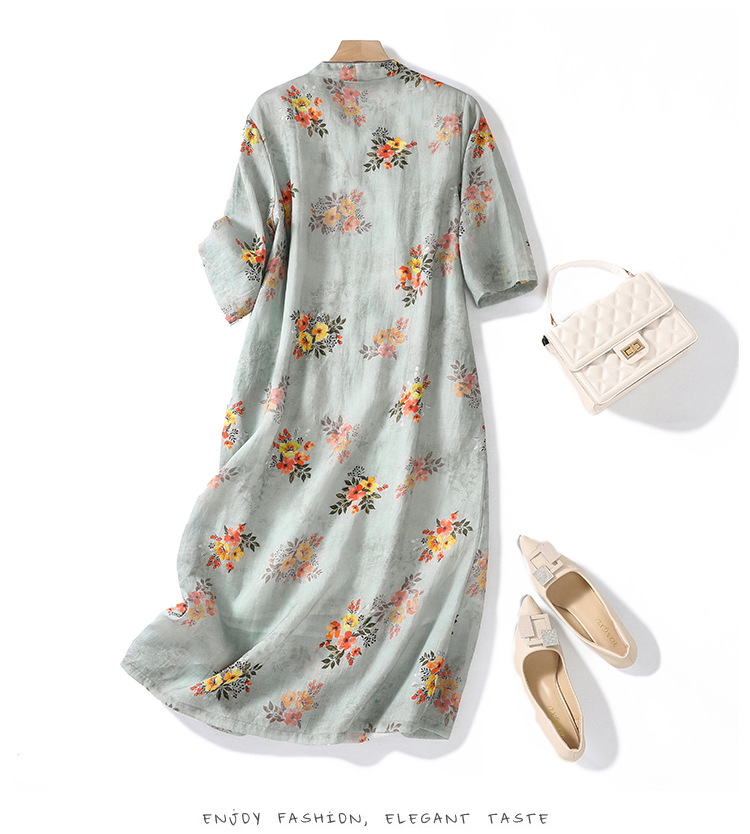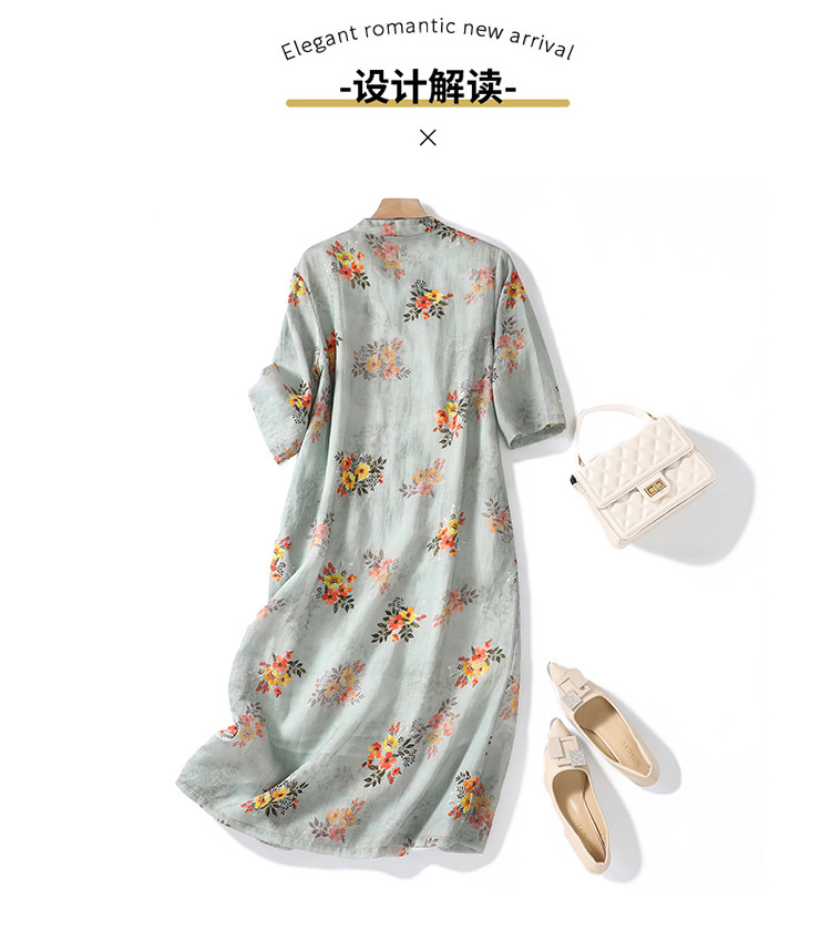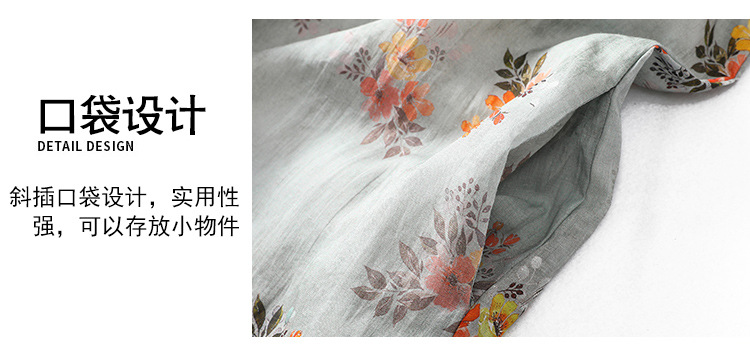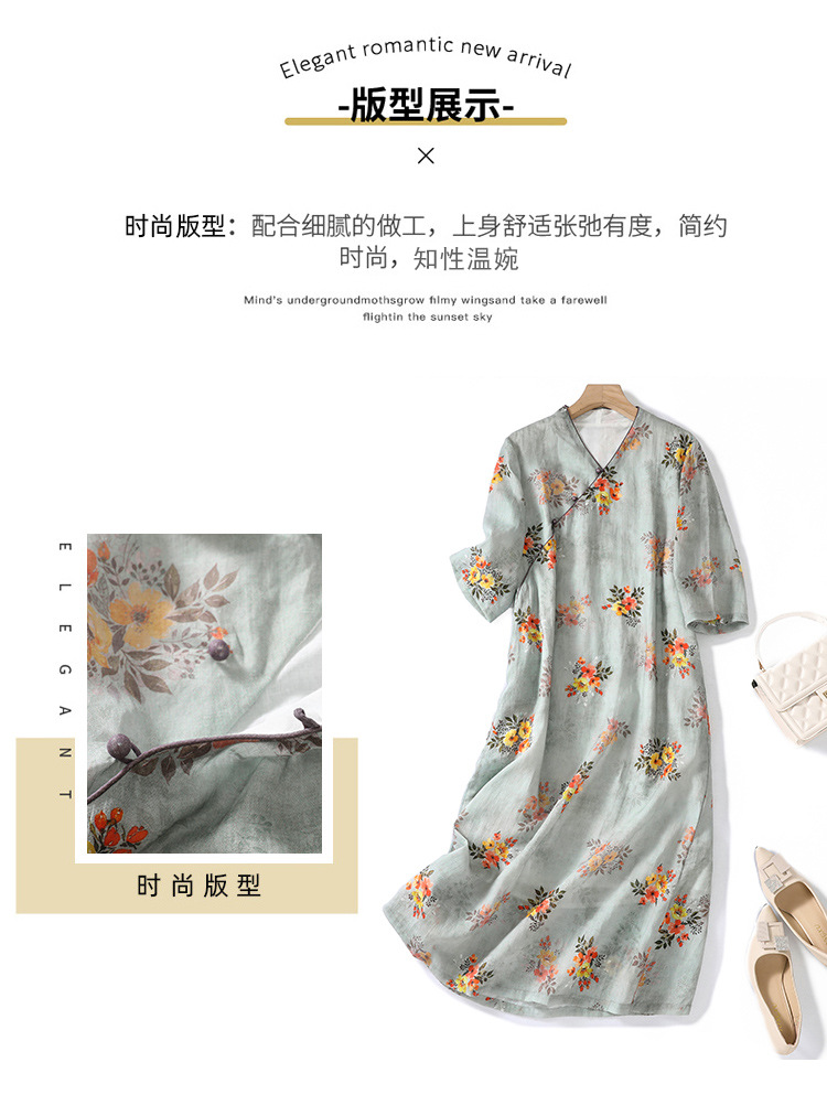 XYF-9083 2023春夏新款复古花色棉麻v领宽松显瘦遮肉中长款短袖连衣裙女