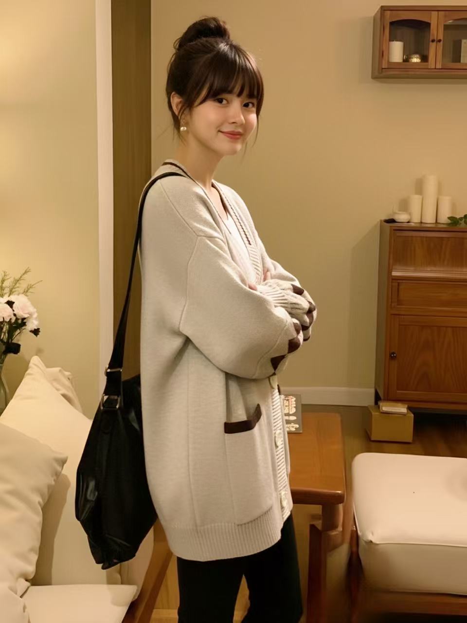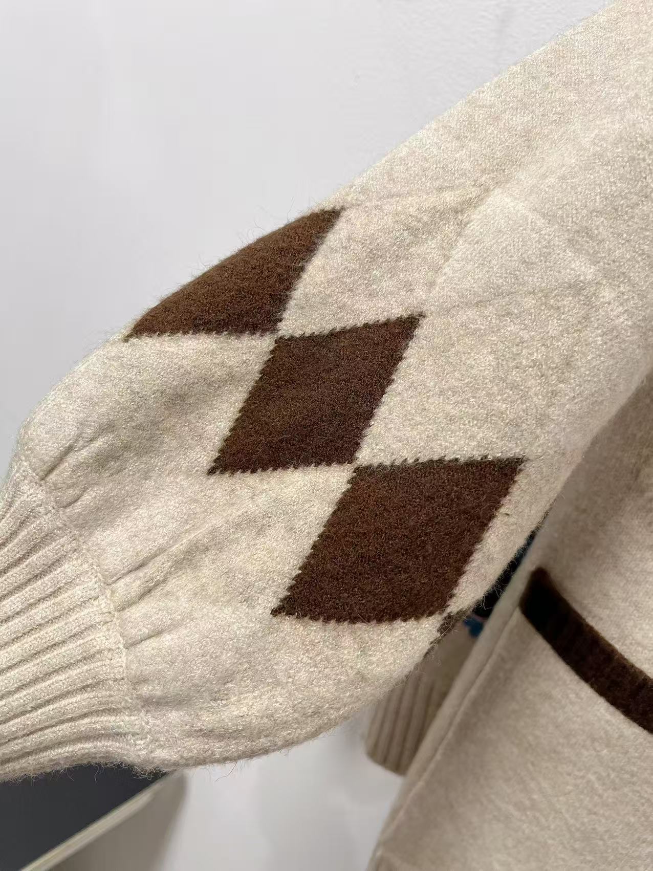 【韩系毛衣】中长菱形格针织中款开衫毛衣-喜出
