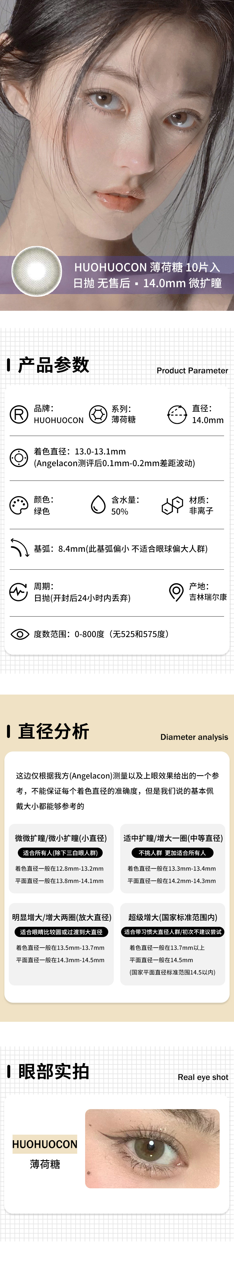 HUOHUOCON / 薄荷糖 / 美瞳日抛 /10片入 / 无售后 / 14.0mm / 微扩瞳清新绿色