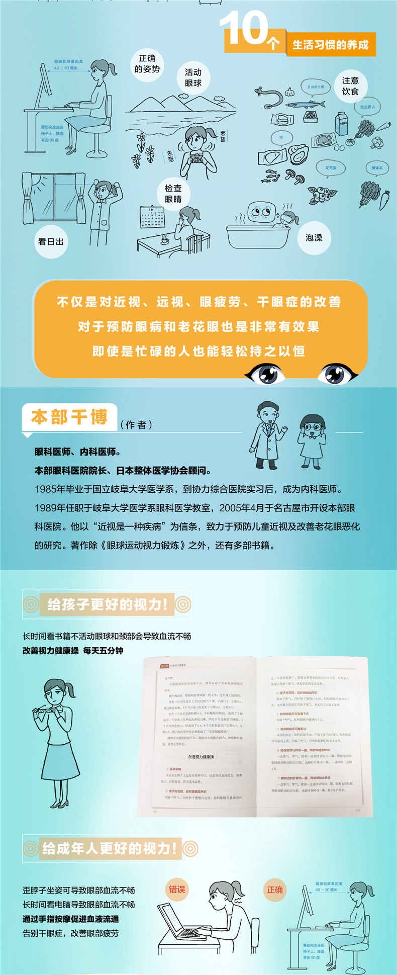 本部千博 眼科医师、内科医师。本部眼科医院院长、日本整体医学协会顾问。1985年毕业于国立岐阜大学医学系,到协力综合医院实习后,成为内科医师。1989年任职于岐阜大学医学系眼科医学教室,2005年4月于名古屋市开设本部眼科医院。他以“近视是一种疾病”为信条,致力于预防儿童近视及改善老花眼恶化的研究。著作除《眼球运动视力锻炼》之外,还有多部书籍。