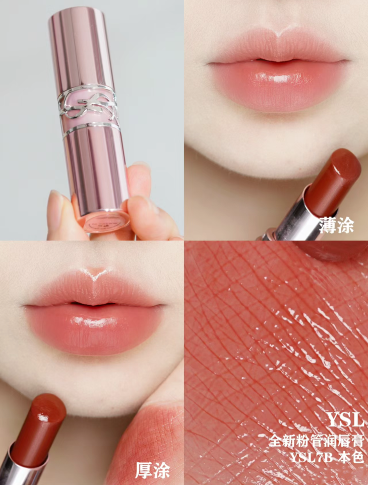 👑YSL 圣罗兰粉圆管口红 #7B 💎#7B:本色 🔥低饱和裸感杏仁冰咖,上唇就显气色很好 🔅98%天然成分,敏感唇可用 💥24小时长效保湿,平滑唇纹 ✨全粉色管身,高级优雅 💯新品:质地超级水润清透,触唇既融一点不夸张 💫上嘴有种又薄又透的原生感,水波一样的素唇光泽