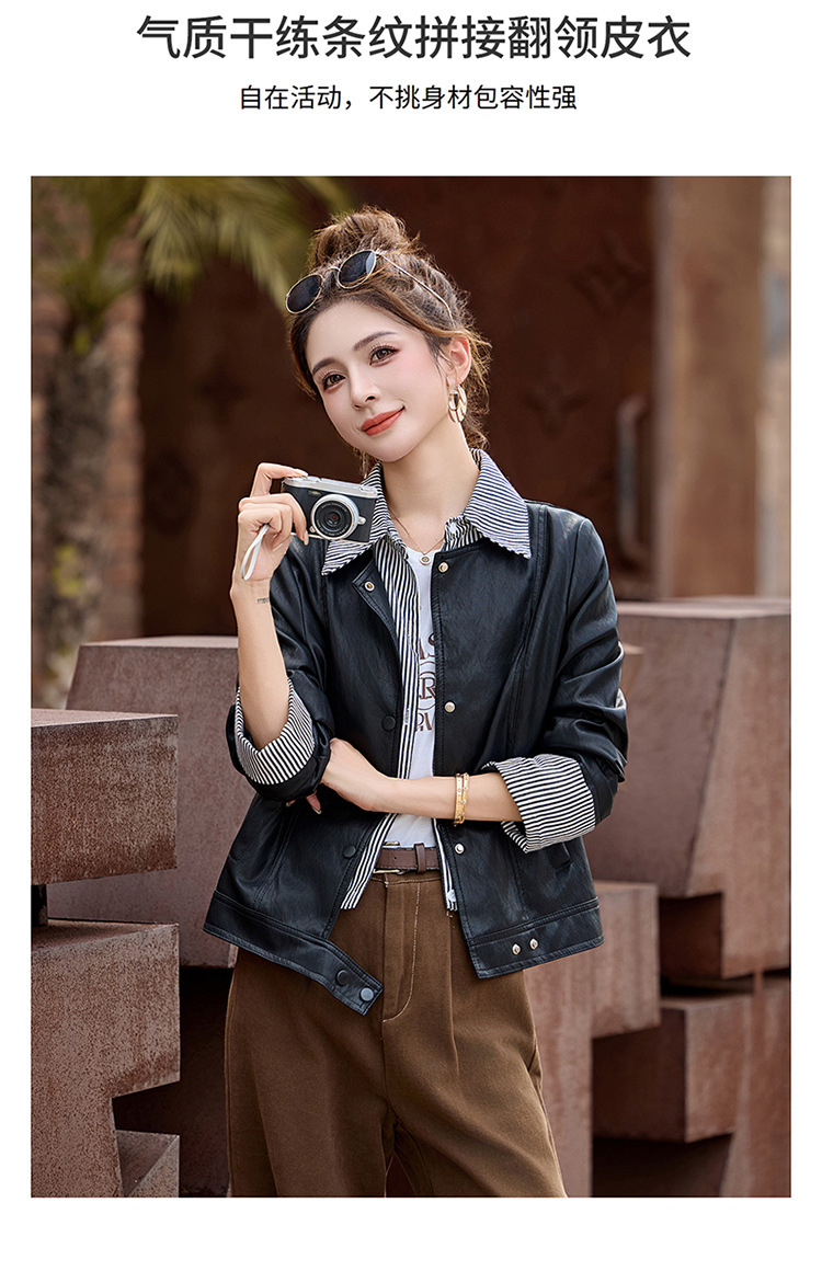假两件皮衣外套女2025秋季新款设计感拼接气质条纹皮夹克上衣 商品图2