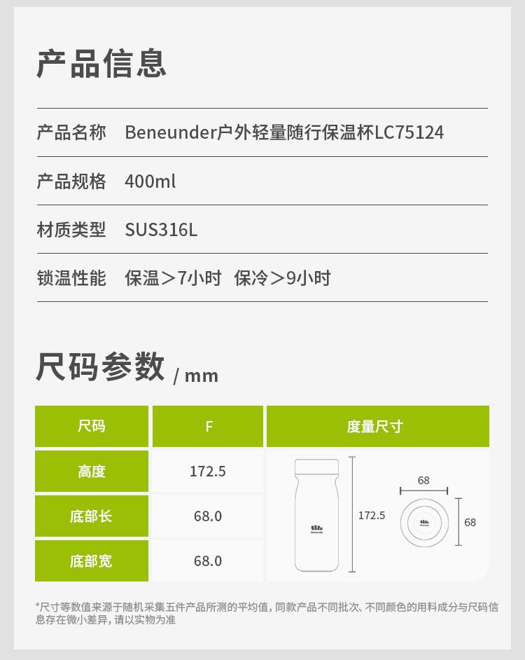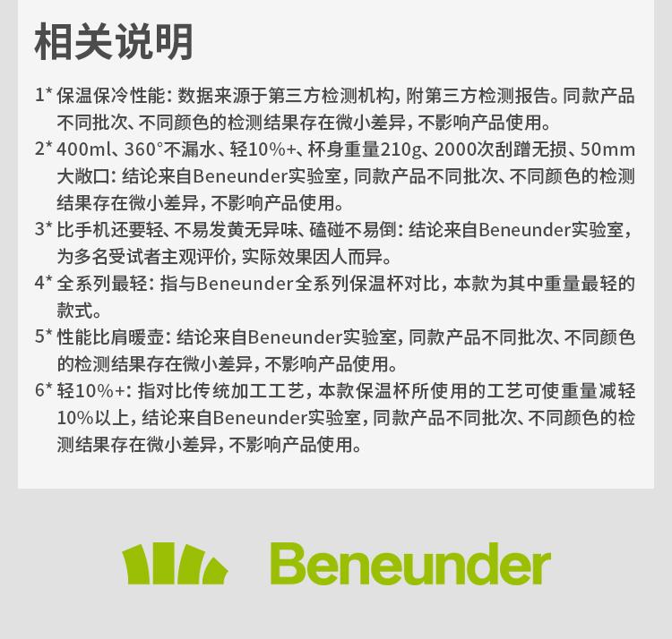 Beneunder新款户外轻量随行保温杯400ml便携大容量简约LC75124GF(货号:LC75124)