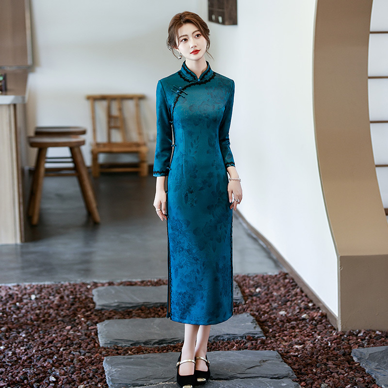 SC22059蓝色2025新款长款复合修身宴会气质年轻复古旗袍 商品图1