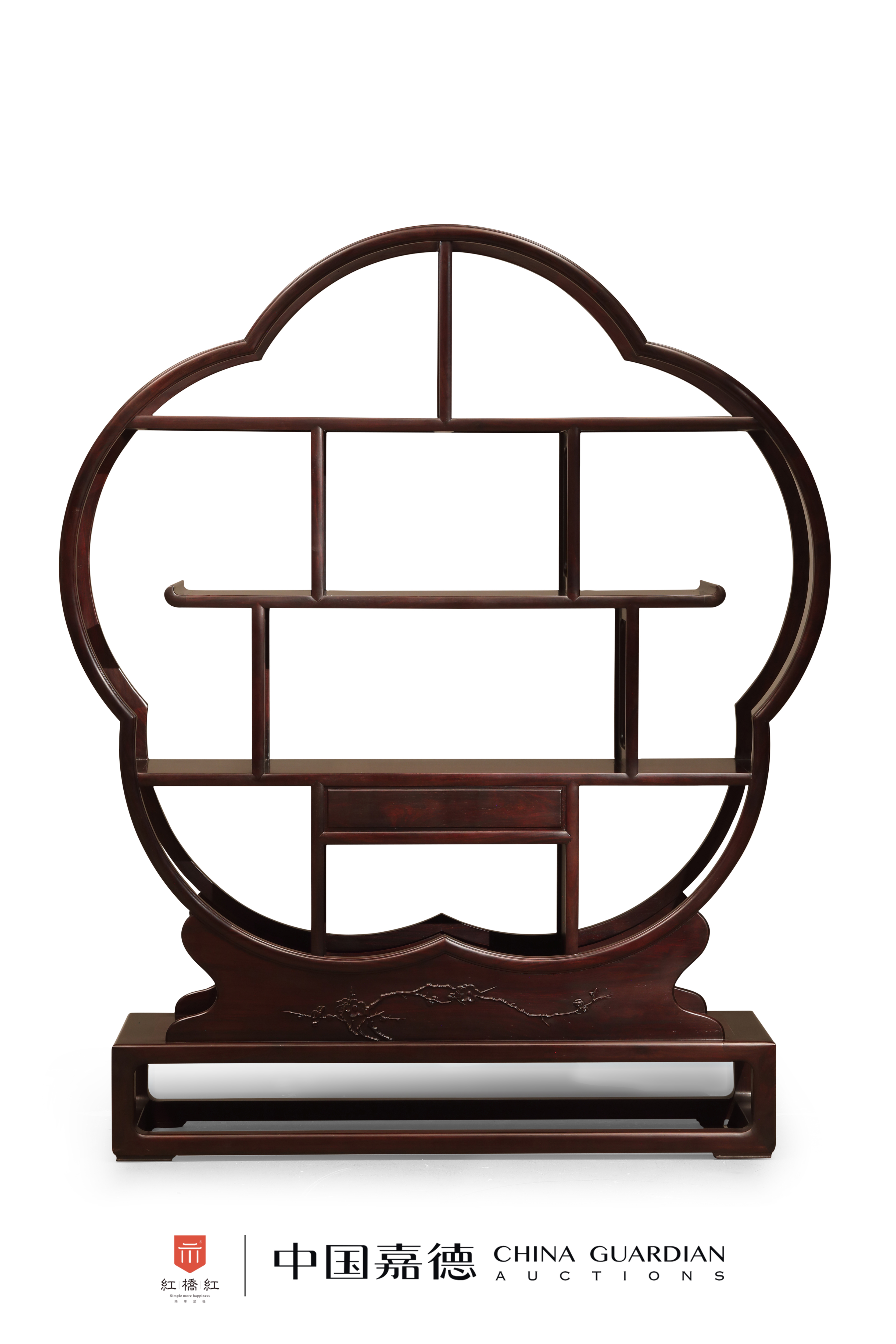 博古架梅花形,寓意花开富贵。采用赞比亚紫檀制作,色泽沉穆,木纹自然。主体为五瓣梅花形的架构,其内先以长短不一的横竖枨间隔三层,可陈设茶道具等,错落有致,随心意灵活摆放;在最后一层屉板下又安支架,装一具长抽屉,起到收纳的作用,安铜拉环,使用便利。每个空间的隔板皆为长方券口,光素无饰。架格底部安前后双层板座,其上浮雕折枝梅花纹,与整体装饰语言和谐统一,且为双面雕工。整器底部又设长方形箱式墩座,结构合理,更为稳固。