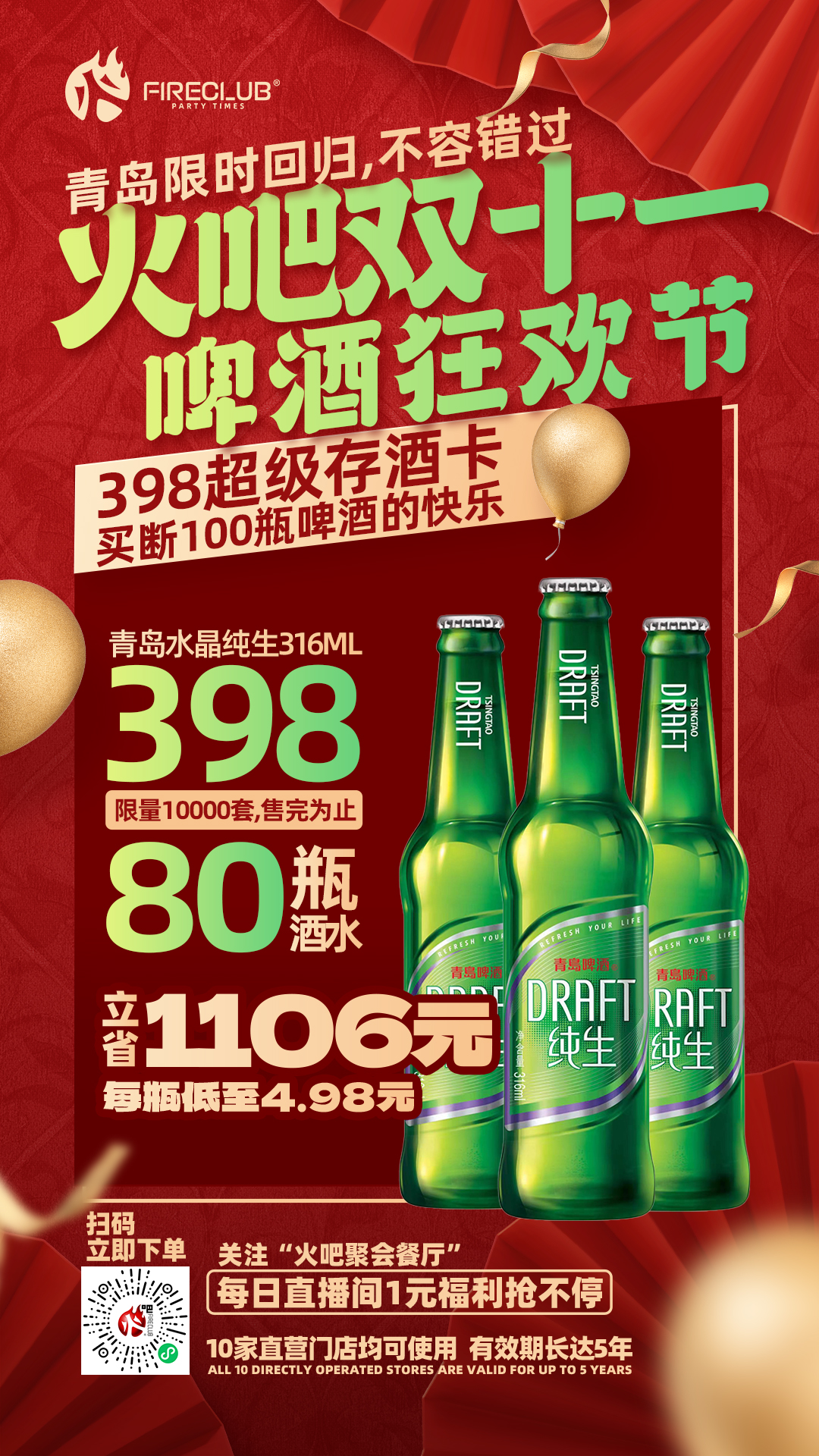 【兰州通用】双11火吧啤酒节—超值存酒卡—398元80瓶青岛水晶纯生316ml