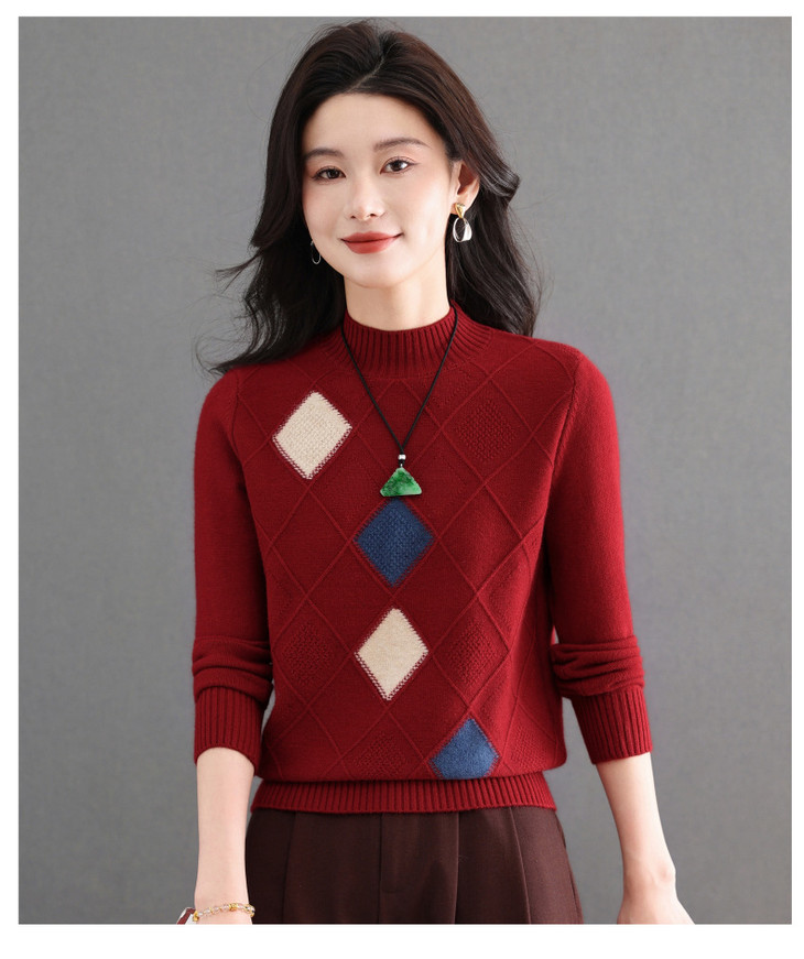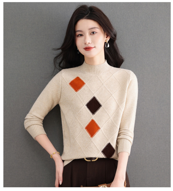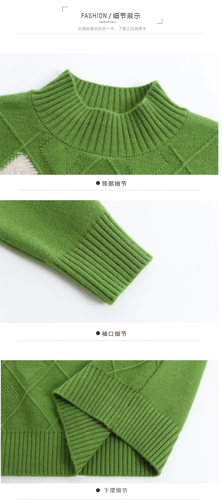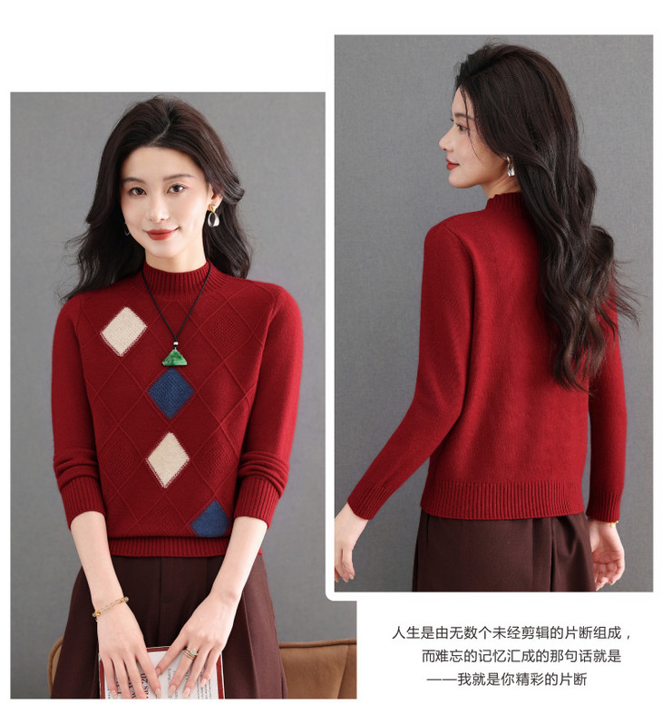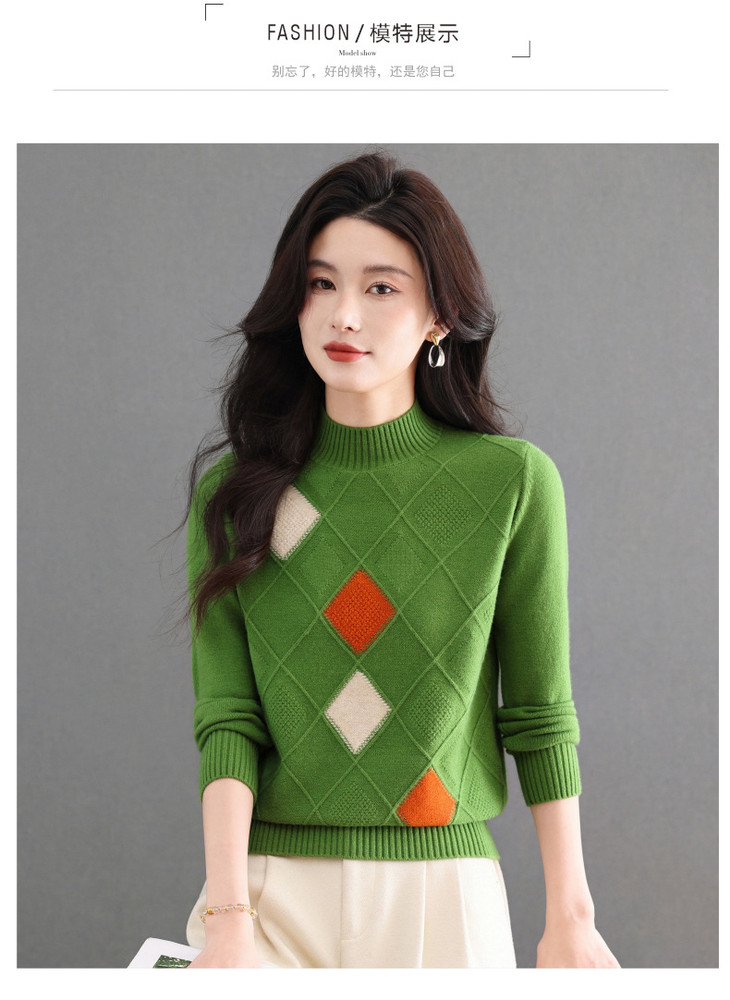 半高领毛衣女士宽松针织上衣,拼色洋气格子显瘦内搭打底衫CC-103-97875
