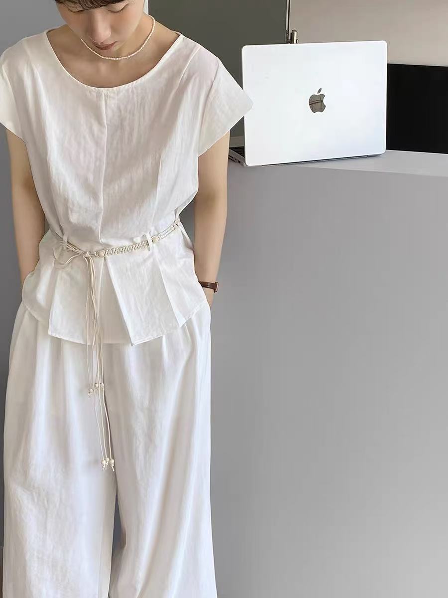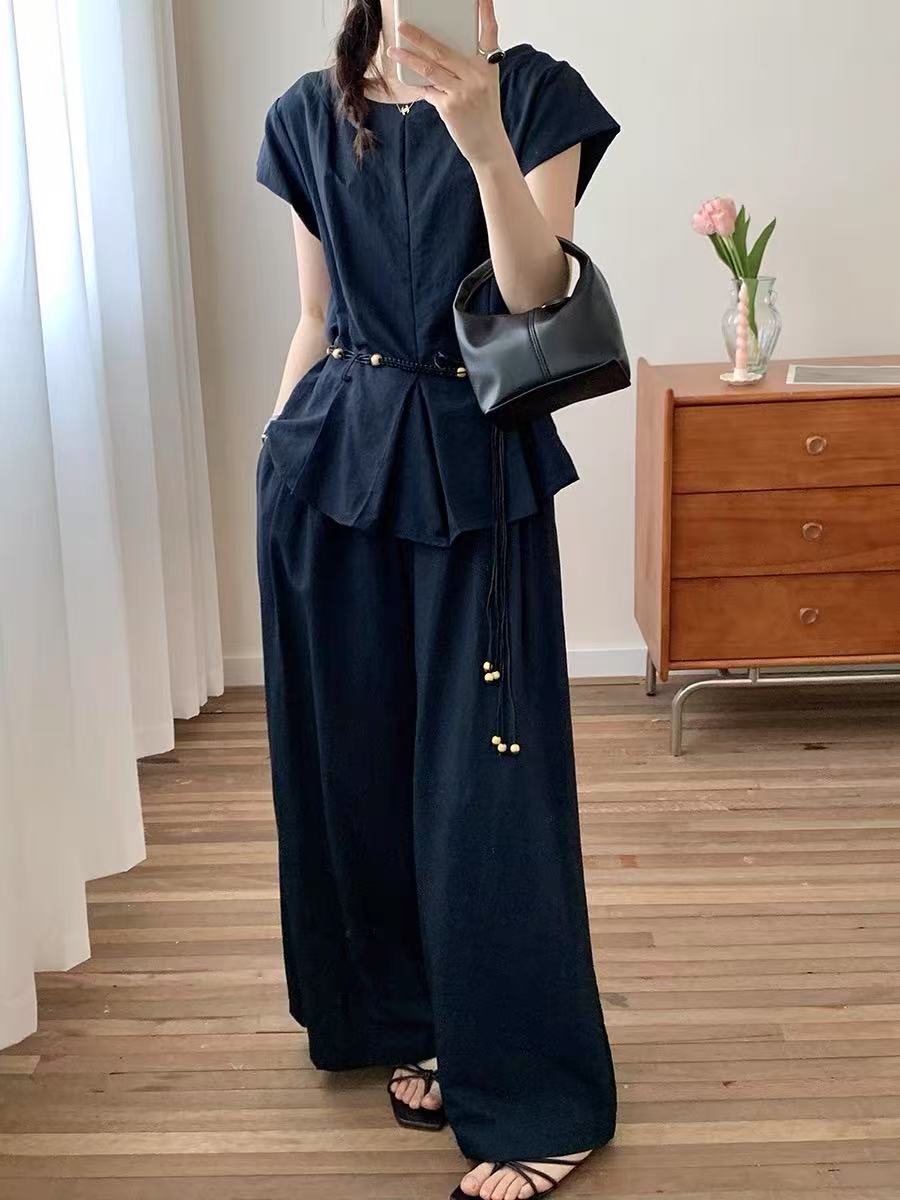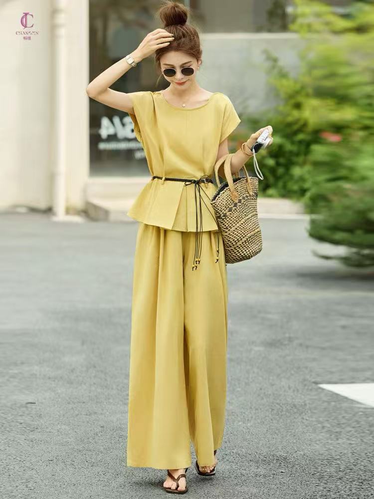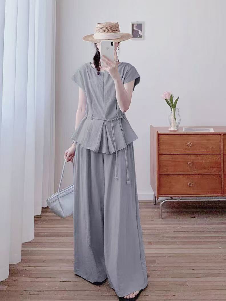 套装【韩系2025】2535棉麻飞飞袖上衣➕阔腿裤两件套-喜出