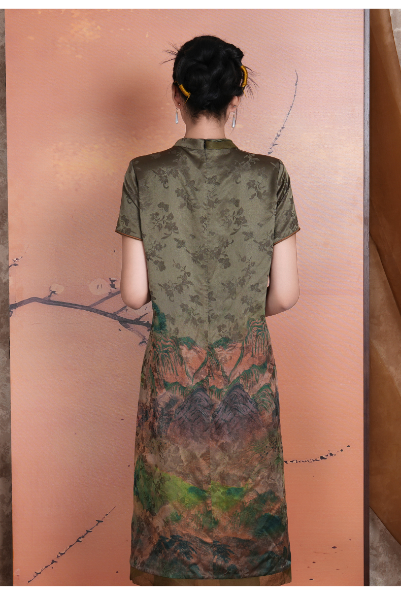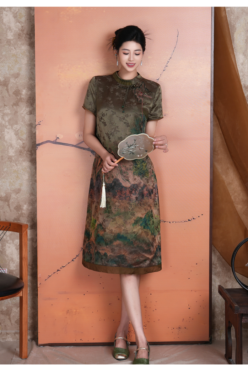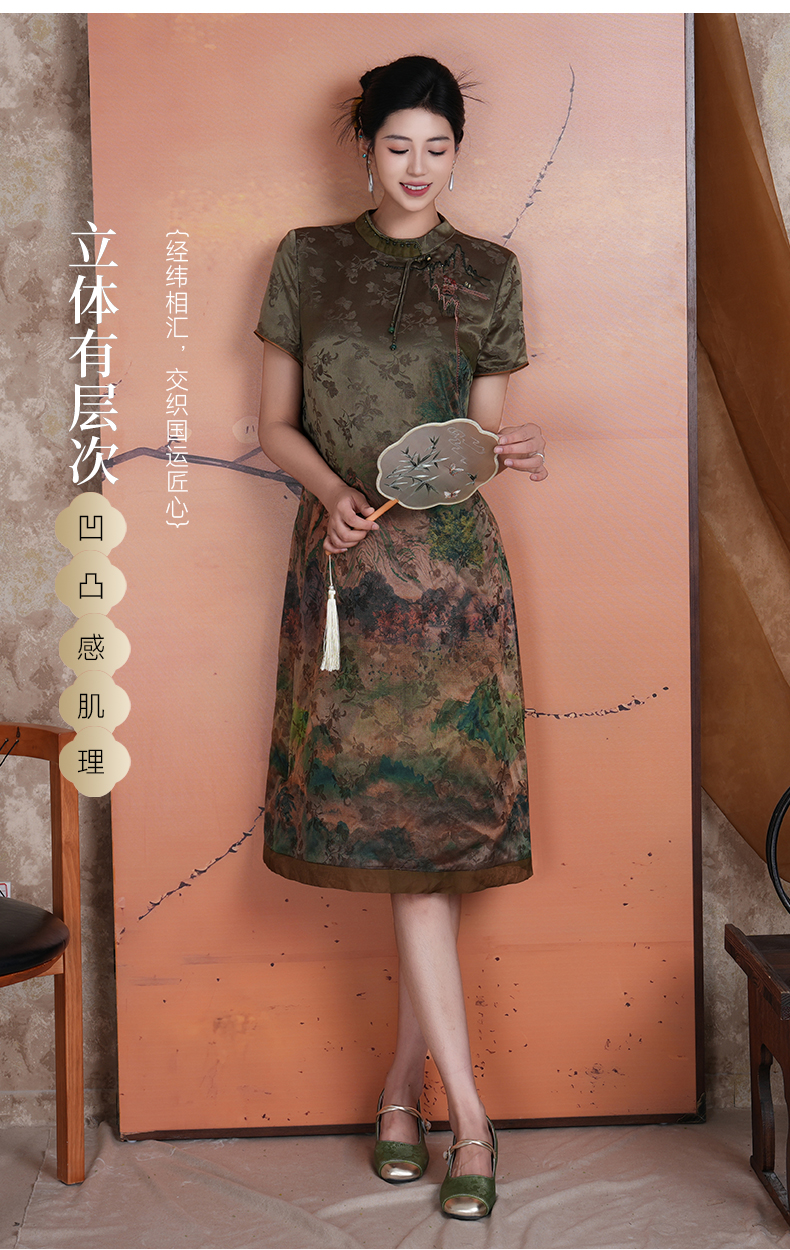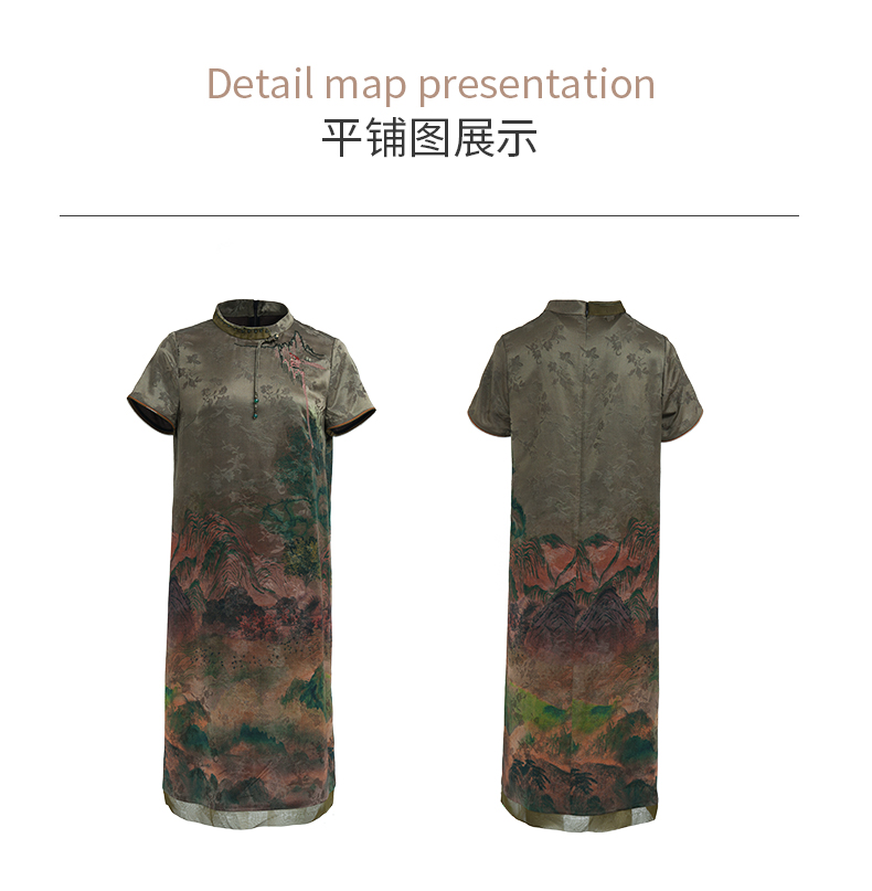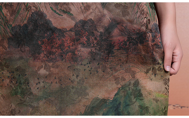 乔万尼新中式浮世绘山河图宽松立领盘扣真丝连衣裙ED2E545