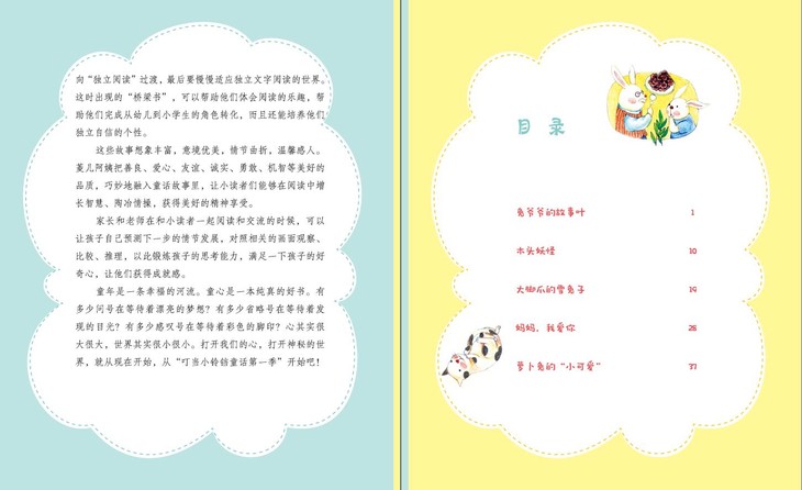 “叮当小铃铛童话第一季”是一套励志童话书,也是一套儿童由看图画过渡到读文字的桥梁书。书中以小朋友们喜爱的动物呼噜猫、萝卜兔、米喜熊、小福象为主人公,写了涉及儿童成长各个方面的故事,将善良、爱心、友谊、诚实、勇敢、机智、分享等美好品质巧妙地融合进童话故事里,让小读者们能够在阅读中增长智慧,增强信心、敢于自我肯定、勇于战胜困难。 书中插图色彩明亮,形象可爱,再加上注音,是专为学龄前儿童和小学一、二年级学生设计的。每个故事后设有“悄悄话板块”,起到画龙点睛的作用,引导小读者对本篇故事的主题进行思考和领悟,也特别适合父母和孩子亲子阅读时引发讨论话题,起到抛砖引玉的作用。